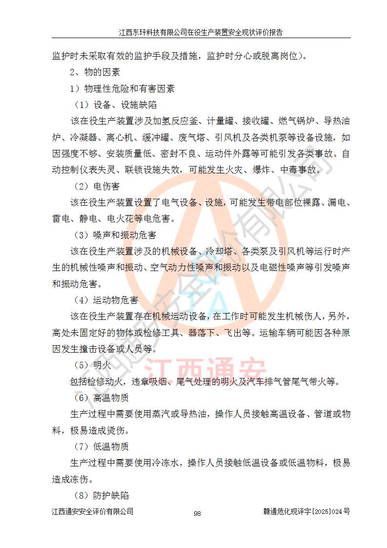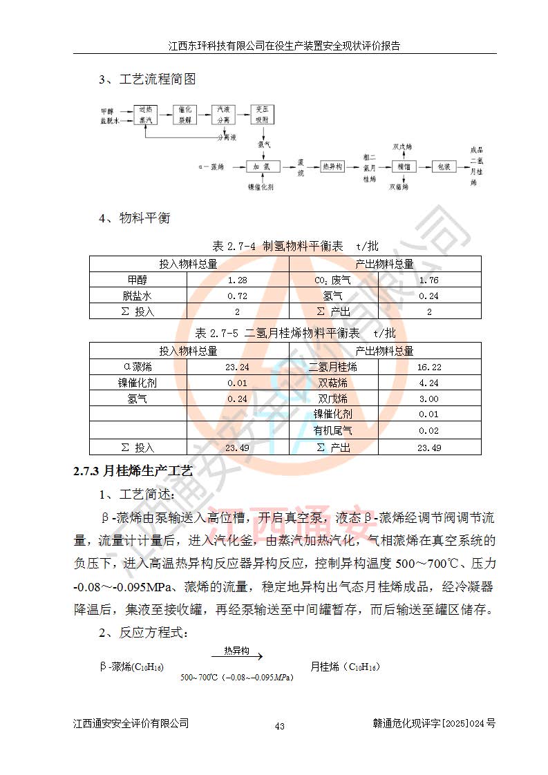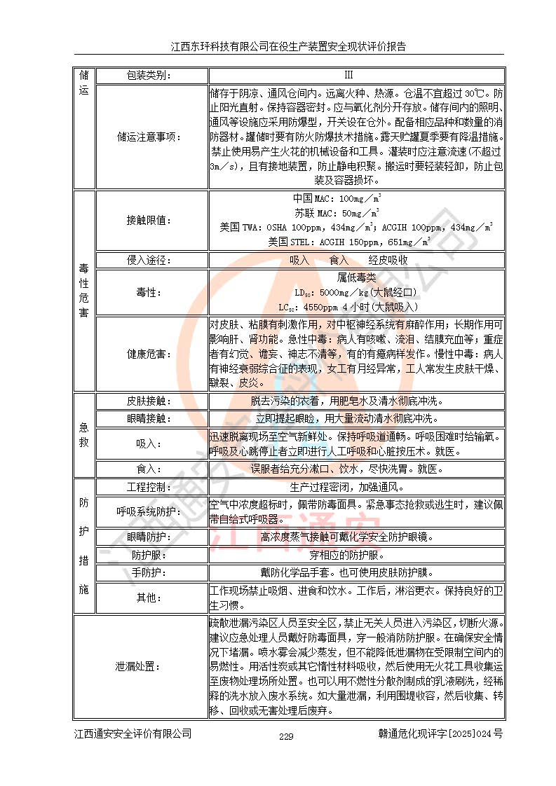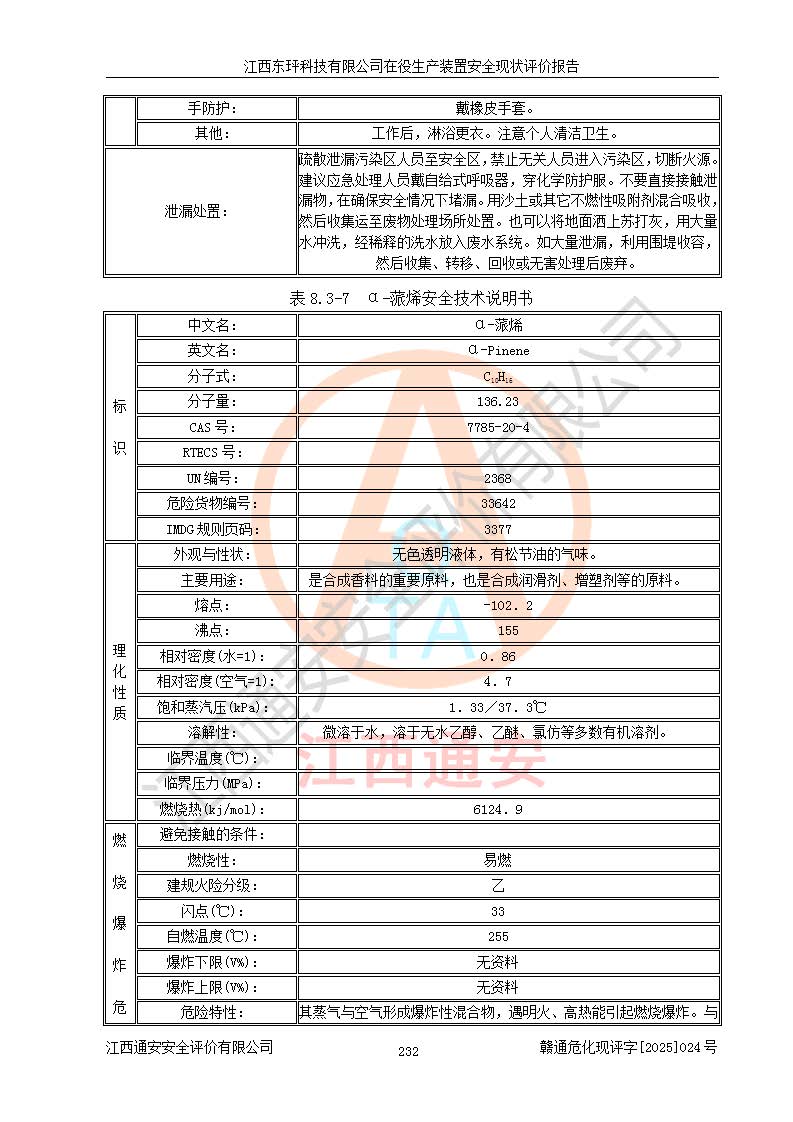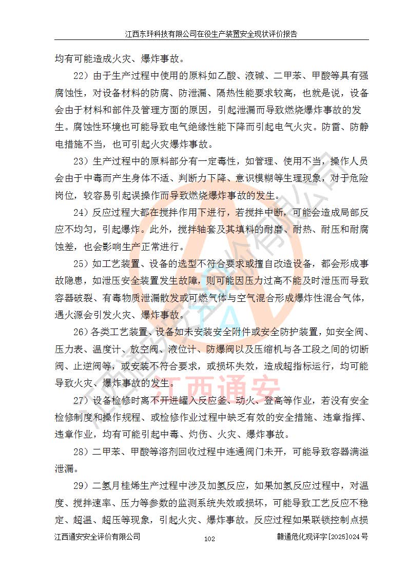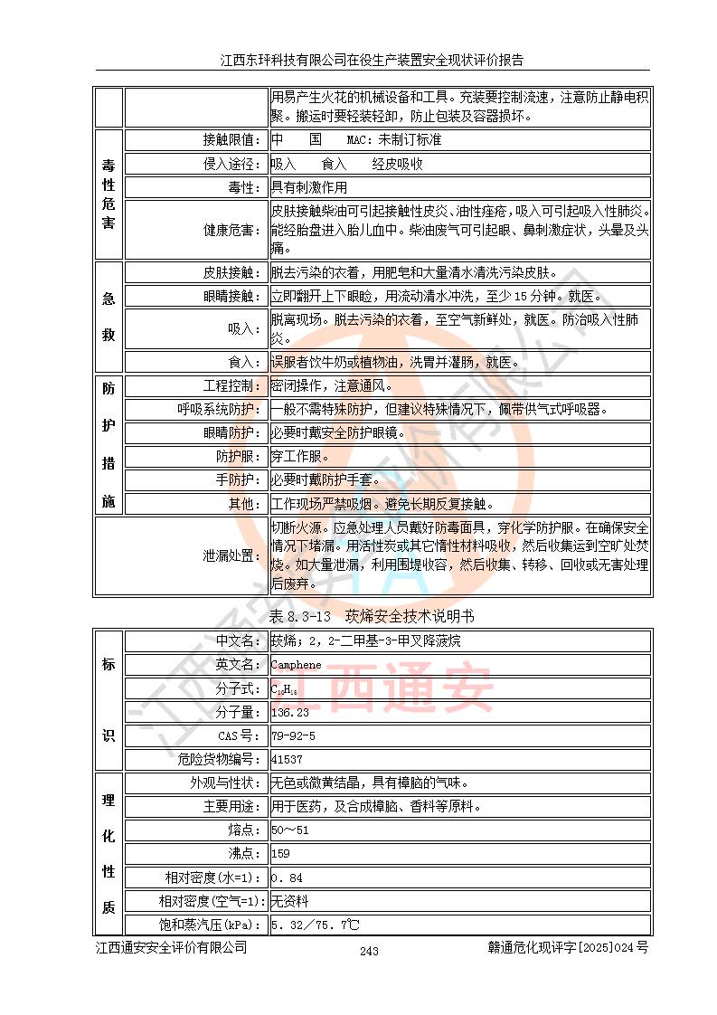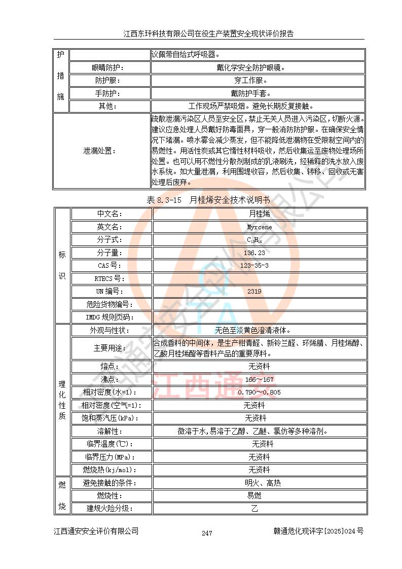 江西东玶科技有限公司位于江西省吉安市吉水县城西工业园区,法定**人为徐东,成立于2018年04月08日,注册资本叁仟贰佰叁拾万元整,经营范围为合成樟脑、α-蒎烯、β-蒎烯、二氢月桂烯(含月桂烯)、莰烯、双戊烯、氢气(中间产品)的制造加工(凭**批准证书经营);白乙酯、双萜烯等合成香料的制造加工等。 江西东玶科技有限公司2022年08月01日取得了《安全生产许可证》,许可证编号:(赣)WH安许证字[2022]1160号,许可范围为合成樟脑(2000t/a)、二氢月桂烯(1000t/a)、月桂烯(3200t/a)、莰烯(1000t/a)、双戊烯(810t/a)、双萜烯(1070t/a)、α-蒎烯(7500t/a)、β-蒎烯(3200t/a)、白乙酯(500t/a),**期为2022年08月01日至2025年07月31日。该公司2023年5月29日取得了三级安全生产标准化证书,证书编号:赣AQBWHⅢ202300036,**期至2026年5月。该公司现有员工53人,其中专职安全生产管理人员2人。 因生产经营需要,江西东玶科技有限公司实施了年产12000吨松节油深加工系列产品项目(二期),并将二氢月桂烯的设计生产规模2000t/a变更为1500t/a,减少中间产品蒎烷的消耗量,剩余的蒎烷(720t/a)作为产品销售。江西东玶科技有限公司委托深圳天阳工程设计有限公司进行了设计变更,按程序要求进行了试生产,委托评价公司编制了安全验收评价报告,并于2025年1月16日组织专家组和相关单位进行了验收。验收完成后,江西东玶科技有限公司2025年06月04日对《安全生产许可证》进行了变更,许可范围变更为合成樟脑(2000t/a)、二氢月桂烯(1500t/a)、月桂烯(3200t/a)、莰烯(1000t/a)、双戊烯(902.5t/a)、双萜烯(1200.7t/a)、α-蒎烯(7500t/a)、β-蒎烯(3200t/a)、白乙酯(500t/a)、蒎烷(中间产品,720t/a)。 江西东玶科技有限公司在役生产装置生产过程中涉及的主要原辅材料为松节油、乙酸、液碱、甲醇、碳酸钠、二甲苯、偏钛酸、甲酸、硫酸铜、雷尼镍、离子膜、天然气、氮气,中间产品为氢气、α-蒎烯、β-蒎烯、蒎烷,产品为合成樟脑、二氢月桂烯、月桂烯、莰烯、双戊烯、白乙酯、双萜烯,副产品为醋酸钠。根据《危险化学品目录》,该在役生产装置涉及的松节油、乙酸、液碱、甲醇、二甲苯、甲酸、雷尼镍、天然气(燃料)、氮气(压缩的)、柴油,中间产品α-蒎烯、β-蒎烯、氢气、蒎烷和产品中合成樟脑、二氢月桂烯、月桂烯、莰烯、双戊烯属于危险化学品。经辨识,甲醇、氢气和天然气(燃料)属于重点监管的危险化学品,甲醇属于特别管控的危险化学品,不涉及监控化学品、易制毒化学品、易制爆危险化学品、剧毒化学品和高毒物品,生产、储存单元不构成危险化学品重大危险源,涉及的加氢工艺属于重点监管的危险化工工艺。根据生产工艺特点及物料的理化特性可知,该在役生产装置生产过程中存在火灾与爆炸、中毒与窒息、触电、机械伤害、灼烫等危险有害因素。 该公司自2022年08月01日取得安全生产许可证以来,生产运行正常,未发生一般及以上生产安全事故。 |