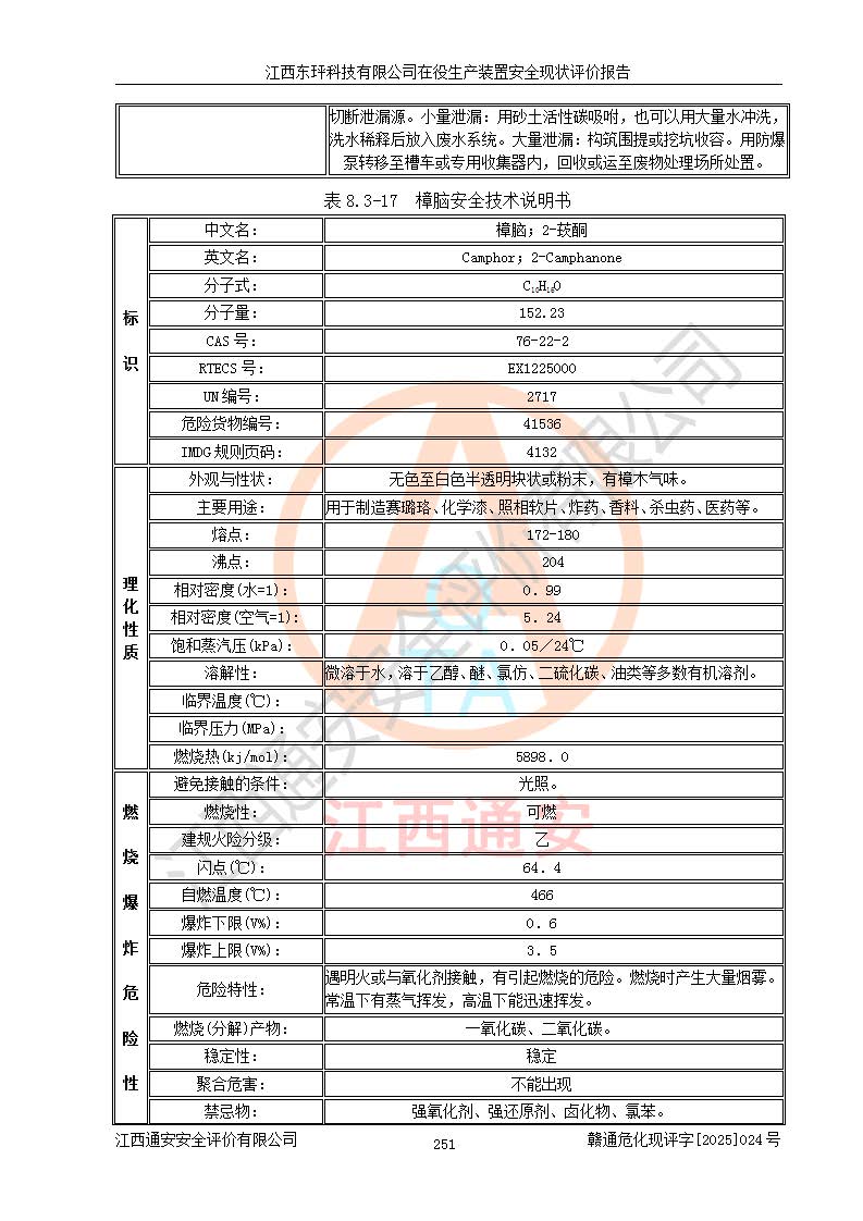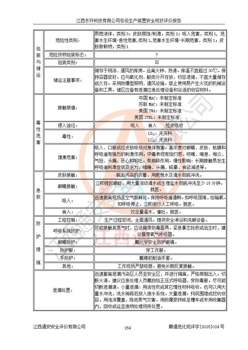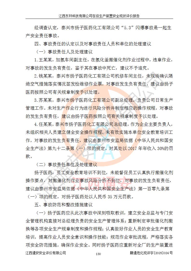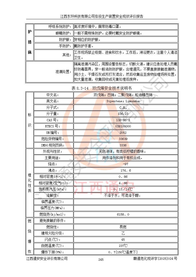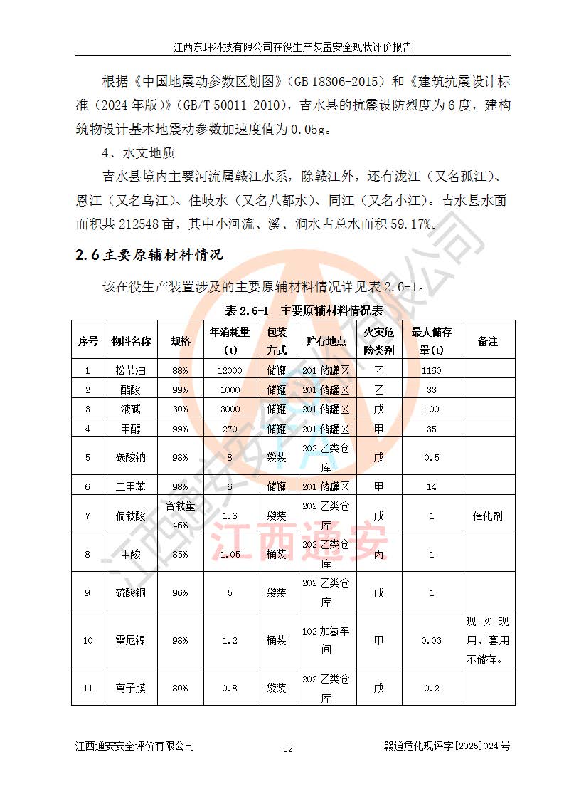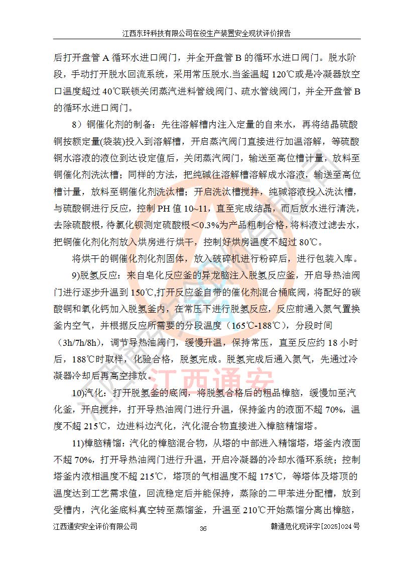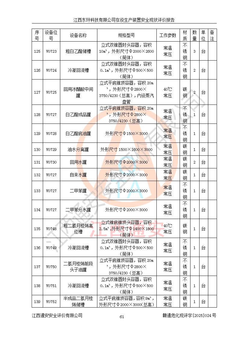 江西东玶科技有限公司位于江西省吉安市吉水县城西工业园区,法定**人为徐东,成立于2018年04月08日,注册资本叁仟贰佰叁拾万元整,经营范围为合成樟脑、α-蒎烯、β-蒎烯、二氢月桂烯(含月桂烯)、莰烯、双戊烯、氢气(中间产品)的制造加工(凭**批准证书经营);白乙酯、双萜烯等合成香料的制造加工等。 江西东玶科技有限公司2022年08月01日取得了《安全生产许可证》,许可证编号:(赣)WH安许证字[2022]1160号,许可范围为合成樟脑(2000t/a)、二氢月桂烯(1000t/a)、月桂烯(3200t/a)、莰烯(1000t/a)、双戊烯(810t/a)、双萜烯(1070t/a)、α-蒎烯(7500t/a)、β-蒎烯(3200t/a)、白乙酯(500t/a),**期为2022年08月01日至2025年07月31日。该公司2023年5月29日取得了三级安全生产标准化证书,证书编号:赣AQBWHⅢ202300036,**期至2026年5月。该公司现有员工53人,其中专职安全生产管理人员2人。 因生产经营需要,江西东玶科技有限公司实施了年产12000吨松节油深加工系列产品项目(二期),并将二氢月桂烯的设计生产规模2000t/a变更为1500t/a,减少中间产品蒎烷的消耗量,剩余的蒎烷(720t/a)作为产品销售。江西东玶科技有限公司委托深圳天阳工程设计有限公司进行了设计变更,按程序要求进行了试生产,委托评价公司编制了安全验收评价报告,并于2025年1月16日组织专家组和相关单位进行了验收。验收完成后,江西东玶科技有限公司2025年06月04日对《安全生产许可证》进行了变更,许可范围变更为合成樟脑(2000t/a)、二氢月桂烯(1500t/a)、月桂烯(3200t/a)、莰烯(1000t/a)、双戊烯(902.5t/a)、双萜烯(1200.7t/a)、α-蒎烯(7500t/a)、β-蒎烯(3200t/a)、白乙酯(500t/a)、蒎烷(中间产品,720t/a)。 江西东玶科技有限公司在役生产装置生产过程中涉及的主要原辅材料为松节油、乙酸、液碱、甲醇、碳酸钠、二甲苯、偏钛酸、甲酸、硫酸铜、雷尼镍、离子膜、天然气、氮气,中间产品为氢气、α-蒎烯、β-蒎烯、蒎烷,产品为合成樟脑、二氢月桂烯、月桂烯、莰烯、双戊烯、白乙酯、双萜烯,副产品为醋酸钠。根据《危险化学品目录》,该在役生产装置涉及的松节油、乙酸、液碱、甲醇、二甲苯、甲酸、雷尼镍、天然气(燃料)、氮气(压缩的)、柴油,中间产品α-蒎烯、β-蒎烯、氢气、蒎烷和产品中合成樟脑、二氢月桂烯、月桂烯、莰烯、双戊烯属于危险化学品。经辨识,甲醇、氢气和天然气(燃料)属于重点监管的危险化学品,甲醇属于特别管控的危险化学品,不涉及监控化学品、易制毒化学品、易制爆危险化学品、剧毒化学品和高毒物品,生产、储存单元不构成危险化学品重大危险源,涉及的加氢工艺属于重点监管的危险化工工艺。根据生产工艺特点及物料的理化特性可知,该在役生产装置生产过程中存在火灾与爆炸、中毒与窒息、触电、机械伤害、灼烫等危险有害因素。 该公司自2022年08月01日取得安全生产许可证以来,生产运行正常,未发生一般及以上生产安全事故。 |