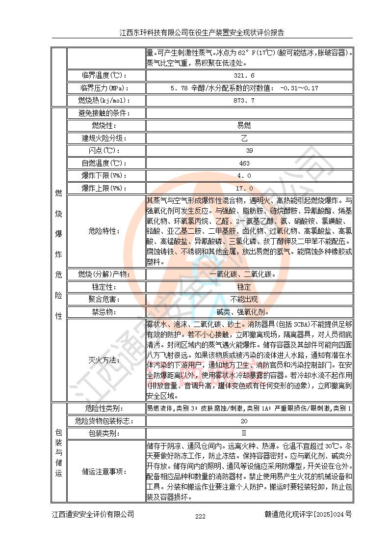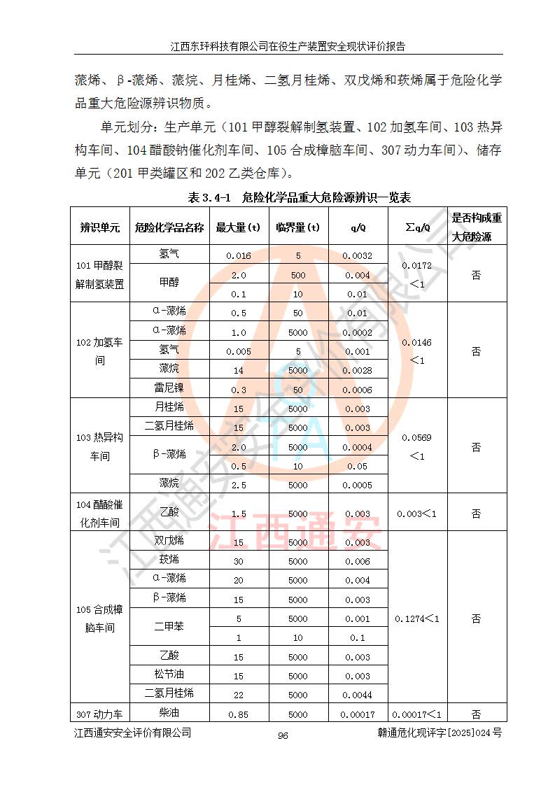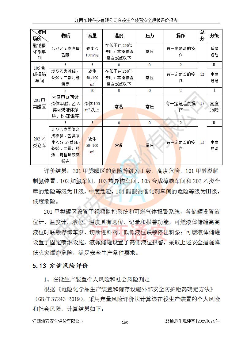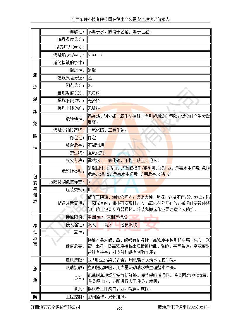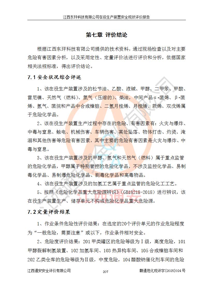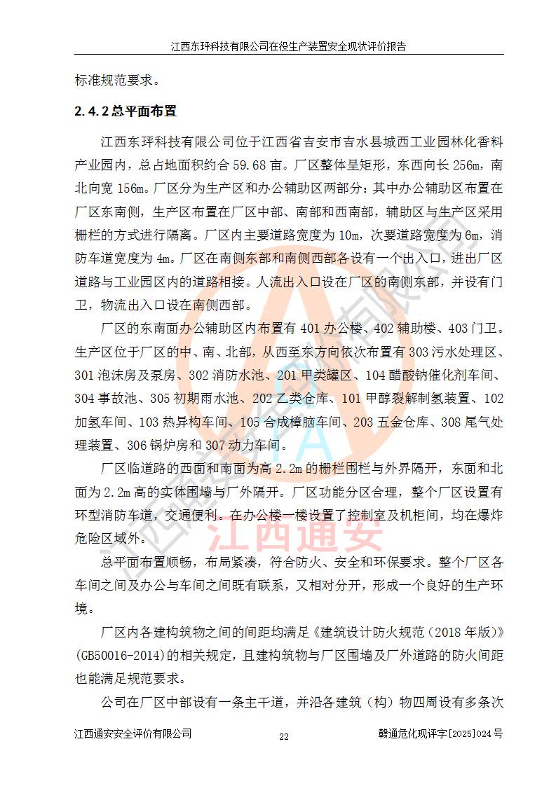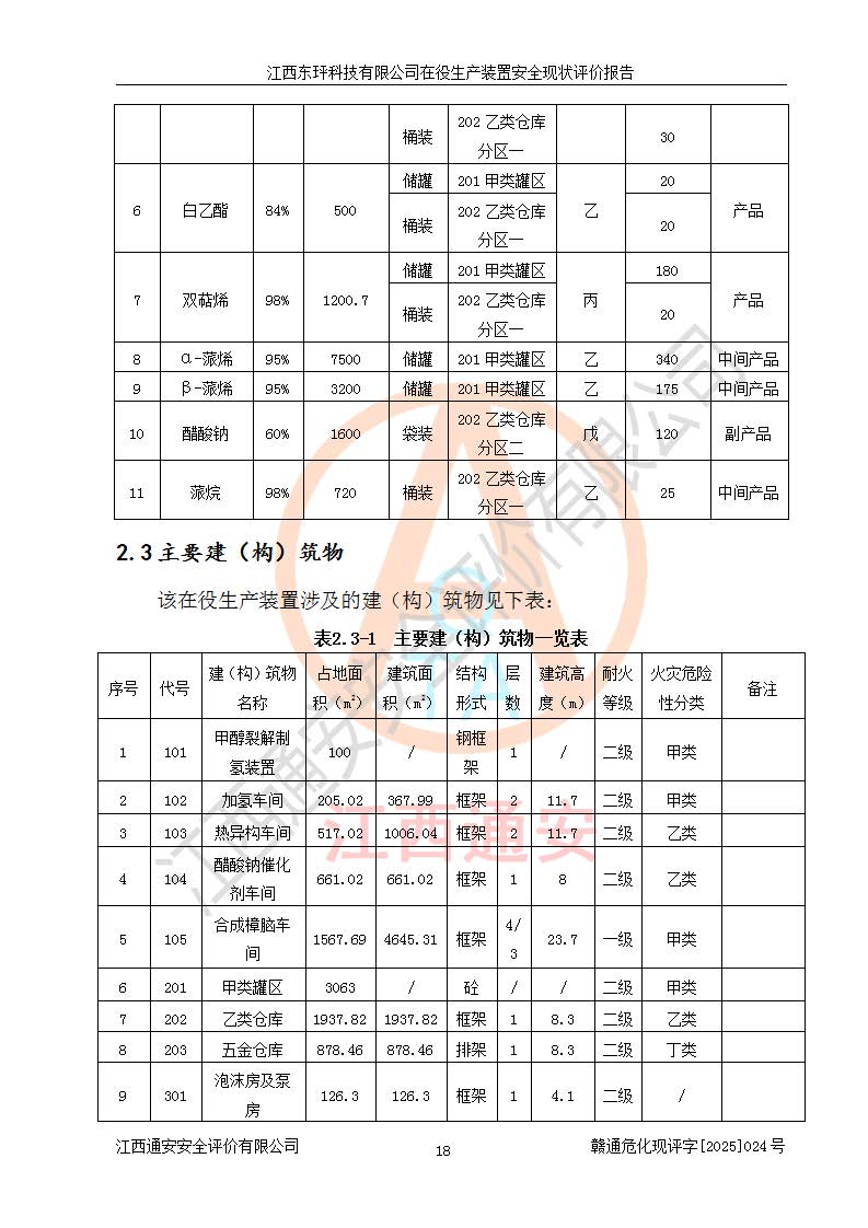 江西东玶科技有限公司位于江西省吉安市吉水县城西工业园区,法定**人为徐东,成立于2018年04月08日,注册资本叁仟贰佰叁拾万元整,经营范围为合成樟脑、α-蒎烯、β-蒎烯、二氢月桂烯(含月桂烯)、莰烯、双戊烯、氢气(中间产品)的制造加工(凭**批准证书经营);白乙酯、双萜烯等合成香料的制造加工等。 江西东玶科技有限公司2022年08月01日取得了《安全生产许可证》,许可证编号:(赣)WH安许证字[2022]1160号,许可范围为合成樟脑(2000t/a)、二氢月桂烯(1000t/a)、月桂烯(3200t/a)、莰烯(1000t/a)、双戊烯(810t/a)、双萜烯(1070t/a)、α-蒎烯(7500t/a)、β-蒎烯(3200t/a)、白乙酯(500t/a),**期为2022年08月01日至2025年07月31日。该公司2023年5月29日取得了三级安全生产标准化证书,证书编号:赣AQBWHⅢ202300036,**期至2026年5月。该公司现有员工53人,其中专职安全生产管理人员2人。 因生产经营需要,江西东玶科技有限公司实施了年产12000吨松节油深加工系列产品项目(二期),并将二氢月桂烯的设计生产规模2000t/a变更为1500t/a,减少中间产品蒎烷的消耗量,剩余的蒎烷(720t/a)作为产品销售。江西东玶科技有限公司委托深圳天阳工程设计有限公司进行了设计变更,按程序要求进行了试生产,委托评价公司编制了安全验收评价报告,并于2025年1月16日组织专家组和相关单位进行了验收。验收完成后,江西东玶科技有限公司2025年06月04日对《安全生产许可证》进行了变更,许可范围变更为合成樟脑(2000t/a)、二氢月桂烯(1500t/a)、月桂烯(3200t/a)、莰烯(1000t/a)、双戊烯(902.5t/a)、双萜烯(1200.7t/a)、α-蒎烯(7500t/a)、β-蒎烯(3200t/a)、白乙酯(500t/a)、蒎烷(中间产品,720t/a)。 江西东玶科技有限公司在役生产装置生产过程中涉及的主要原辅材料为松节油、乙酸、液碱、甲醇、碳酸钠、二甲苯、偏钛酸、甲酸、硫酸铜、雷尼镍、离子膜、天然气、氮气,中间产品为氢气、α-蒎烯、β-蒎烯、蒎烷,产品为合成樟脑、二氢月桂烯、月桂烯、莰烯、双戊烯、白乙酯、双萜烯,副产品为醋酸钠。根据《危险化学品目录》,该在役生产装置涉及的松节油、乙酸、液碱、甲醇、二甲苯、甲酸、雷尼镍、天然气(燃料)、氮气(压缩的)、柴油,中间产品α-蒎烯、β-蒎烯、氢气、蒎烷和产品中合成樟脑、二氢月桂烯、月桂烯、莰烯、双戊烯属于危险化学品。经辨识,甲醇、氢气和天然气(燃料)属于重点监管的危险化学品,甲醇属于特别管控的危险化学品,不涉及监控化学品、易制毒化学品、易制爆危险化学品、剧毒化学品和高毒物品,生产、储存单元不构成危险化学品重大危险源,涉及的加氢工艺属于重点监管的危险化工工艺。根据生产工艺特点及物料的理化特性可知,该在役生产装置生产过程中存在火灾与爆炸、中毒与窒息、触电、机械伤害、灼烫等危险有害因素。 该公司自2022年08月01日取得安全生产许可证以来,生产运行正常,未发生一般及以上生产安全事故。 |