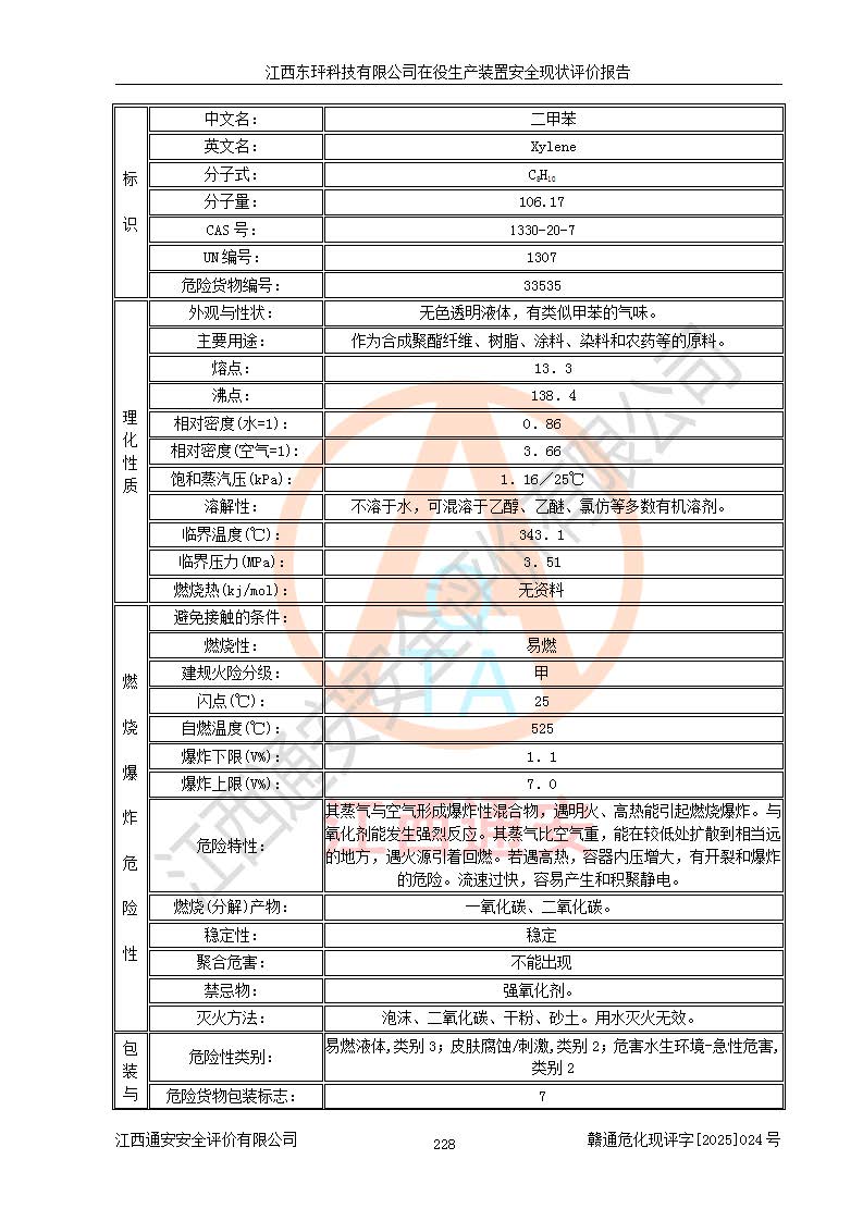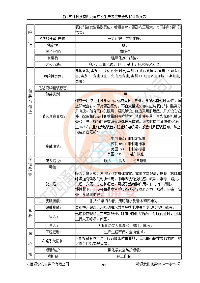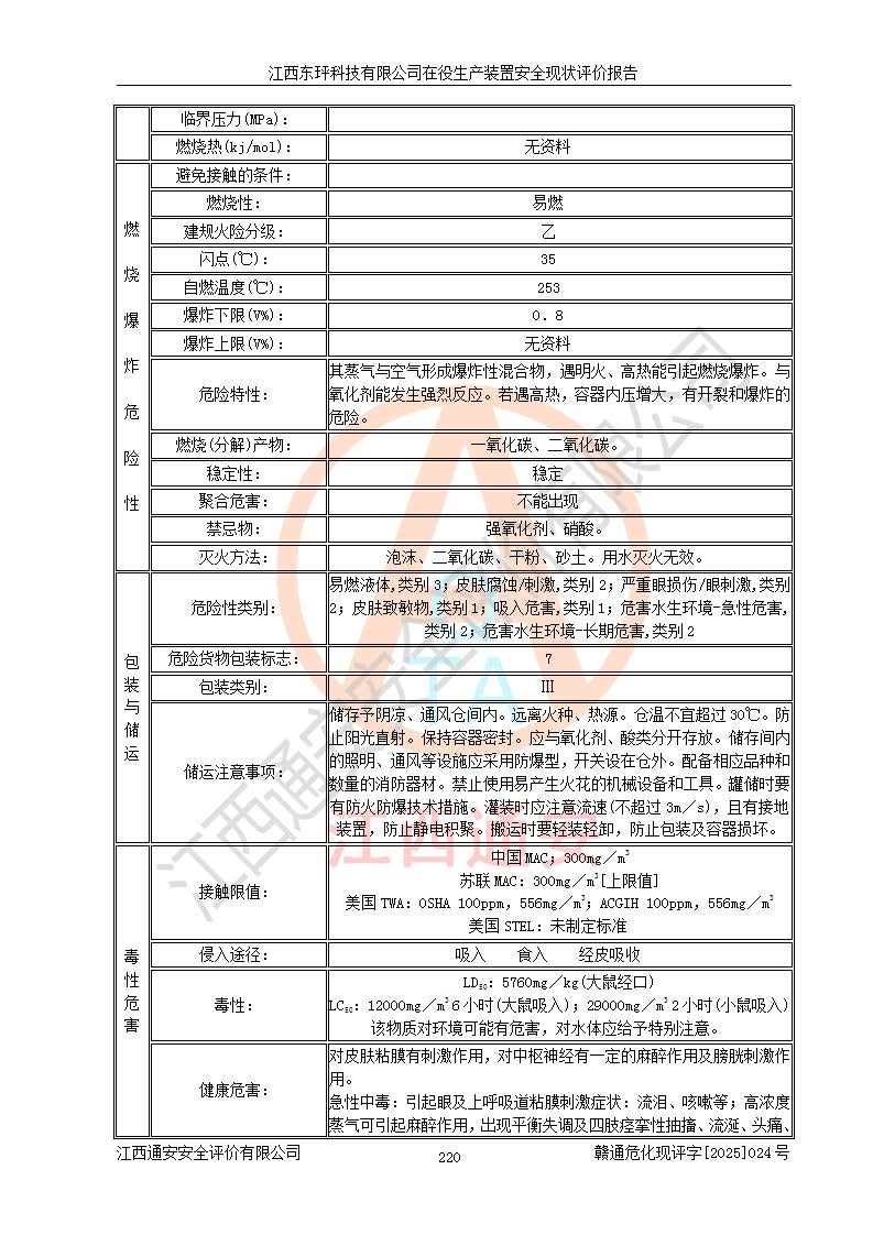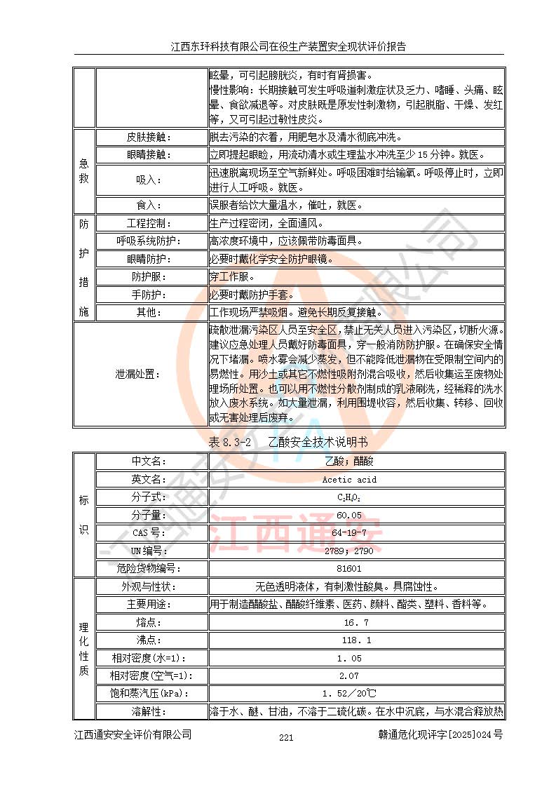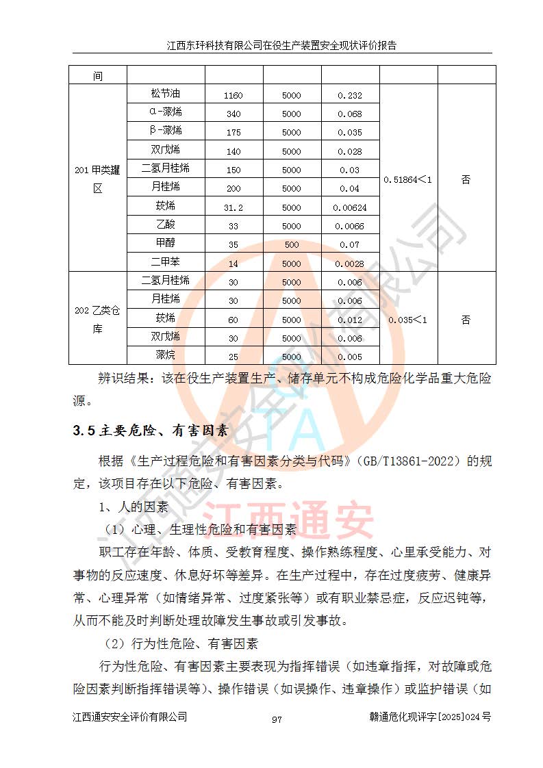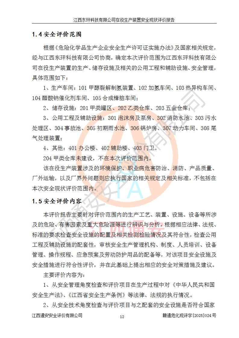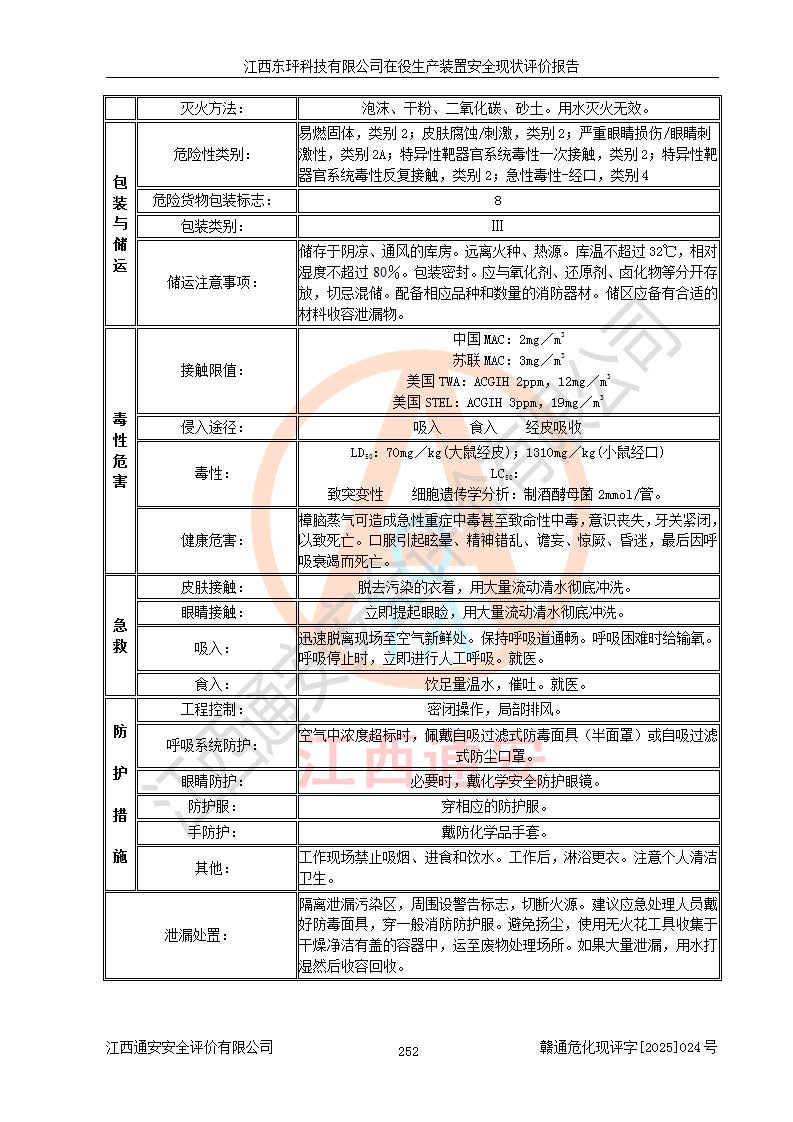 江西东玶科技有限公司位于江西省吉安市吉水县城西工业园区,法定**人为徐东,成立于2018年04月08日,注册资本叁仟贰佰叁拾万元整,经营范围为合成樟脑、α-蒎烯、β-蒎烯、二氢月桂烯(含月桂烯)、莰烯、双戊烯、氢气(中间产品)的制造加工(凭**批准证书经营);白乙酯、双萜烯等合成香料的制造加工等。 江西东玶科技有限公司2022年08月01日取得了《安全生产许可证》,许可证编号:(赣)WH安许证字[2022]1160号,许可范围为合成樟脑(2000t/a)、二氢月桂烯(1000t/a)、月桂烯(3200t/a)、莰烯(1000t/a)、双戊烯(810t/a)、双萜烯(1070t/a)、α-蒎烯(7500t/a)、β-蒎烯(3200t/a)、白乙酯(500t/a),**期为2022年08月01日至2025年07月31日。该公司2023年5月29日取得了三级安全生产标准化证书,证书编号:赣AQBWHⅢ202300036,**期至2026年5月。该公司现有员工53人,其中专职安全生产管理人员2人。 因生产经营需要,江西东玶科技有限公司实施了年产12000吨松节油深加工系列产品项目(二期),并将二氢月桂烯的设计生产规模2000t/a变更为1500t/a,减少中间产品蒎烷的消耗量,剩余的蒎烷(720t/a)作为产品销售。江西东玶科技有限公司委托深圳天阳工程设计有限公司进行了设计变更,按程序要求进行了试生产,委托评价公司编制了安全验收评价报告,并于2025年1月16日组织专家组和相关单位进行了验收。验收完成后,江西东玶科技有限公司2025年06月04日对《安全生产许可证》进行了变更,许可范围变更为合成樟脑(2000t/a)、二氢月桂烯(1500t/a)、月桂烯(3200t/a)、莰烯(1000t/a)、双戊烯(902.5t/a)、双萜烯(1200.7t/a)、α-蒎烯(7500t/a)、β-蒎烯(3200t/a)、白乙酯(500t/a)、蒎烷(中间产品,720t/a)。 江西东玶科技有限公司在役生产装置生产过程中涉及的主要原辅材料为松节油、乙酸、液碱、甲醇、碳酸钠、二甲苯、偏钛酸、甲酸、硫酸铜、雷尼镍、离子膜、天然气、氮气,中间产品为氢气、α-蒎烯、β-蒎烯、蒎烷,产品为合成樟脑、二氢月桂烯、月桂烯、莰烯、双戊烯、白乙酯、双萜烯,副产品为醋酸钠。根据《危险化学品目录》,该在役生产装置涉及的松节油、乙酸、液碱、甲醇、二甲苯、甲酸、雷尼镍、天然气(燃料)、氮气(压缩的)、柴油,中间产品α-蒎烯、β-蒎烯、氢气、蒎烷和产品中合成樟脑、二氢月桂烯、月桂烯、莰烯、双戊烯属于危险化学品。经辨识,甲醇、氢气和天然气(燃料)属于重点监管的危险化学品,甲醇属于特别管控的危险化学品,不涉及监控化学品、易制毒化学品、易制爆危险化学品、剧毒化学品和高毒物品,生产、储存单元不构成危险化学品重大危险源,涉及的加氢工艺属于重点监管的危险化工工艺。根据生产工艺特点及物料的理化特性可知,该在役生产装置生产过程中存在火灾与爆炸、中毒与窒息、触电、机械伤害、灼烫等危险有害因素。 该公司自2022年08月01日取得安全生产许可证以来,生产运行正常,未发生一般及以上生产安全事故。 |
