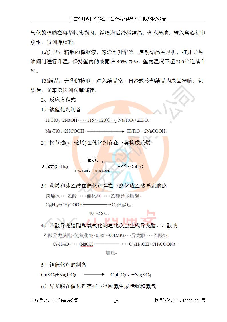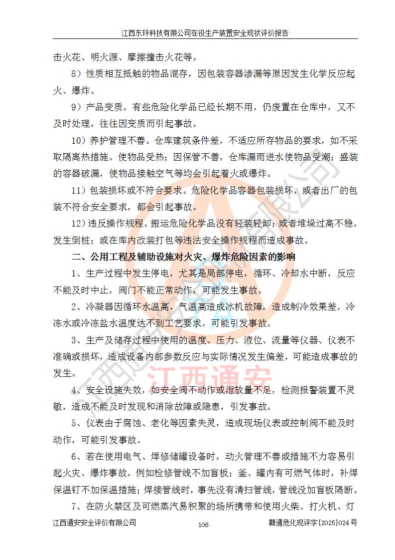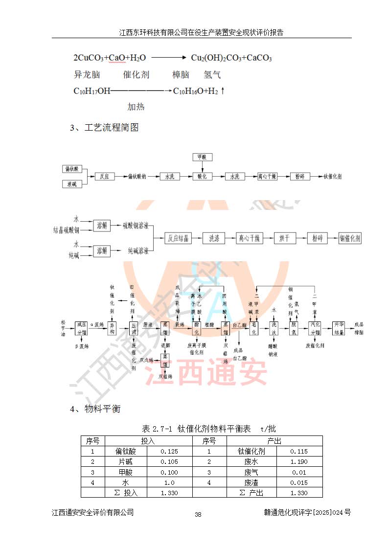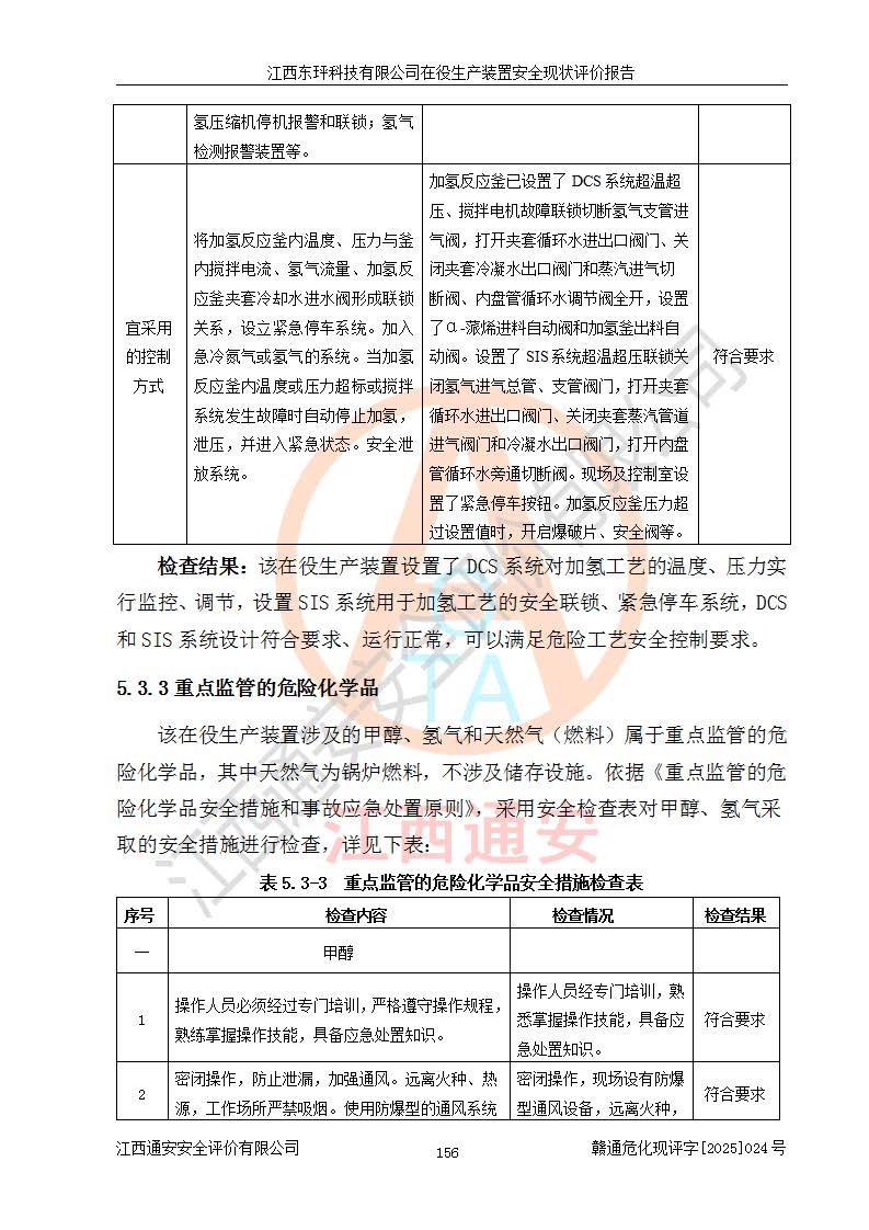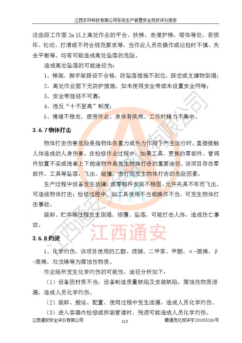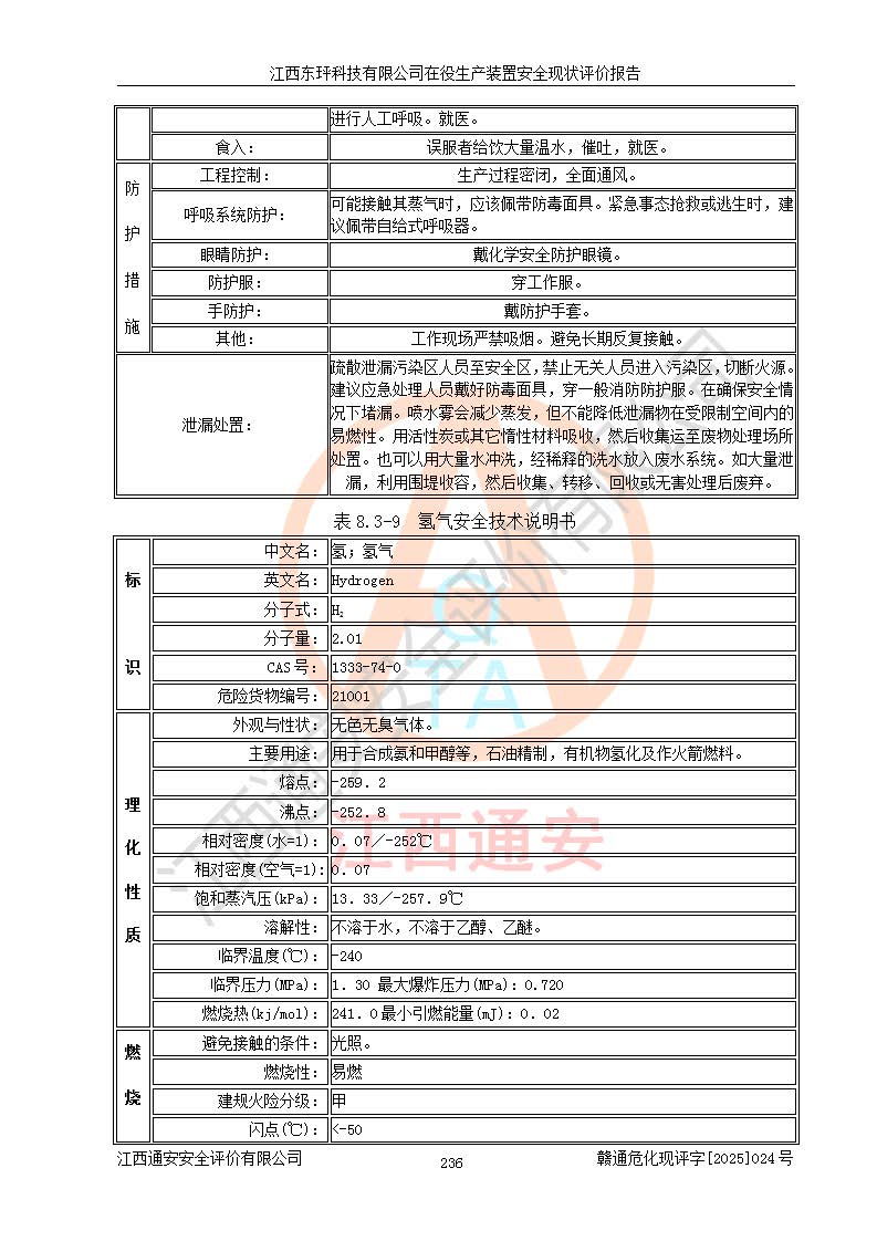 江西东玶科技有限公司位于江西省吉安市吉水县城西工业园区,法定**人为徐东,成立于2018年04月08日,注册资本叁仟贰佰叁拾万元整,经营范围为合成樟脑、α-蒎烯、β-蒎烯、二氢月桂烯(含月桂烯)、莰烯、双戊烯、氢气(中间产品)的制造加工(凭**批准证书经营);白乙酯、双萜烯等合成香料的制造加工等。 江西东玶科技有限公司2022年08月01日取得了《安全生产许可证》,许可证编号:(赣)WH安许证字[2022]1160号,许可范围为合成樟脑(2000t/a)、二氢月桂烯(1000t/a)、月桂烯(3200t/a)、莰烯(1000t/a)、双戊烯(810t/a)、双萜烯(1070t/a)、α-蒎烯(7500t/a)、β-蒎烯(3200t/a)、白乙酯(500t/a),**期为2022年08月01日至2025年07月31日。该公司2023年5月29日取得了三级安全生产标准化证书,证书编号:赣AQBWHⅢ202300036,**期至2026年5月。该公司现有员工53人,其中专职安全生产管理人员2人。 因生产经营需要,江西东玶科技有限公司实施了年产12000吨松节油深加工系列产品项目(二期),并将二氢月桂烯的设计生产规模2000t/a变更为1500t/a,减少中间产品蒎烷的消耗量,剩余的蒎烷(720t/a)作为产品销售。江西东玶科技有限公司委托深圳天阳工程设计有限公司进行了设计变更,按程序要求进行了试生产,委托评价公司编制了安全验收评价报告,并于2025年1月16日组织专家组和相关单位进行了验收。验收完成后,江西东玶科技有限公司2025年06月04日对《安全生产许可证》进行了变更,许可范围变更为合成樟脑(2000t/a)、二氢月桂烯(1500t/a)、月桂烯(3200t/a)、莰烯(1000t/a)、双戊烯(902.5t/a)、双萜烯(1200.7t/a)、α-蒎烯(7500t/a)、β-蒎烯(3200t/a)、白乙酯(500t/a)、蒎烷(中间产品,720t/a)。 江西东玶科技有限公司在役生产装置生产过程中涉及的主要原辅材料为松节油、乙酸、液碱、甲醇、碳酸钠、二甲苯、偏钛酸、甲酸、硫酸铜、雷尼镍、离子膜、天然气、氮气,中间产品为氢气、α-蒎烯、β-蒎烯、蒎烷,产品为合成樟脑、二氢月桂烯、月桂烯、莰烯、双戊烯、白乙酯、双萜烯,副产品为醋酸钠。根据《危险化学品目录》,该在役生产装置涉及的松节油、乙酸、液碱、甲醇、二甲苯、甲酸、雷尼镍、天然气(燃料)、氮气(压缩的)、柴油,中间产品α-蒎烯、β-蒎烯、氢气、蒎烷和产品中合成樟脑、二氢月桂烯、月桂烯、莰烯、双戊烯属于危险化学品。经辨识,甲醇、氢气和天然气(燃料)属于重点监管的危险化学品,甲醇属于特别管控的危险化学品,不涉及监控化学品、易制毒化学品、易制爆危险化学品、剧毒化学品和高毒物品,生产、储存单元不构成危险化学品重大危险源,涉及的加氢工艺属于重点监管的危险化工工艺。根据生产工艺特点及物料的理化特性可知,该在役生产装置生产过程中存在火灾与爆炸、中毒与窒息、触电、机械伤害、灼烫等危险有害因素。 该公司自2022年08月01日取得安全生产许可证以来,生产运行正常,未发生一般及以上生产安全事故。 |