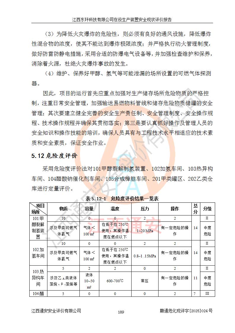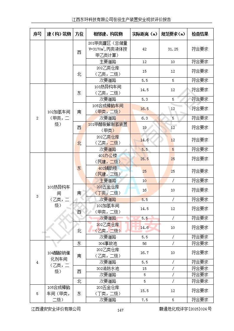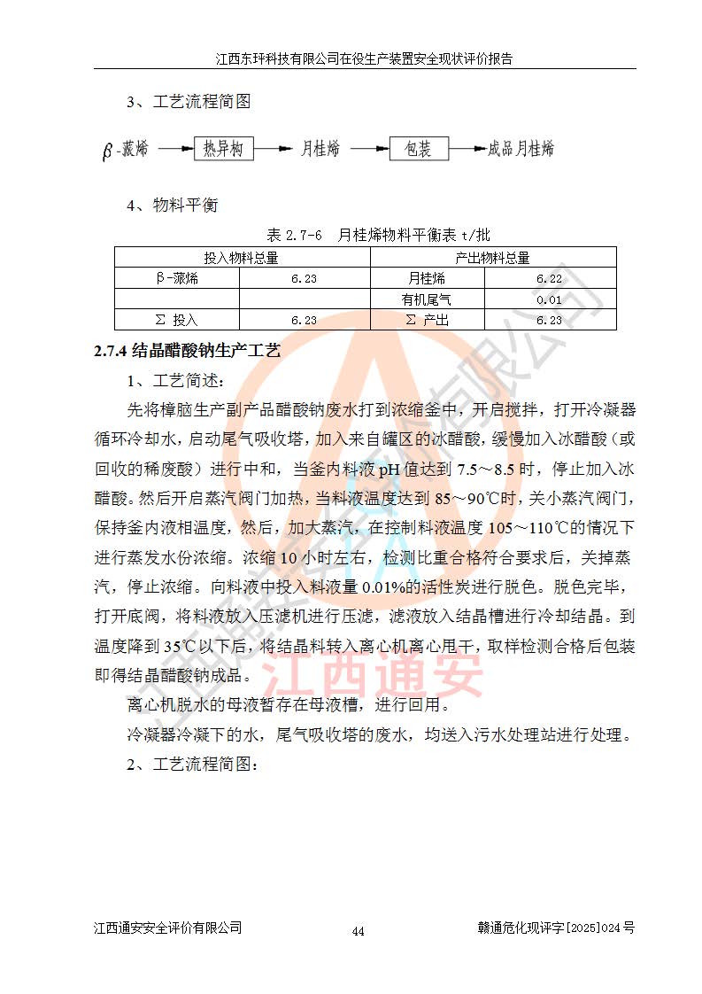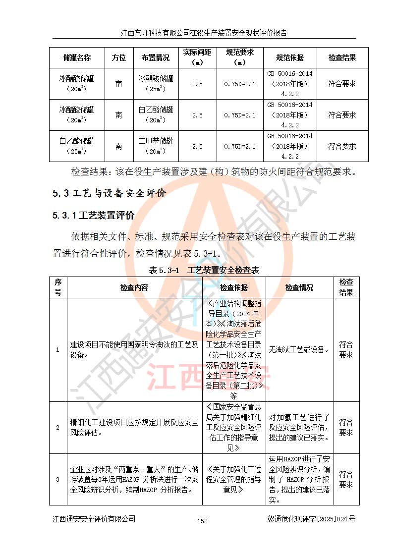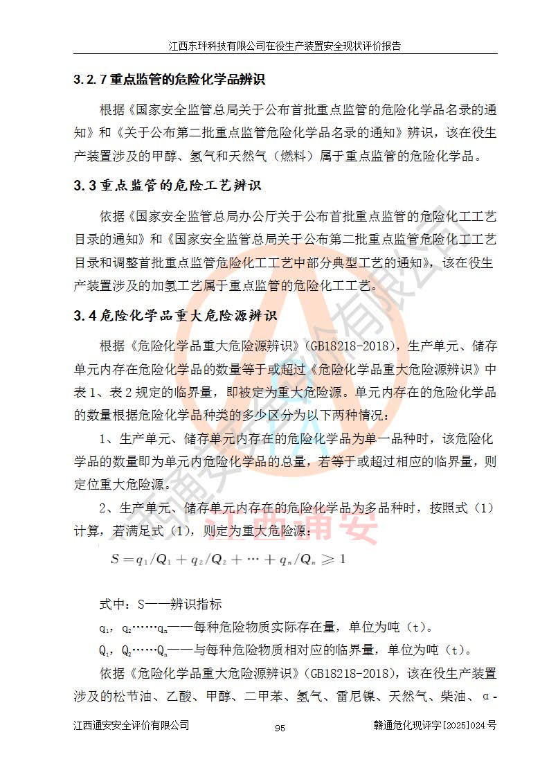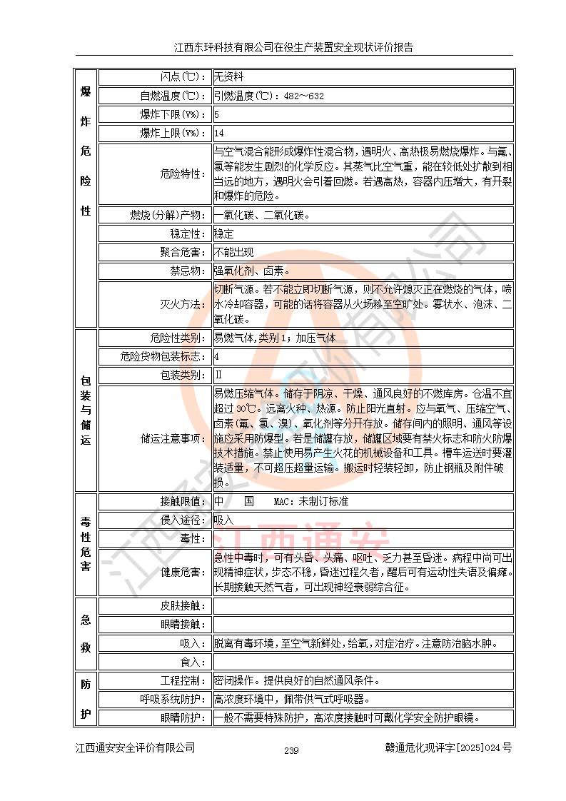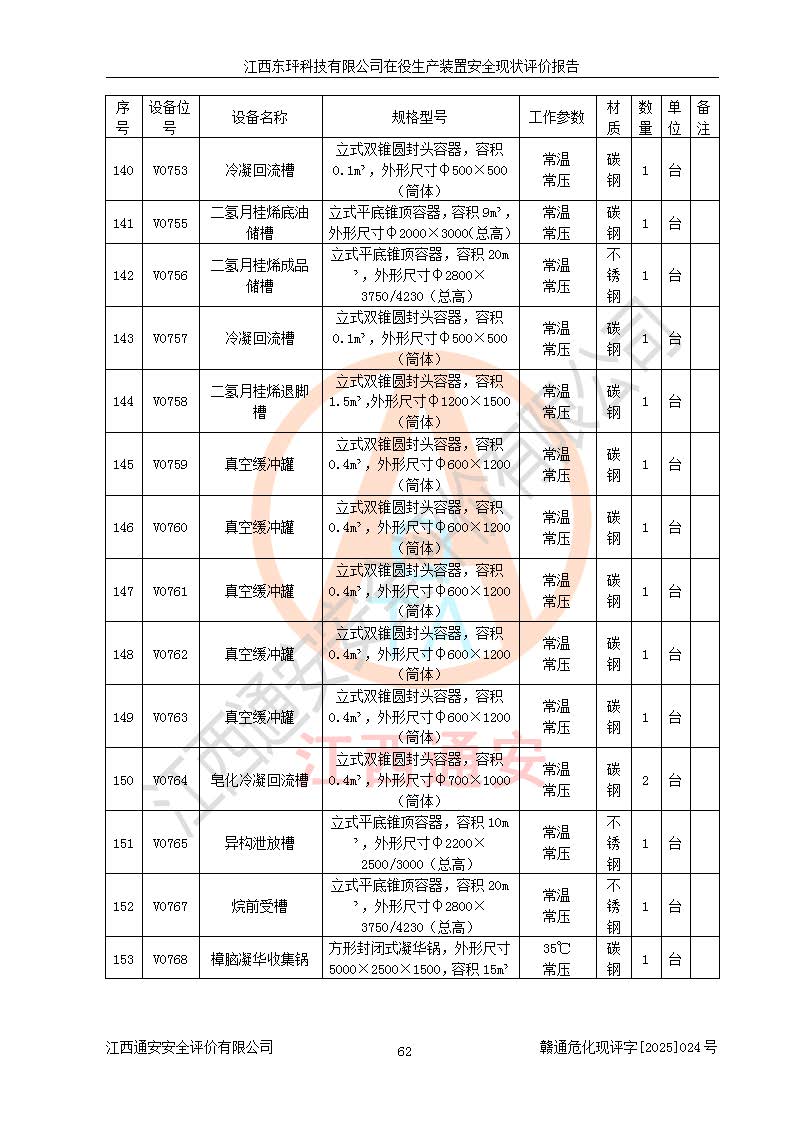 江西东玶科技有限公司位于江西省吉安市吉水县城西工业园区,法定**人为徐东,成立于2018年04月08日,注册资本叁仟贰佰叁拾万元整,经营范围为合成樟脑、α-蒎烯、β-蒎烯、二氢月桂烯(含月桂烯)、莰烯、双戊烯、氢气(中间产品)的制造加工(凭**批准证书经营);白乙酯、双萜烯等合成香料的制造加工等。 江西东玶科技有限公司2022年08月01日取得了《安全生产许可证》,许可证编号:(赣)WH安许证字[2022]1160号,许可范围为合成樟脑(2000t/a)、二氢月桂烯(1000t/a)、月桂烯(3200t/a)、莰烯(1000t/a)、双戊烯(810t/a)、双萜烯(1070t/a)、α-蒎烯(7500t/a)、β-蒎烯(3200t/a)、白乙酯(500t/a),**期为2022年08月01日至2025年07月31日。该公司2023年5月29日取得了三级安全生产标准化证书,证书编号:赣AQBWHⅢ202300036,**期至2026年5月。该公司现有员工53人,其中专职安全生产管理人员2人。 因生产经营需要,江西东玶科技有限公司实施了年产12000吨松节油深加工系列产品项目(二期),并将二氢月桂烯的设计生产规模2000t/a变更为1500t/a,减少中间产品蒎烷的消耗量,剩余的蒎烷(720t/a)作为产品销售。江西东玶科技有限公司委托深圳天阳工程设计有限公司进行了设计变更,按程序要求进行了试生产,委托评价公司编制了安全验收评价报告,并于2025年1月16日组织专家组和相关单位进行了验收。验收完成后,江西东玶科技有限公司2025年06月04日对《安全生产许可证》进行了变更,许可范围变更为合成樟脑(2000t/a)、二氢月桂烯(1500t/a)、月桂烯(3200t/a)、莰烯(1000t/a)、双戊烯(902.5t/a)、双萜烯(1200.7t/a)、α-蒎烯(7500t/a)、β-蒎烯(3200t/a)、白乙酯(500t/a)、蒎烷(中间产品,720t/a)。 江西东玶科技有限公司在役生产装置生产过程中涉及的主要原辅材料为松节油、乙酸、液碱、甲醇、碳酸钠、二甲苯、偏钛酸、甲酸、硫酸铜、雷尼镍、离子膜、天然气、氮气,中间产品为氢气、α-蒎烯、β-蒎烯、蒎烷,产品为合成樟脑、二氢月桂烯、月桂烯、莰烯、双戊烯、白乙酯、双萜烯,副产品为醋酸钠。根据《危险化学品目录》,该在役生产装置涉及的松节油、乙酸、液碱、甲醇、二甲苯、甲酸、雷尼镍、天然气(燃料)、氮气(压缩的)、柴油,中间产品α-蒎烯、β-蒎烯、氢气、蒎烷和产品中合成樟脑、二氢月桂烯、月桂烯、莰烯、双戊烯属于危险化学品。经辨识,甲醇、氢气和天然气(燃料)属于重点监管的危险化学品,甲醇属于特别管控的危险化学品,不涉及监控化学品、易制毒化学品、易制爆危险化学品、剧毒化学品和高毒物品,生产、储存单元不构成危险化学品重大危险源,涉及的加氢工艺属于重点监管的危险化工工艺。根据生产工艺特点及物料的理化特性可知,该在役生产装置生产过程中存在火灾与爆炸、中毒与窒息、触电、机械伤害、灼烫等危险有害因素。 该公司自2022年08月01日取得安全生产许可证以来,生产运行正常,未发生一般及以上生产安全事故。 |