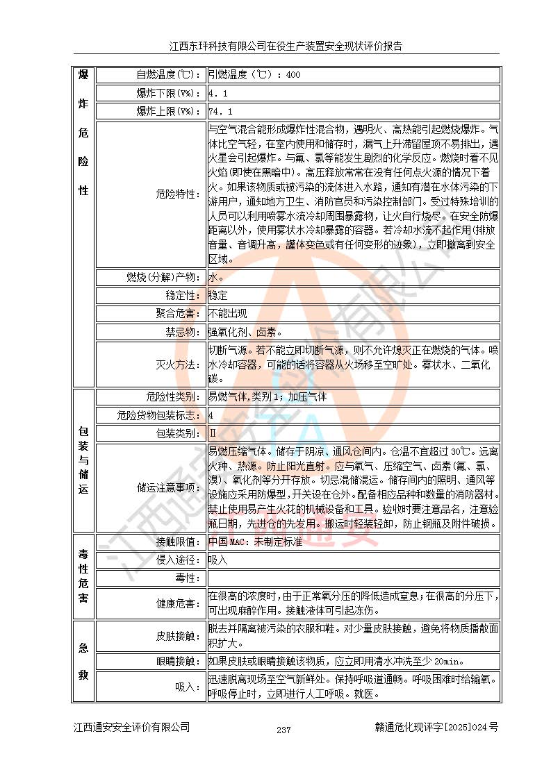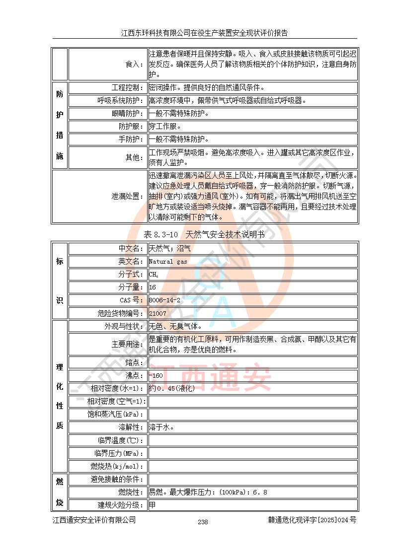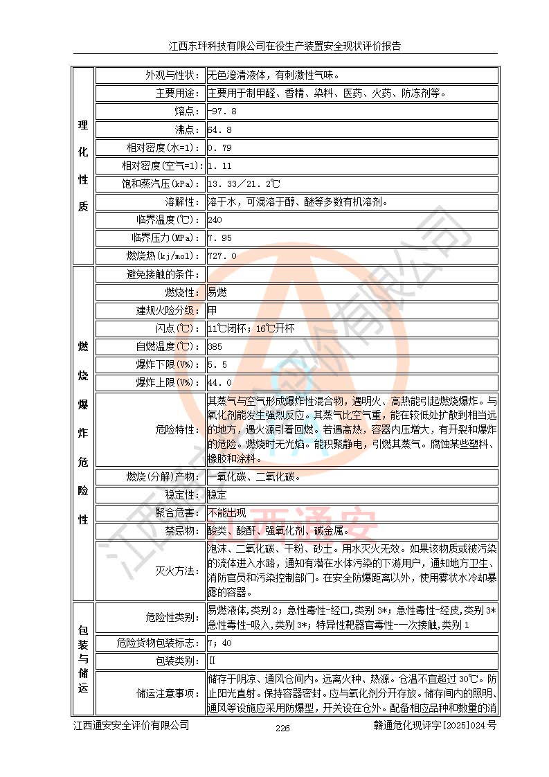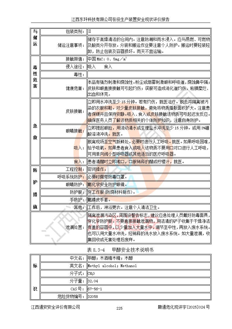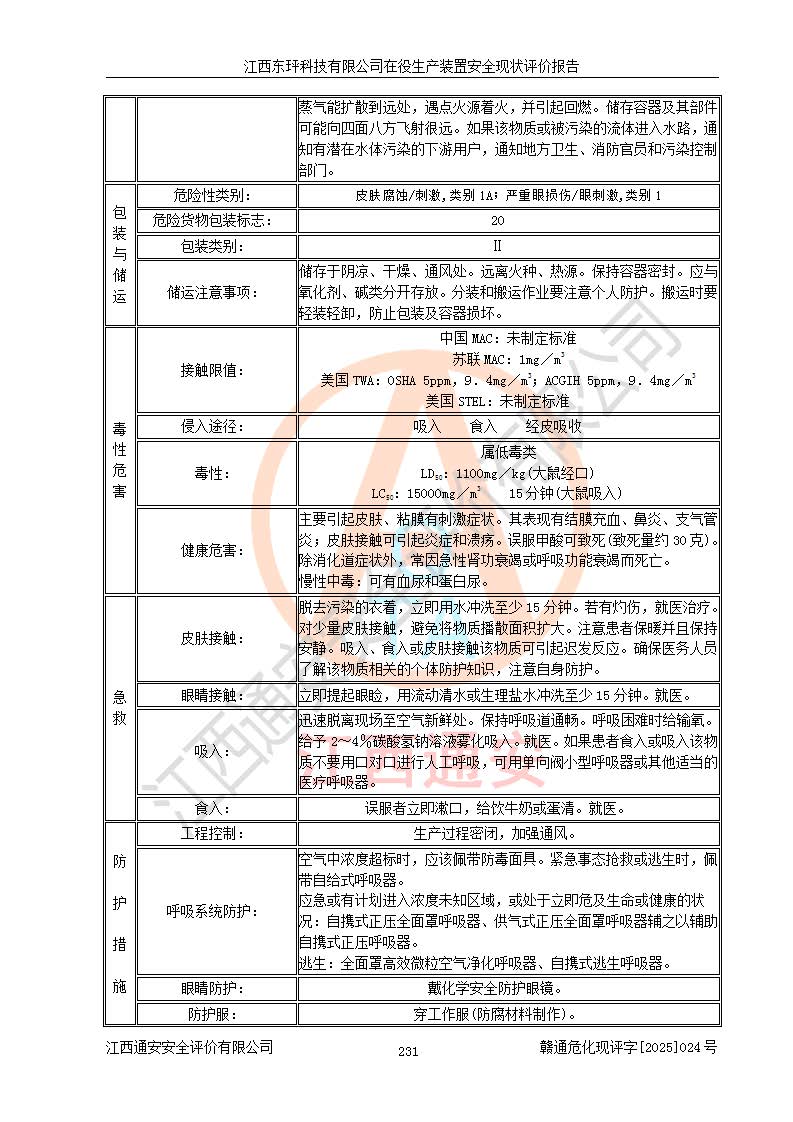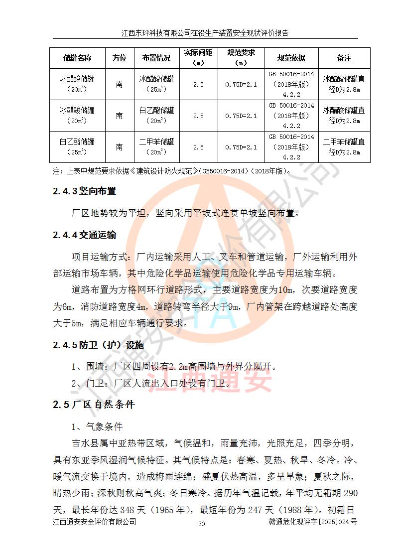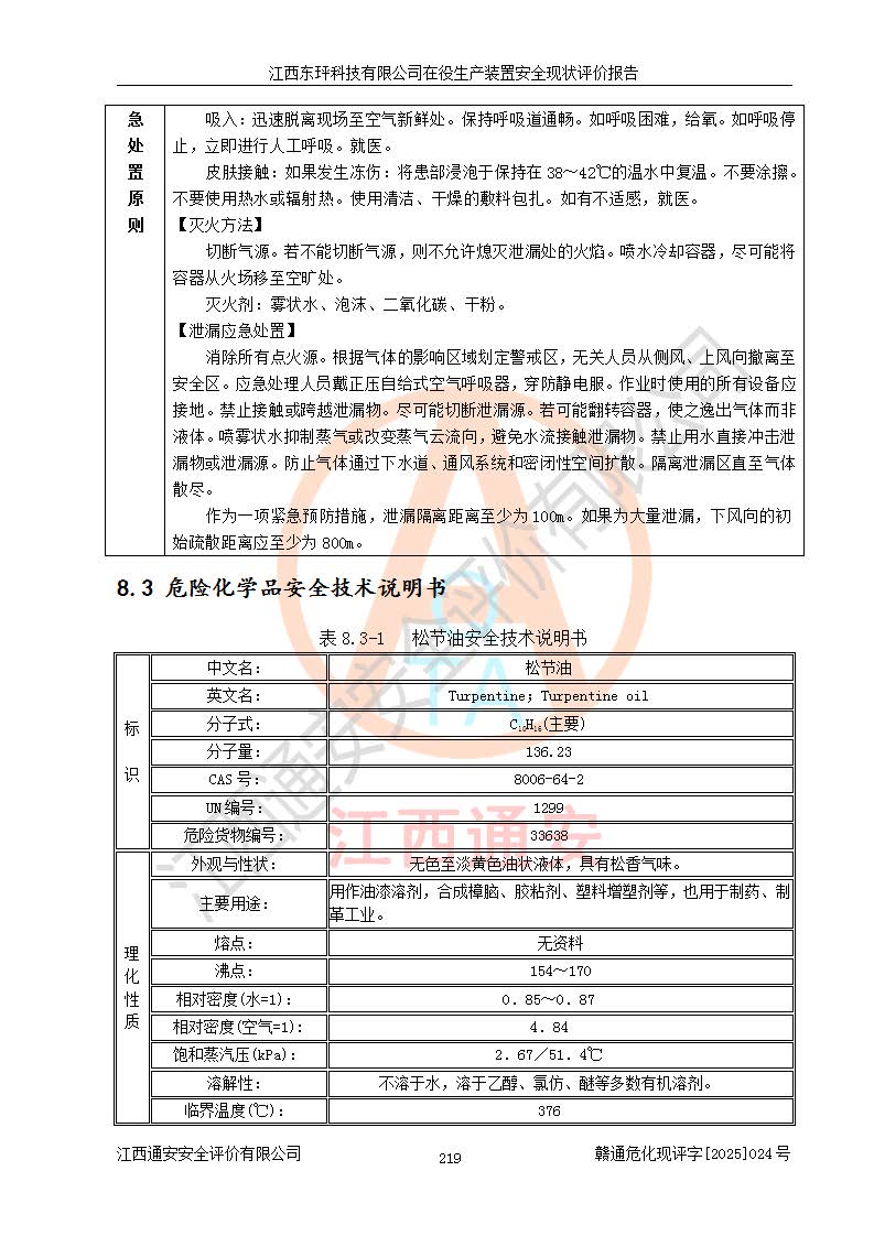 江西东玶科技有限公司位于江西省吉安市吉水县城西工业园区,法定**人为徐东,成立于2018年04月08日,注册资本叁仟贰佰叁拾万元整,经营范围为合成樟脑、α-蒎烯、β-蒎烯、二氢月桂烯(含月桂烯)、莰烯、双戊烯、氢气(中间产品)的制造加工(凭**批准证书经营);白乙酯、双萜烯等合成香料的制造加工等。 江西东玶科技有限公司2022年08月01日取得了《安全生产许可证》,许可证编号:(赣)WH安许证字[2022]1160号,许可范围为合成樟脑(2000t/a)、二氢月桂烯(1000t/a)、月桂烯(3200t/a)、莰烯(1000t/a)、双戊烯(810t/a)、双萜烯(1070t/a)、α-蒎烯(7500t/a)、β-蒎烯(3200t/a)、白乙酯(500t/a),**期为2022年08月01日至2025年07月31日。该公司2023年5月29日取得了三级安全生产标准化证书,证书编号:赣AQBWHⅢ202300036,**期至2026年5月。该公司现有员工53人,其中专职安全生产管理人员2人。 因生产经营需要,江西东玶科技有限公司实施了年产12000吨松节油深加工系列产品项目(二期),并将二氢月桂烯的设计生产规模2000t/a变更为1500t/a,减少中间产品蒎烷的消耗量,剩余的蒎烷(720t/a)作为产品销售。江西东玶科技有限公司委托深圳天阳工程设计有限公司进行了设计变更,按程序要求进行了试生产,委托评价公司编制了安全验收评价报告,并于2025年1月16日组织专家组和相关单位进行了验收。验收完成后,江西东玶科技有限公司2025年06月04日对《安全生产许可证》进行了变更,许可范围变更为合成樟脑(2000t/a)、二氢月桂烯(1500t/a)、月桂烯(3200t/a)、莰烯(1000t/a)、双戊烯(902.5t/a)、双萜烯(1200.7t/a)、α-蒎烯(7500t/a)、β-蒎烯(3200t/a)、白乙酯(500t/a)、蒎烷(中间产品,720t/a)。 江西东玶科技有限公司在役生产装置生产过程中涉及的主要原辅材料为松节油、乙酸、液碱、甲醇、碳酸钠、二甲苯、偏钛酸、甲酸、硫酸铜、雷尼镍、离子膜、天然气、氮气,中间产品为氢气、α-蒎烯、β-蒎烯、蒎烷,产品为合成樟脑、二氢月桂烯、月桂烯、莰烯、双戊烯、白乙酯、双萜烯,副产品为醋酸钠。根据《危险化学品目录》,该在役生产装置涉及的松节油、乙酸、液碱、甲醇、二甲苯、甲酸、雷尼镍、天然气(燃料)、氮气(压缩的)、柴油,中间产品α-蒎烯、β-蒎烯、氢气、蒎烷和产品中合成樟脑、二氢月桂烯、月桂烯、莰烯、双戊烯属于危险化学品。经辨识,甲醇、氢气和天然气(燃料)属于重点监管的危险化学品,甲醇属于特别管控的危险化学品,不涉及监控化学品、易制毒化学品、易制爆危险化学品、剧毒化学品和高毒物品,生产、储存单元不构成危险化学品重大危险源,涉及的加氢工艺属于重点监管的危险化工工艺。根据生产工艺特点及物料的理化特性可知,该在役生产装置生产过程中存在火灾与爆炸、中毒与窒息、触电、机械伤害、灼烫等危险有害因素。 该公司自2022年08月01日取得安全生产许可证以来,生产运行正常,未发生一般及以上生产安全事故。 |