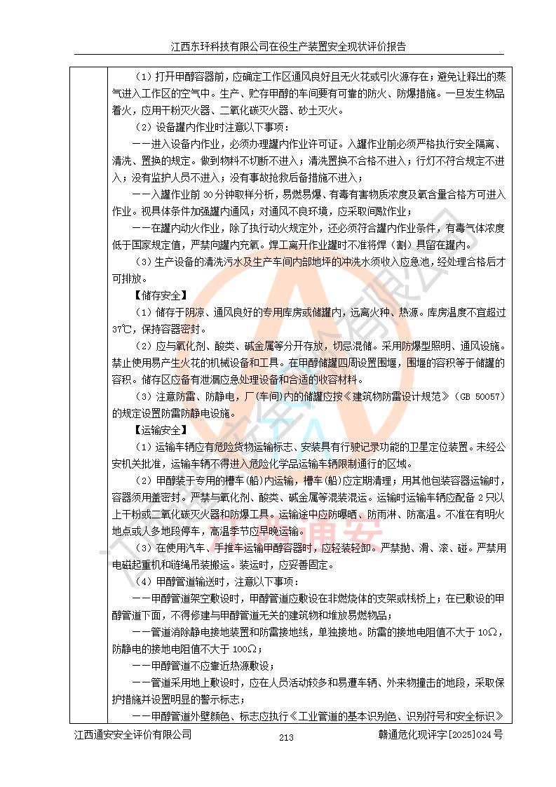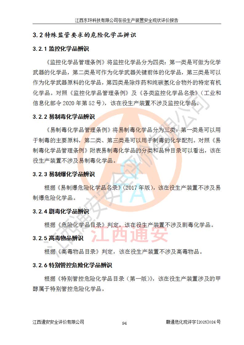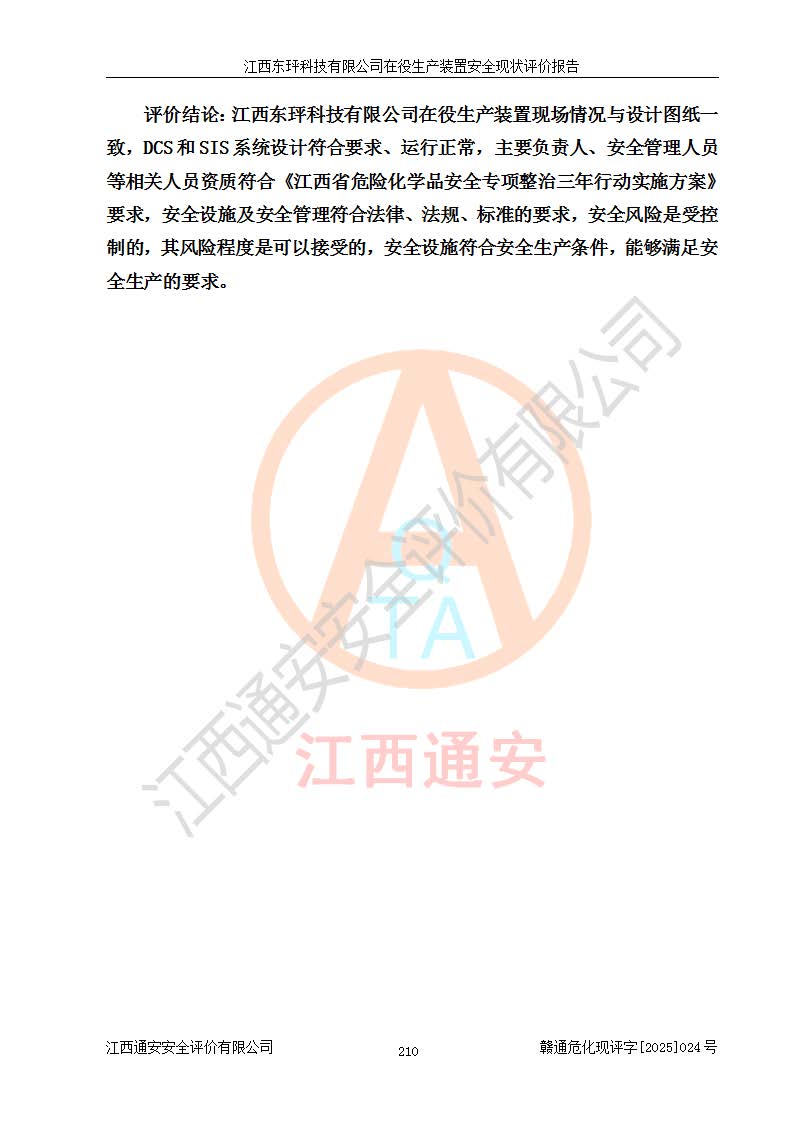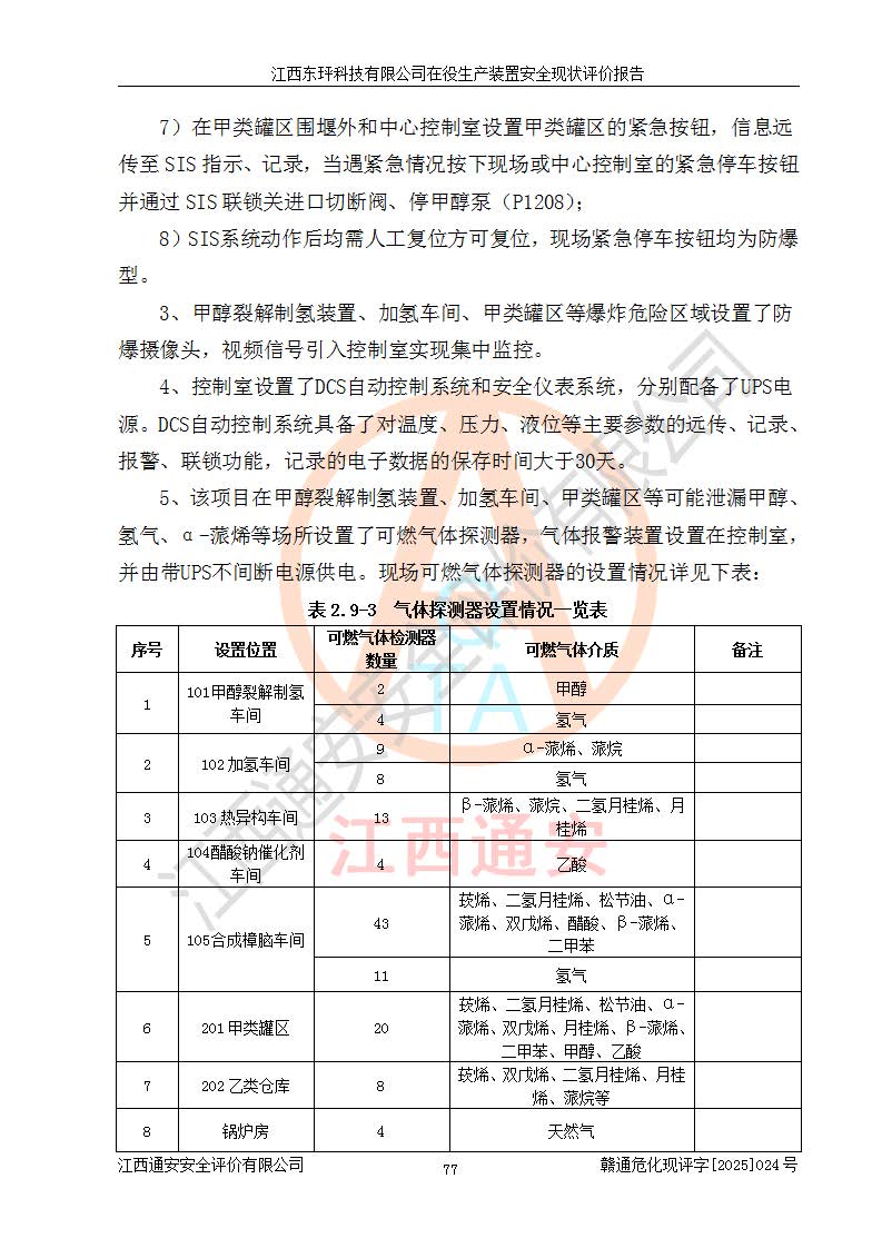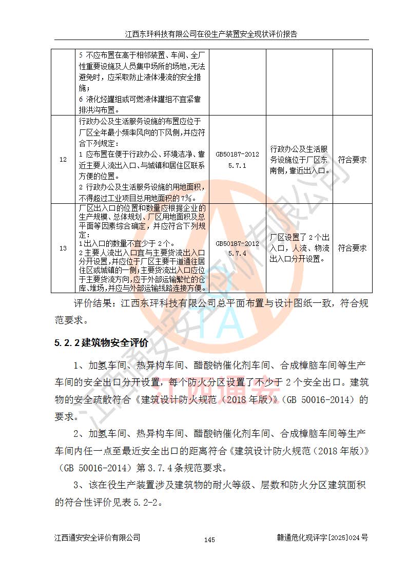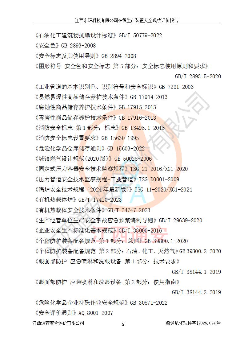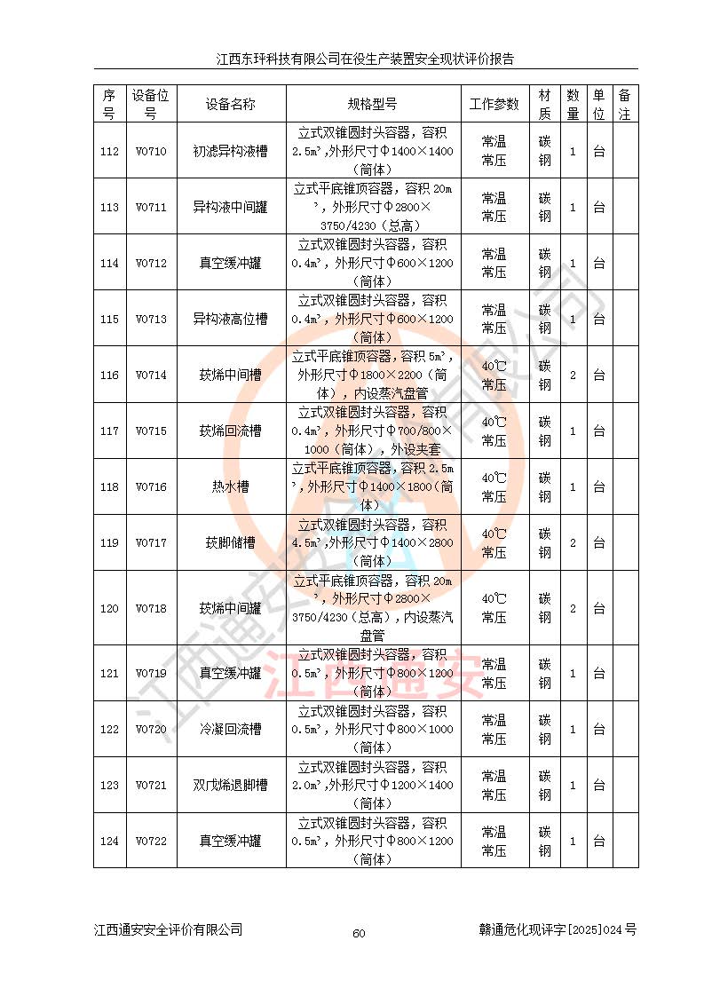 江西东玶科技有限公司位于江西省吉安市吉水县城西工业园区,法定**人为徐东,成立于2018年04月08日,注册资本叁仟贰佰叁拾万元整,经营范围为合成樟脑、α-蒎烯、β-蒎烯、二氢月桂烯(含月桂烯)、莰烯、双戊烯、氢气(中间产品)的制造加工(凭**批准证书经营);白乙酯、双萜烯等合成香料的制造加工等。 江西东玶科技有限公司2022年08月01日取得了《安全生产许可证》,许可证编号:(赣)WH安许证字[2022]1160号,许可范围为合成樟脑(2000t/a)、二氢月桂烯(1000t/a)、月桂烯(3200t/a)、莰烯(1000t/a)、双戊烯(810t/a)、双萜烯(1070t/a)、α-蒎烯(7500t/a)、β-蒎烯(3200t/a)、白乙酯(500t/a),**期为2022年08月01日至2025年07月31日。该公司2023年5月29日取得了三级安全生产标准化证书,证书编号:赣AQBWHⅢ202300036,**期至2026年5月。该公司现有员工53人,其中专职安全生产管理人员2人。 因生产经营需要,江西东玶科技有限公司实施了年产12000吨松节油深加工系列产品项目(二期),并将二氢月桂烯的设计生产规模2000t/a变更为1500t/a,减少中间产品蒎烷的消耗量,剩余的蒎烷(720t/a)作为产品销售。江西东玶科技有限公司委托深圳天阳工程设计有限公司进行了设计变更,按程序要求进行了试生产,委托评价公司编制了安全验收评价报告,并于2025年1月16日组织专家组和相关单位进行了验收。验收完成后,江西东玶科技有限公司2025年06月04日对《安全生产许可证》进行了变更,许可范围变更为合成樟脑(2000t/a)、二氢月桂烯(1500t/a)、月桂烯(3200t/a)、莰烯(1000t/a)、双戊烯(902.5t/a)、双萜烯(1200.7t/a)、α-蒎烯(7500t/a)、β-蒎烯(3200t/a)、白乙酯(500t/a)、蒎烷(中间产品,720t/a)。 江西东玶科技有限公司在役生产装置生产过程中涉及的主要原辅材料为松节油、乙酸、液碱、甲醇、碳酸钠、二甲苯、偏钛酸、甲酸、硫酸铜、雷尼镍、离子膜、天然气、氮气,中间产品为氢气、α-蒎烯、β-蒎烯、蒎烷,产品为合成樟脑、二氢月桂烯、月桂烯、莰烯、双戊烯、白乙酯、双萜烯,副产品为醋酸钠。根据《危险化学品目录》,该在役生产装置涉及的松节油、乙酸、液碱、甲醇、二甲苯、甲酸、雷尼镍、天然气(燃料)、氮气(压缩的)、柴油,中间产品α-蒎烯、β-蒎烯、氢气、蒎烷和产品中合成樟脑、二氢月桂烯、月桂烯、莰烯、双戊烯属于危险化学品。经辨识,甲醇、氢气和天然气(燃料)属于重点监管的危险化学品,甲醇属于特别管控的危险化学品,不涉及监控化学品、易制毒化学品、易制爆危险化学品、剧毒化学品和高毒物品,生产、储存单元不构成危险化学品重大危险源,涉及的加氢工艺属于重点监管的危险化工工艺。根据生产工艺特点及物料的理化特性可知,该在役生产装置生产过程中存在火灾与爆炸、中毒与窒息、触电、机械伤害、灼烫等危险有害因素。 该公司自2022年08月01日取得安全生产许可证以来,生产运行正常,未发生一般及以上生产安全事故。 |