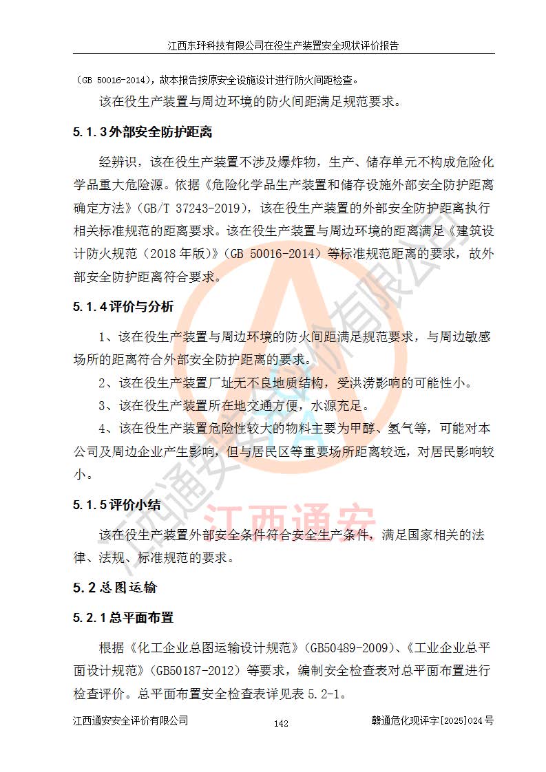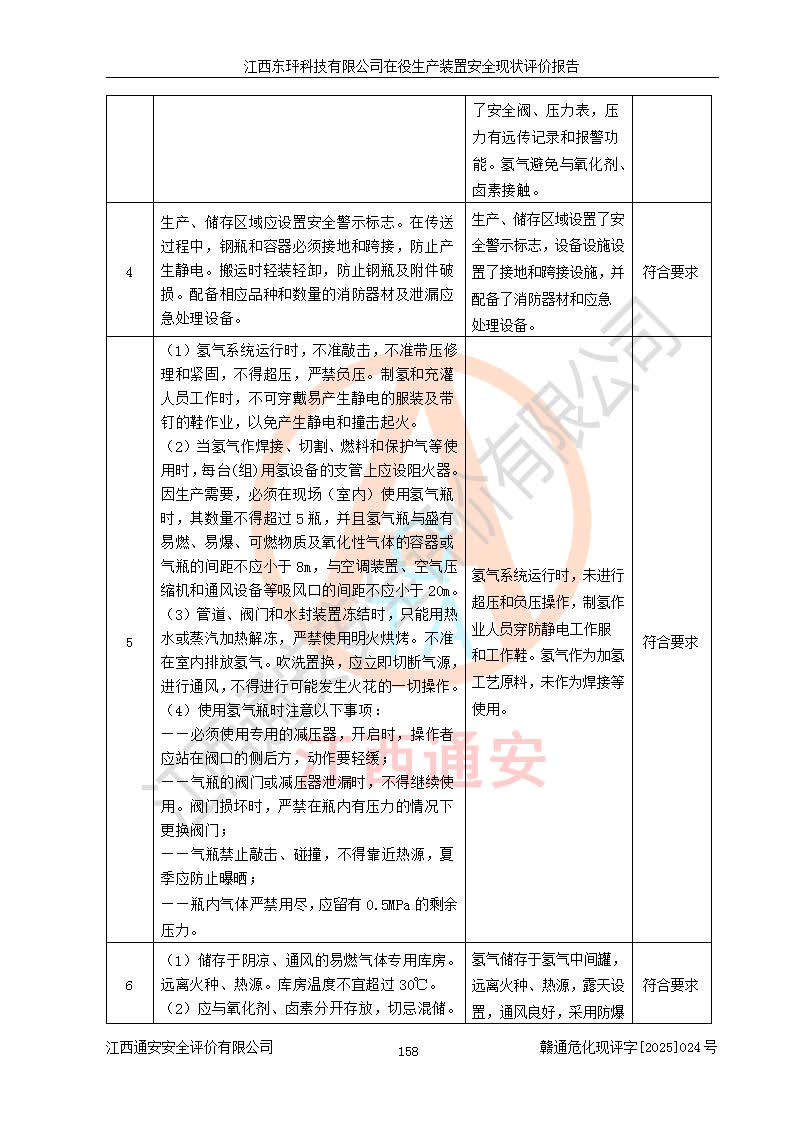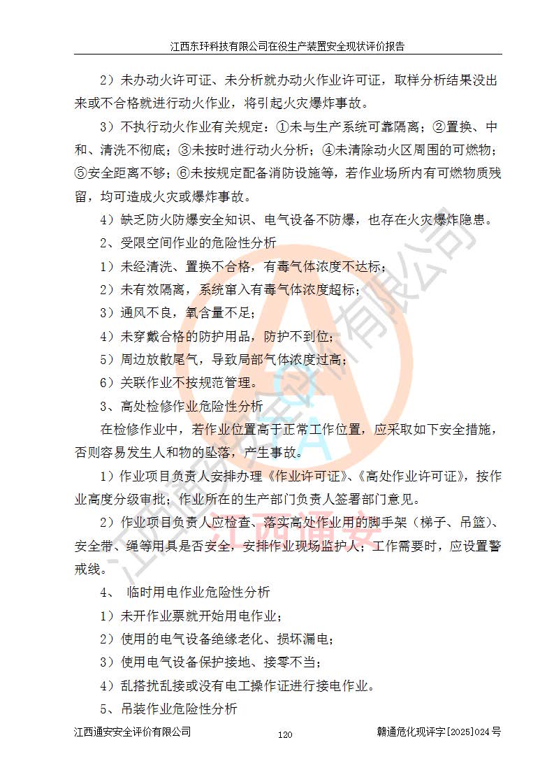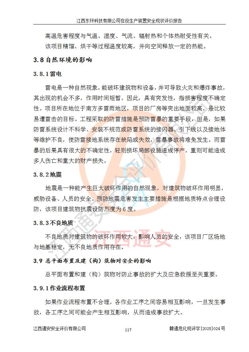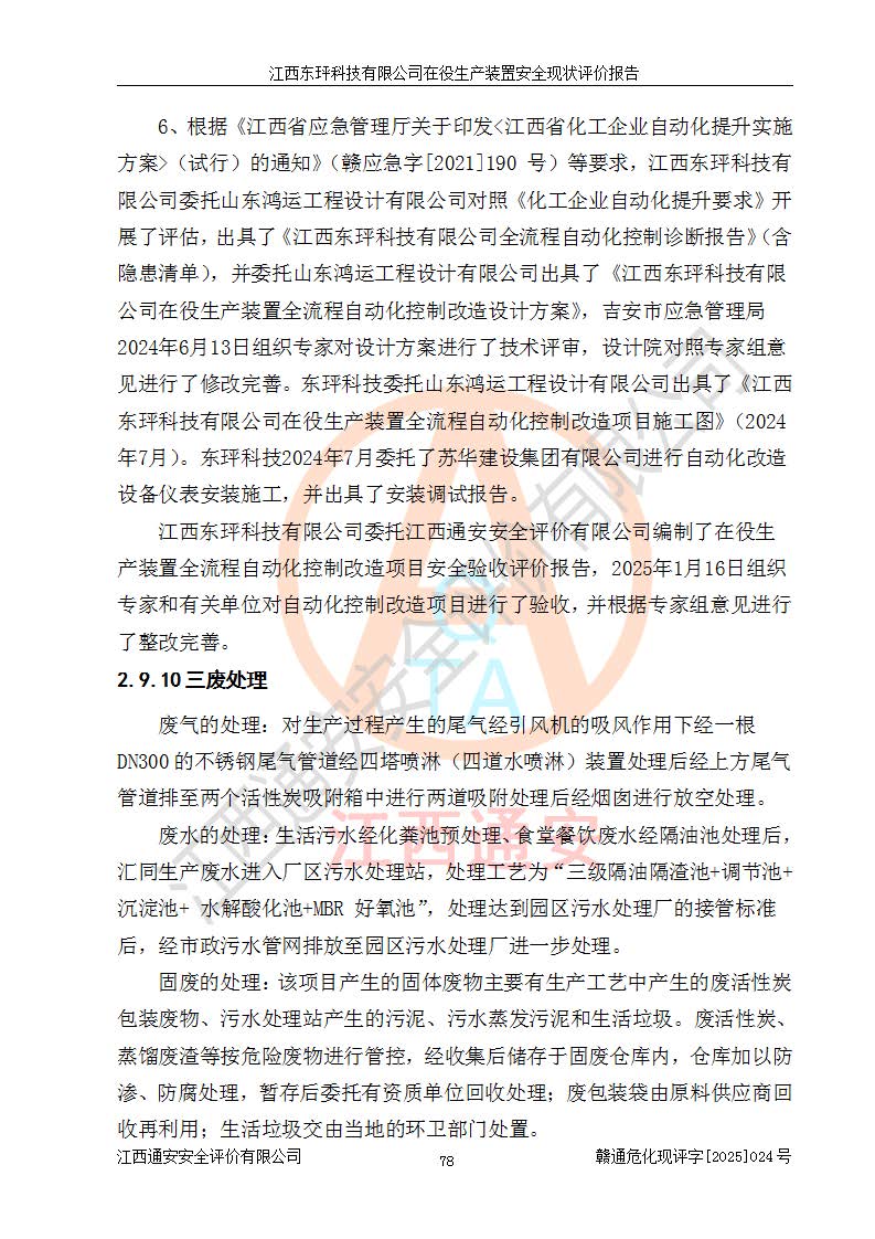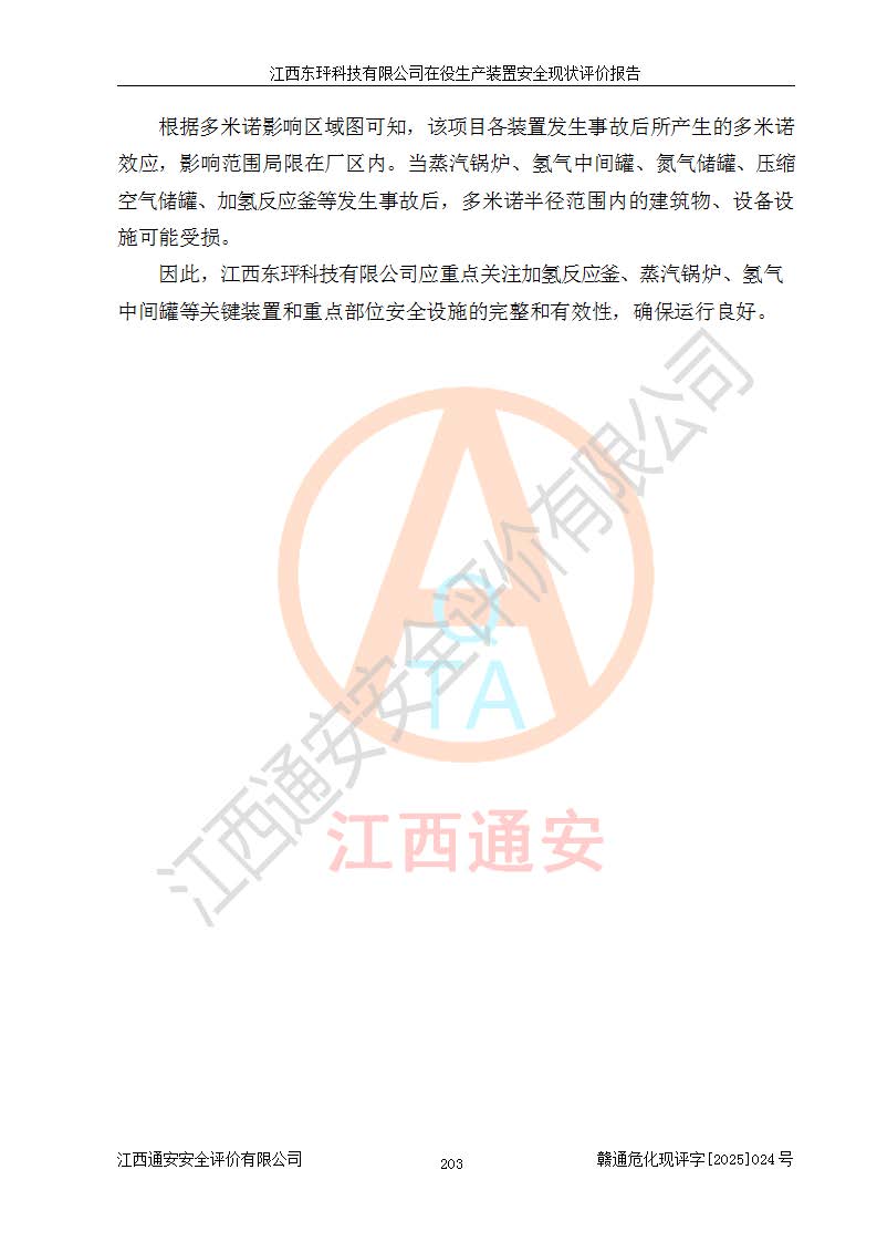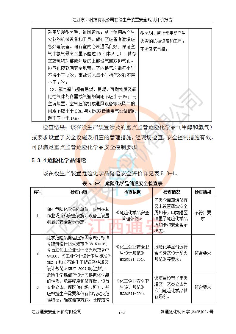 江西东玶科技有限公司位于江西省吉安市吉水县城西工业园区,法定**人为徐东,成立于2018年04月08日,注册资本叁仟贰佰叁拾万元整,经营范围为合成樟脑、α-蒎烯、β-蒎烯、二氢月桂烯(含月桂烯)、莰烯、双戊烯、氢气(中间产品)的制造加工(凭**批准证书经营);白乙酯、双萜烯等合成香料的制造加工等。 江西东玶科技有限公司2022年08月01日取得了《安全生产许可证》,许可证编号:(赣)WH安许证字[2022]1160号,许可范围为合成樟脑(2000t/a)、二氢月桂烯(1000t/a)、月桂烯(3200t/a)、莰烯(1000t/a)、双戊烯(810t/a)、双萜烯(1070t/a)、α-蒎烯(7500t/a)、β-蒎烯(3200t/a)、白乙酯(500t/a),**期为2022年08月01日至2025年07月31日。该公司2023年5月29日取得了三级安全生产标准化证书,证书编号:赣AQBWHⅢ202300036,**期至2026年5月。该公司现有员工53人,其中专职安全生产管理人员2人。 因生产经营需要,江西东玶科技有限公司实施了年产12000吨松节油深加工系列产品项目(二期),并将二氢月桂烯的设计生产规模2000t/a变更为1500t/a,减少中间产品蒎烷的消耗量,剩余的蒎烷(720t/a)作为产品销售。江西东玶科技有限公司委托深圳天阳工程设计有限公司进行了设计变更,按程序要求进行了试生产,委托评价公司编制了安全验收评价报告,并于2025年1月16日组织专家组和相关单位进行了验收。验收完成后,江西东玶科技有限公司2025年06月04日对《安全生产许可证》进行了变更,许可范围变更为合成樟脑(2000t/a)、二氢月桂烯(1500t/a)、月桂烯(3200t/a)、莰烯(1000t/a)、双戊烯(902.5t/a)、双萜烯(1200.7t/a)、α-蒎烯(7500t/a)、β-蒎烯(3200t/a)、白乙酯(500t/a)、蒎烷(中间产品,720t/a)。 江西东玶科技有限公司在役生产装置生产过程中涉及的主要原辅材料为松节油、乙酸、液碱、甲醇、碳酸钠、二甲苯、偏钛酸、甲酸、硫酸铜、雷尼镍、离子膜、天然气、氮气,中间产品为氢气、α-蒎烯、β-蒎烯、蒎烷,产品为合成樟脑、二氢月桂烯、月桂烯、莰烯、双戊烯、白乙酯、双萜烯,副产品为醋酸钠。根据《危险化学品目录》,该在役生产装置涉及的松节油、乙酸、液碱、甲醇、二甲苯、甲酸、雷尼镍、天然气(燃料)、氮气(压缩的)、柴油,中间产品α-蒎烯、β-蒎烯、氢气、蒎烷和产品中合成樟脑、二氢月桂烯、月桂烯、莰烯、双戊烯属于危险化学品。经辨识,甲醇、氢气和天然气(燃料)属于重点监管的危险化学品,甲醇属于特别管控的危险化学品,不涉及监控化学品、易制毒化学品、易制爆危险化学品、剧毒化学品和高毒物品,生产、储存单元不构成危险化学品重大危险源,涉及的加氢工艺属于重点监管的危险化工工艺。根据生产工艺特点及物料的理化特性可知,该在役生产装置生产过程中存在火灾与爆炸、中毒与窒息、触电、机械伤害、灼烫等危险有害因素。 该公司自2022年08月01日取得安全生产许可证以来,生产运行正常,未发生一般及以上生产安全事故。 |