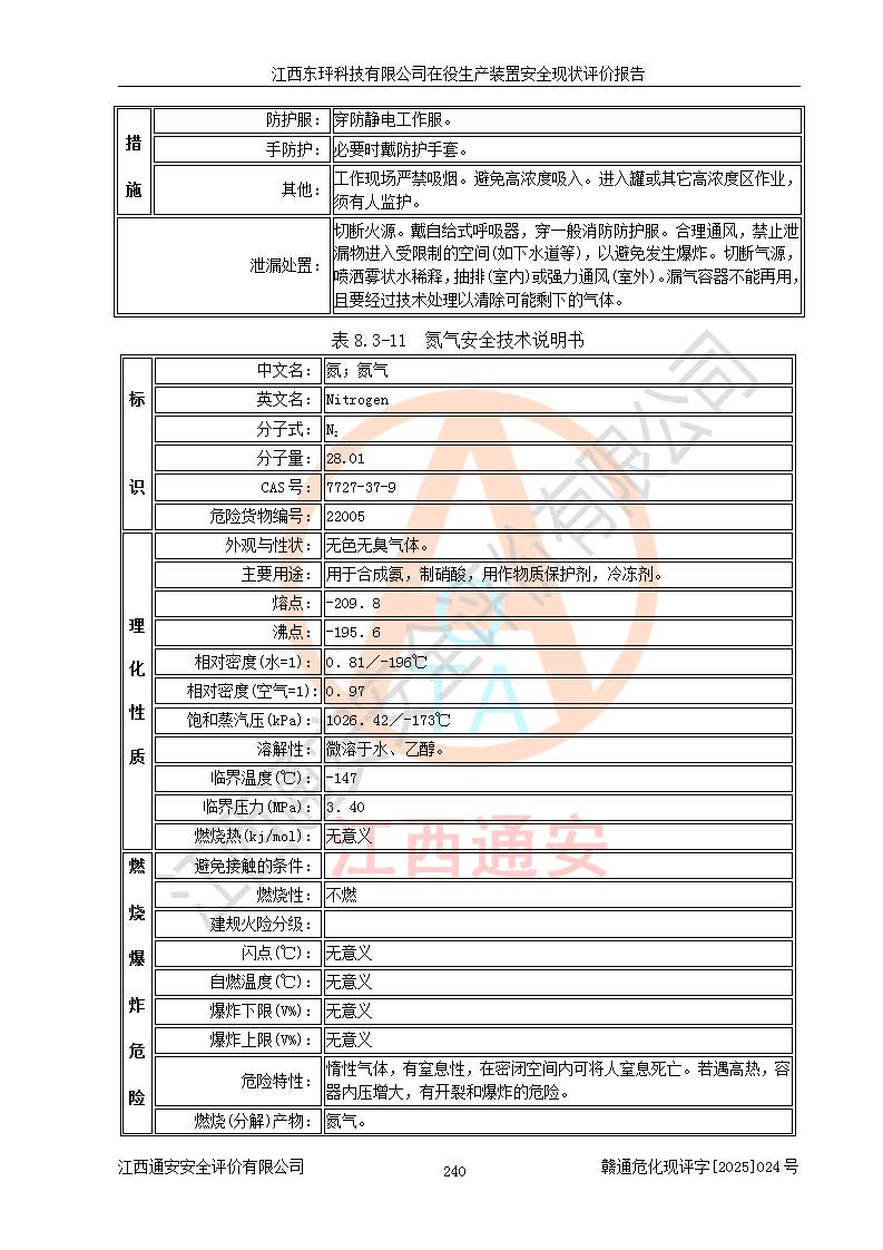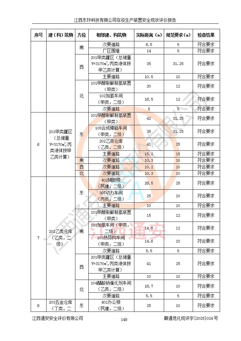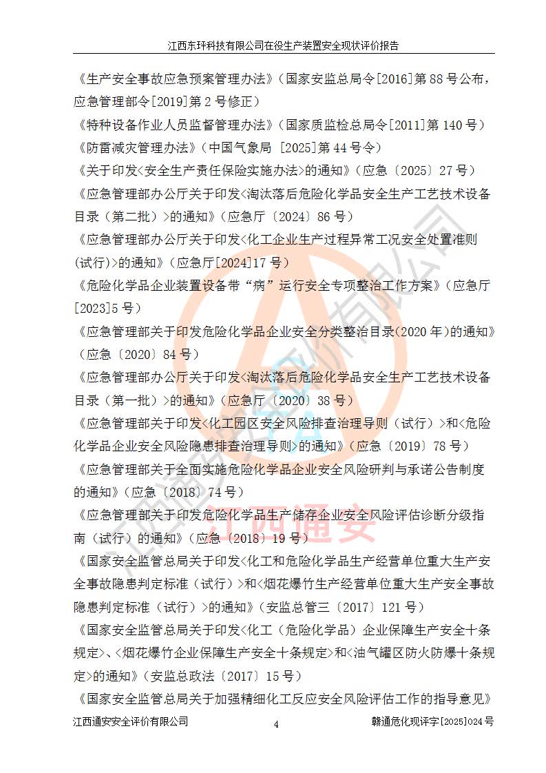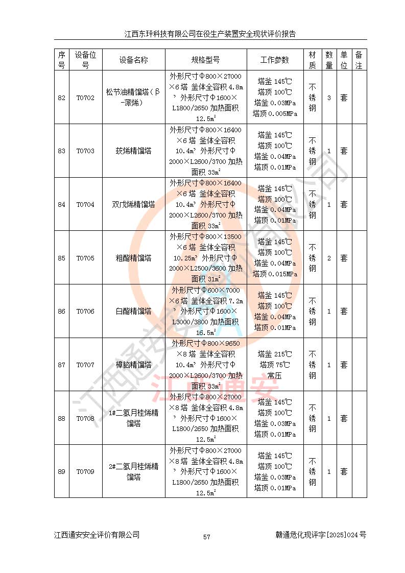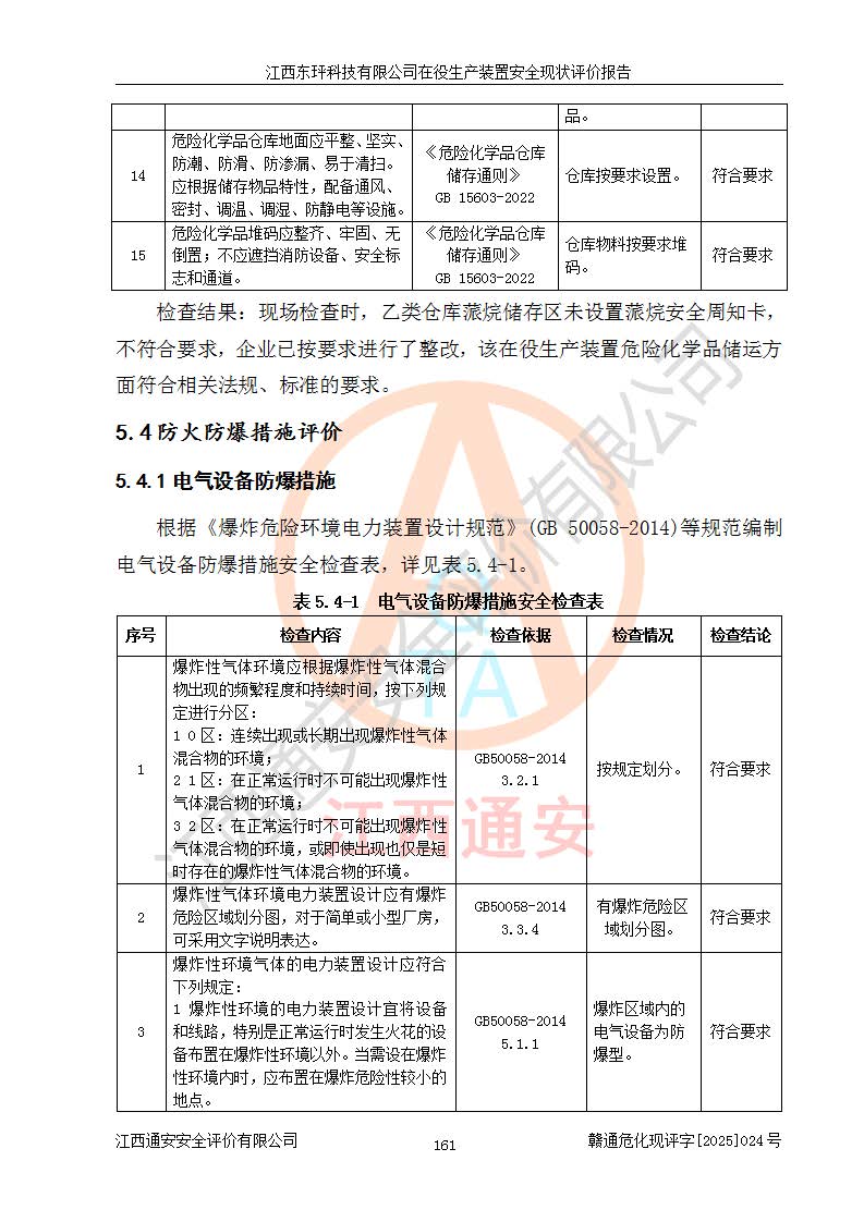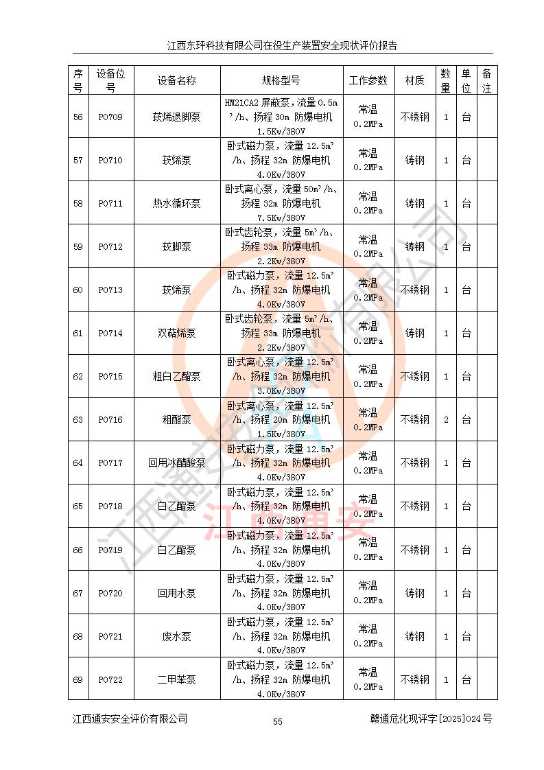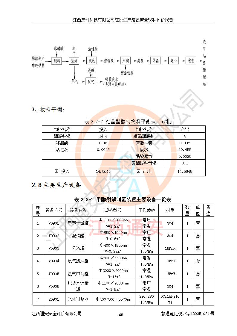 江西东玶科技有限公司位于江西省吉安市吉水县城西工业园区,法定**人为徐东,成立于2018年04月08日,注册资本叁仟贰佰叁拾万元整,经营范围为合成樟脑、α-蒎烯、β-蒎烯、二氢月桂烯(含月桂烯)、莰烯、双戊烯、氢气(中间产品)的制造加工(凭**批准证书经营);白乙酯、双萜烯等合成香料的制造加工等。 江西东玶科技有限公司2022年08月01日取得了《安全生产许可证》,许可证编号:(赣)WH安许证字[2022]1160号,许可范围为合成樟脑(2000t/a)、二氢月桂烯(1000t/a)、月桂烯(3200t/a)、莰烯(1000t/a)、双戊烯(810t/a)、双萜烯(1070t/a)、α-蒎烯(7500t/a)、β-蒎烯(3200t/a)、白乙酯(500t/a),**期为2022年08月01日至2025年07月31日。该公司2023年5月29日取得了三级安全生产标准化证书,证书编号:赣AQBWHⅢ202300036,**期至2026年5月。该公司现有员工53人,其中专职安全生产管理人员2人。 因生产经营需要,江西东玶科技有限公司实施了年产12000吨松节油深加工系列产品项目(二期),并将二氢月桂烯的设计生产规模2000t/a变更为1500t/a,减少中间产品蒎烷的消耗量,剩余的蒎烷(720t/a)作为产品销售。江西东玶科技有限公司委托深圳天阳工程设计有限公司进行了设计变更,按程序要求进行了试生产,委托评价公司编制了安全验收评价报告,并于2025年1月16日组织专家组和相关单位进行了验收。验收完成后,江西东玶科技有限公司2025年06月04日对《安全生产许可证》进行了变更,许可范围变更为合成樟脑(2000t/a)、二氢月桂烯(1500t/a)、月桂烯(3200t/a)、莰烯(1000t/a)、双戊烯(902.5t/a)、双萜烯(1200.7t/a)、α-蒎烯(7500t/a)、β-蒎烯(3200t/a)、白乙酯(500t/a)、蒎烷(中间产品,720t/a)。 江西东玶科技有限公司在役生产装置生产过程中涉及的主要原辅材料为松节油、乙酸、液碱、甲醇、碳酸钠、二甲苯、偏钛酸、甲酸、硫酸铜、雷尼镍、离子膜、天然气、氮气,中间产品为氢气、α-蒎烯、β-蒎烯、蒎烷,产品为合成樟脑、二氢月桂烯、月桂烯、莰烯、双戊烯、白乙酯、双萜烯,副产品为醋酸钠。根据《危险化学品目录》,该在役生产装置涉及的松节油、乙酸、液碱、甲醇、二甲苯、甲酸、雷尼镍、天然气(燃料)、氮气(压缩的)、柴油,中间产品α-蒎烯、β-蒎烯、氢气、蒎烷和产品中合成樟脑、二氢月桂烯、月桂烯、莰烯、双戊烯属于危险化学品。经辨识,甲醇、氢气和天然气(燃料)属于重点监管的危险化学品,甲醇属于特别管控的危险化学品,不涉及监控化学品、易制毒化学品、易制爆危险化学品、剧毒化学品和高毒物品,生产、储存单元不构成危险化学品重大危险源,涉及的加氢工艺属于重点监管的危险化工工艺。根据生产工艺特点及物料的理化特性可知,该在役生产装置生产过程中存在火灾与爆炸、中毒与窒息、触电、机械伤害、灼烫等危险有害因素。 该公司自2022年08月01日取得安全生产许可证以来,生产运行正常,未发生一般及以上生产安全事故。 |