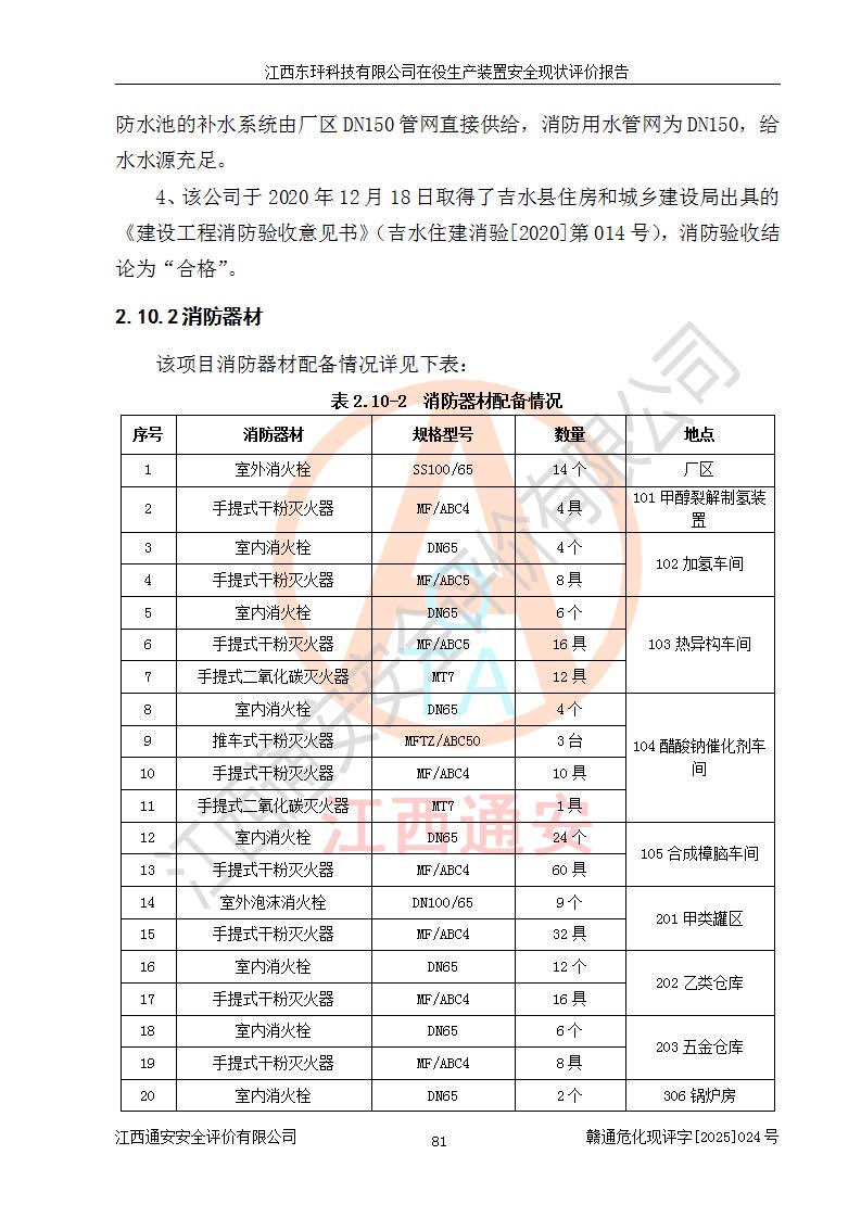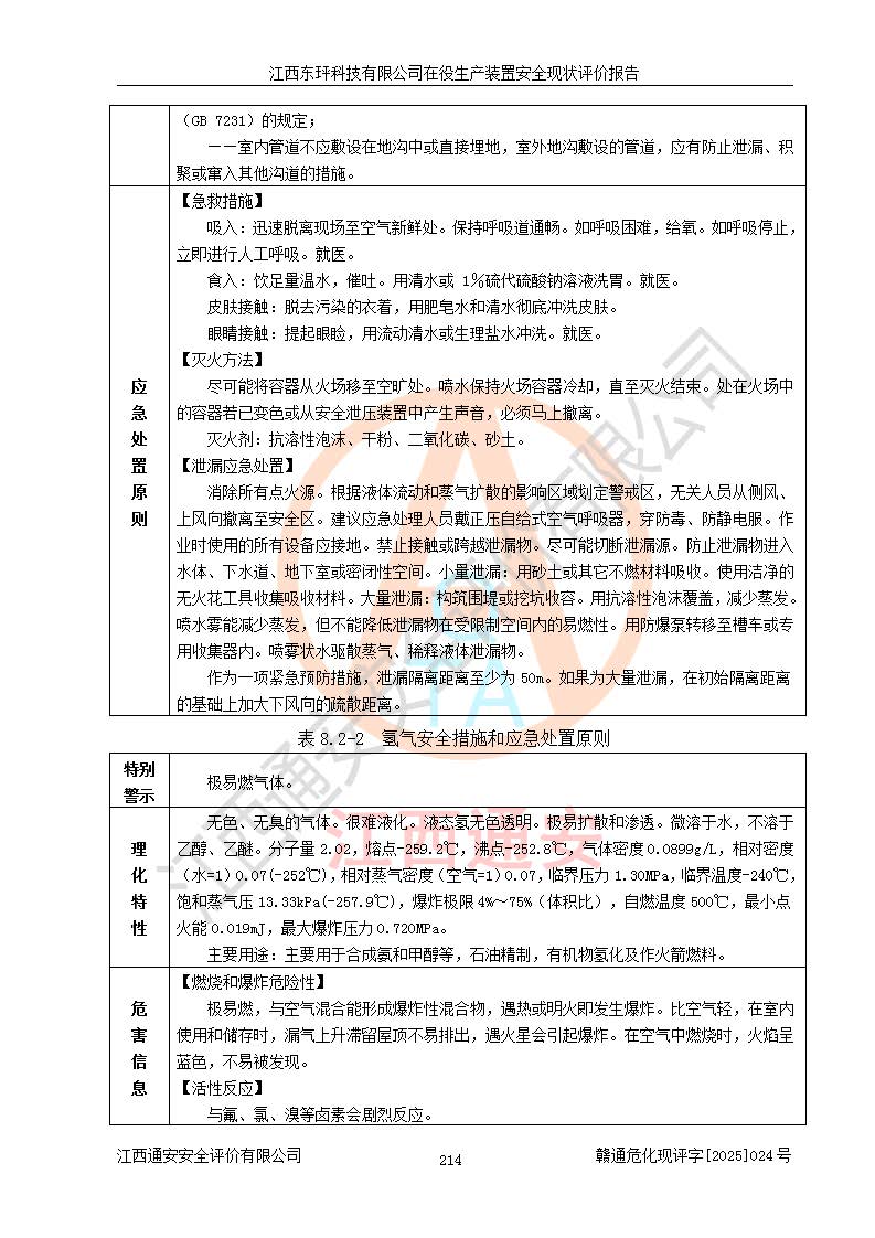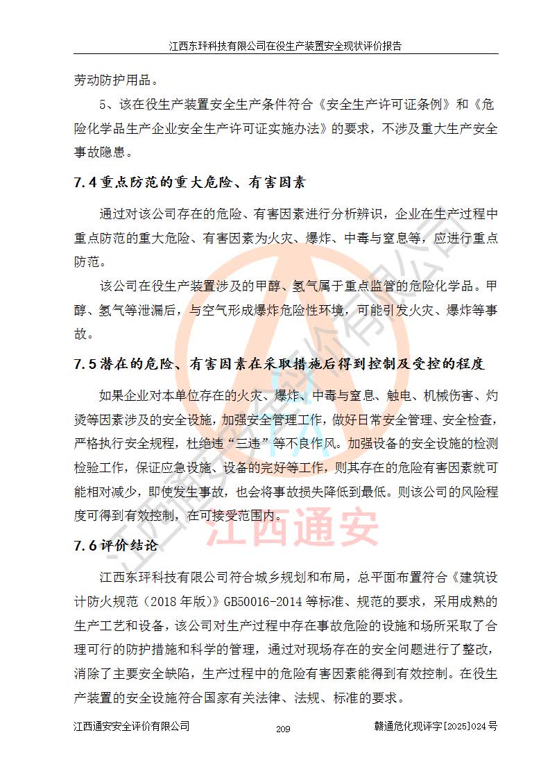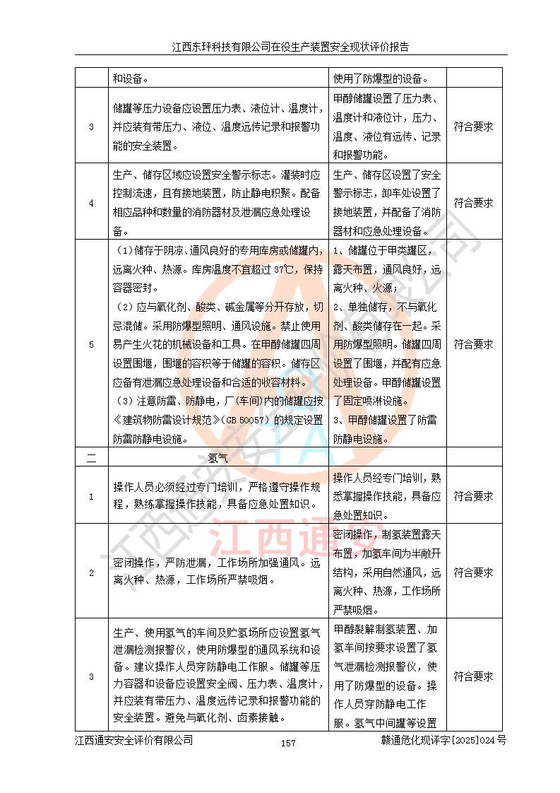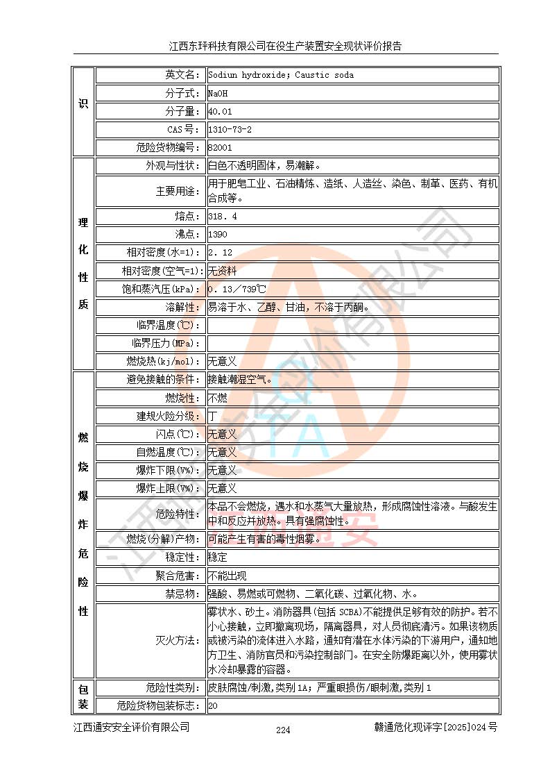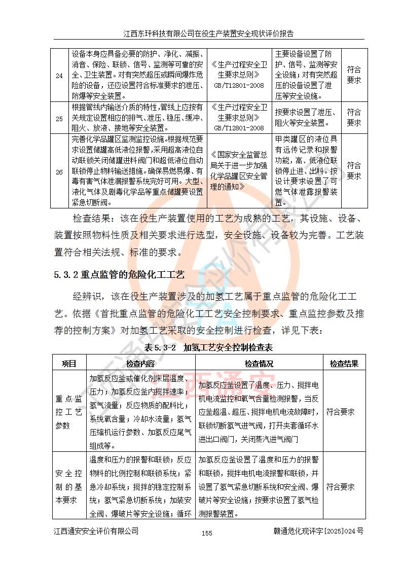 江西东玶科技有限公司位于江西省吉安市吉水县城西工业园区,法定**人为徐东,成立于2018年04月08日,注册资本叁仟贰佰叁拾万元整,经营范围为合成樟脑、α-蒎烯、β-蒎烯、二氢月桂烯(含月桂烯)、莰烯、双戊烯、氢气(中间产品)的制造加工(凭**批准证书经营);白乙酯、双萜烯等合成香料的制造加工等。 江西东玶科技有限公司2022年08月01日取得了《安全生产许可证》,许可证编号:(赣)WH安许证字[2022]1160号,许可范围为合成樟脑(2000t/a)、二氢月桂烯(1000t/a)、月桂烯(3200t/a)、莰烯(1000t/a)、双戊烯(810t/a)、双萜烯(1070t/a)、α-蒎烯(7500t/a)、β-蒎烯(3200t/a)、白乙酯(500t/a),**期为2022年08月01日至2025年07月31日。该公司2023年5月29日取得了三级安全生产标准化证书,证书编号:赣AQBWHⅢ202300036,**期至2026年5月。该公司现有员工53人,其中专职安全生产管理人员2人。 因生产经营需要,江西东玶科技有限公司实施了年产12000吨松节油深加工系列产品项目(二期),并将二氢月桂烯的设计生产规模2000t/a变更为1500t/a,减少中间产品蒎烷的消耗量,剩余的蒎烷(720t/a)作为产品销售。江西东玶科技有限公司委托深圳天阳工程设计有限公司进行了设计变更,按程序要求进行了试生产,委托评价公司编制了安全验收评价报告,并于2025年1月16日组织专家组和相关单位进行了验收。验收完成后,江西东玶科技有限公司2025年06月04日对《安全生产许可证》进行了变更,许可范围变更为合成樟脑(2000t/a)、二氢月桂烯(1500t/a)、月桂烯(3200t/a)、莰烯(1000t/a)、双戊烯(902.5t/a)、双萜烯(1200.7t/a)、α-蒎烯(7500t/a)、β-蒎烯(3200t/a)、白乙酯(500t/a)、蒎烷(中间产品,720t/a)。 江西东玶科技有限公司在役生产装置生产过程中涉及的主要原辅材料为松节油、乙酸、液碱、甲醇、碳酸钠、二甲苯、偏钛酸、甲酸、硫酸铜、雷尼镍、离子膜、天然气、氮气,中间产品为氢气、α-蒎烯、β-蒎烯、蒎烷,产品为合成樟脑、二氢月桂烯、月桂烯、莰烯、双戊烯、白乙酯、双萜烯,副产品为醋酸钠。根据《危险化学品目录》,该在役生产装置涉及的松节油、乙酸、液碱、甲醇、二甲苯、甲酸、雷尼镍、天然气(燃料)、氮气(压缩的)、柴油,中间产品α-蒎烯、β-蒎烯、氢气、蒎烷和产品中合成樟脑、二氢月桂烯、月桂烯、莰烯、双戊烯属于危险化学品。经辨识,甲醇、氢气和天然气(燃料)属于重点监管的危险化学品,甲醇属于特别管控的危险化学品,不涉及监控化学品、易制毒化学品、易制爆危险化学品、剧毒化学品和高毒物品,生产、储存单元不构成危险化学品重大危险源,涉及的加氢工艺属于重点监管的危险化工工艺。根据生产工艺特点及物料的理化特性可知,该在役生产装置生产过程中存在火灾与爆炸、中毒与窒息、触电、机械伤害、灼烫等危险有害因素。 该公司自2022年08月01日取得安全生产许可证以来,生产运行正常,未发生一般及以上生产安全事故。 |