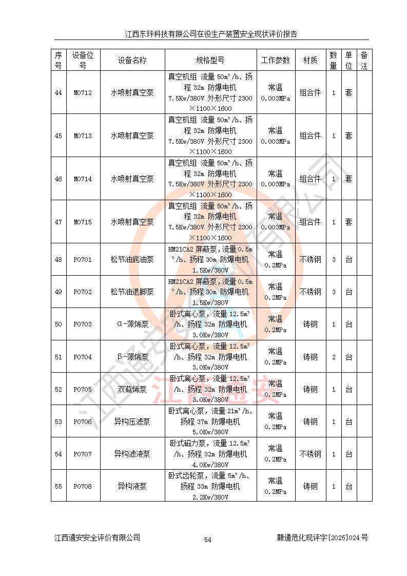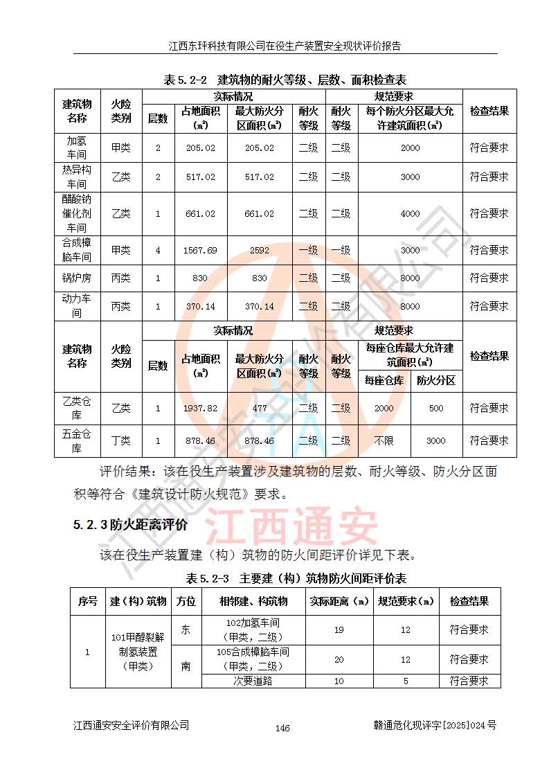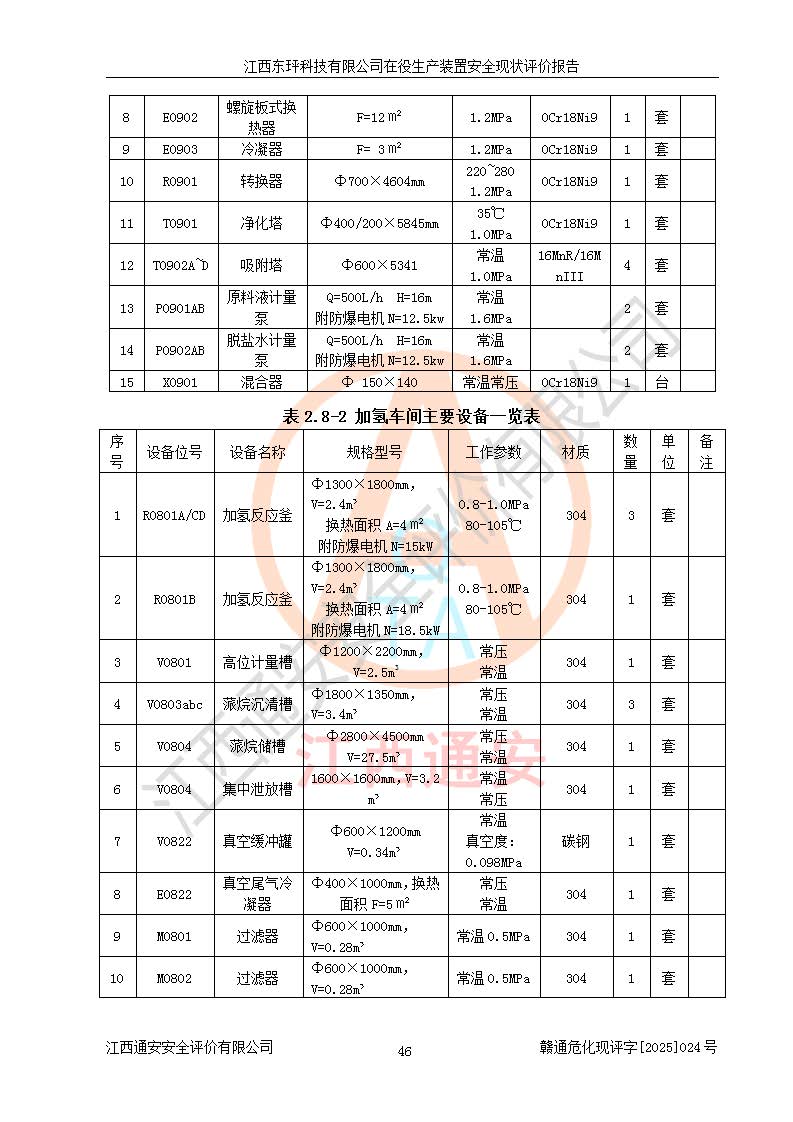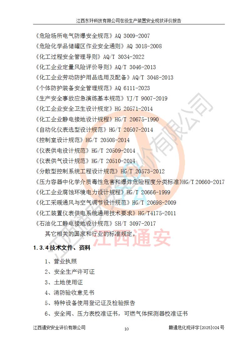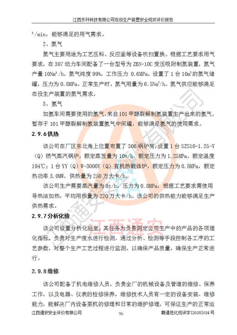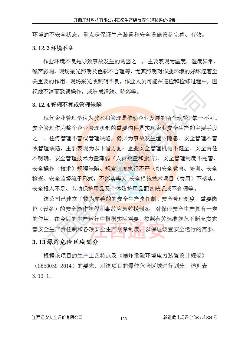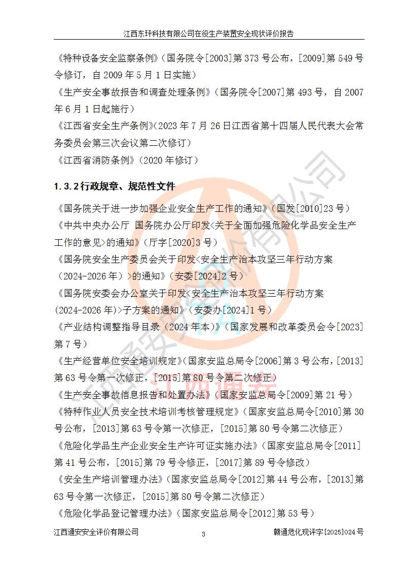 江西东玶科技有限公司位于江西省吉安市吉水县城西工业园区,法定**人为徐东,成立于2018年04月08日,注册资本叁仟贰佰叁拾万元整,经营范围为合成樟脑、α-蒎烯、β-蒎烯、二氢月桂烯(含月桂烯)、莰烯、双戊烯、氢气(中间产品)的制造加工(凭**批准证书经营);白乙酯、双萜烯等合成香料的制造加工等。 江西东玶科技有限公司2022年08月01日取得了《安全生产许可证》,许可证编号:(赣)WH安许证字[2022]1160号,许可范围为合成樟脑(2000t/a)、二氢月桂烯(1000t/a)、月桂烯(3200t/a)、莰烯(1000t/a)、双戊烯(810t/a)、双萜烯(1070t/a)、α-蒎烯(7500t/a)、β-蒎烯(3200t/a)、白乙酯(500t/a),**期为2022年08月01日至2025年07月31日。该公司2023年5月29日取得了三级安全生产标准化证书,证书编号:赣AQBWHⅢ202300036,**期至2026年5月。该公司现有员工53人,其中专职安全生产管理人员2人。 因生产经营需要,江西东玶科技有限公司实施了年产12000吨松节油深加工系列产品项目(二期),并将二氢月桂烯的设计生产规模2000t/a变更为1500t/a,减少中间产品蒎烷的消耗量,剩余的蒎烷(720t/a)作为产品销售。江西东玶科技有限公司委托深圳天阳工程设计有限公司进行了设计变更,按程序要求进行了试生产,委托评价公司编制了安全验收评价报告,并于2025年1月16日组织专家组和相关单位进行了验收。验收完成后,江西东玶科技有限公司2025年06月04日对《安全生产许可证》进行了变更,许可范围变更为合成樟脑(2000t/a)、二氢月桂烯(1500t/a)、月桂烯(3200t/a)、莰烯(1000t/a)、双戊烯(902.5t/a)、双萜烯(1200.7t/a)、α-蒎烯(7500t/a)、β-蒎烯(3200t/a)、白乙酯(500t/a)、蒎烷(中间产品,720t/a)。 江西东玶科技有限公司在役生产装置生产过程中涉及的主要原辅材料为松节油、乙酸、液碱、甲醇、碳酸钠、二甲苯、偏钛酸、甲酸、硫酸铜、雷尼镍、离子膜、天然气、氮气,中间产品为氢气、α-蒎烯、β-蒎烯、蒎烷,产品为合成樟脑、二氢月桂烯、月桂烯、莰烯、双戊烯、白乙酯、双萜烯,副产品为醋酸钠。根据《危险化学品目录》,该在役生产装置涉及的松节油、乙酸、液碱、甲醇、二甲苯、甲酸、雷尼镍、天然气(燃料)、氮气(压缩的)、柴油,中间产品α-蒎烯、β-蒎烯、氢气、蒎烷和产品中合成樟脑、二氢月桂烯、月桂烯、莰烯、双戊烯属于危险化学品。经辨识,甲醇、氢气和天然气(燃料)属于重点监管的危险化学品,甲醇属于特别管控的危险化学品,不涉及监控化学品、易制毒化学品、易制爆危险化学品、剧毒化学品和高毒物品,生产、储存单元不构成危险化学品重大危险源,涉及的加氢工艺属于重点监管的危险化工工艺。根据生产工艺特点及物料的理化特性可知,该在役生产装置生产过程中存在火灾与爆炸、中毒与窒息、触电、机械伤害、灼烫等危险有害因素。 该公司自2022年08月01日取得安全生产许可证以来,生产运行正常,未发生一般及以上生产安全事故。 |