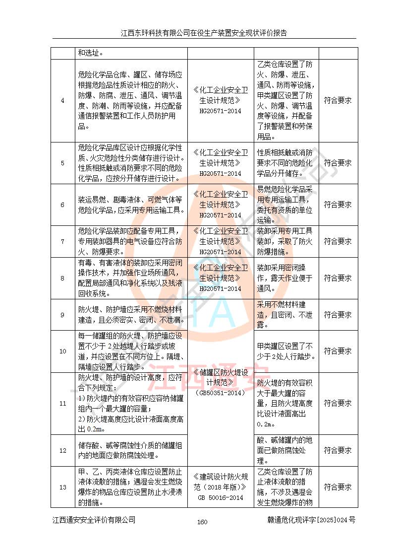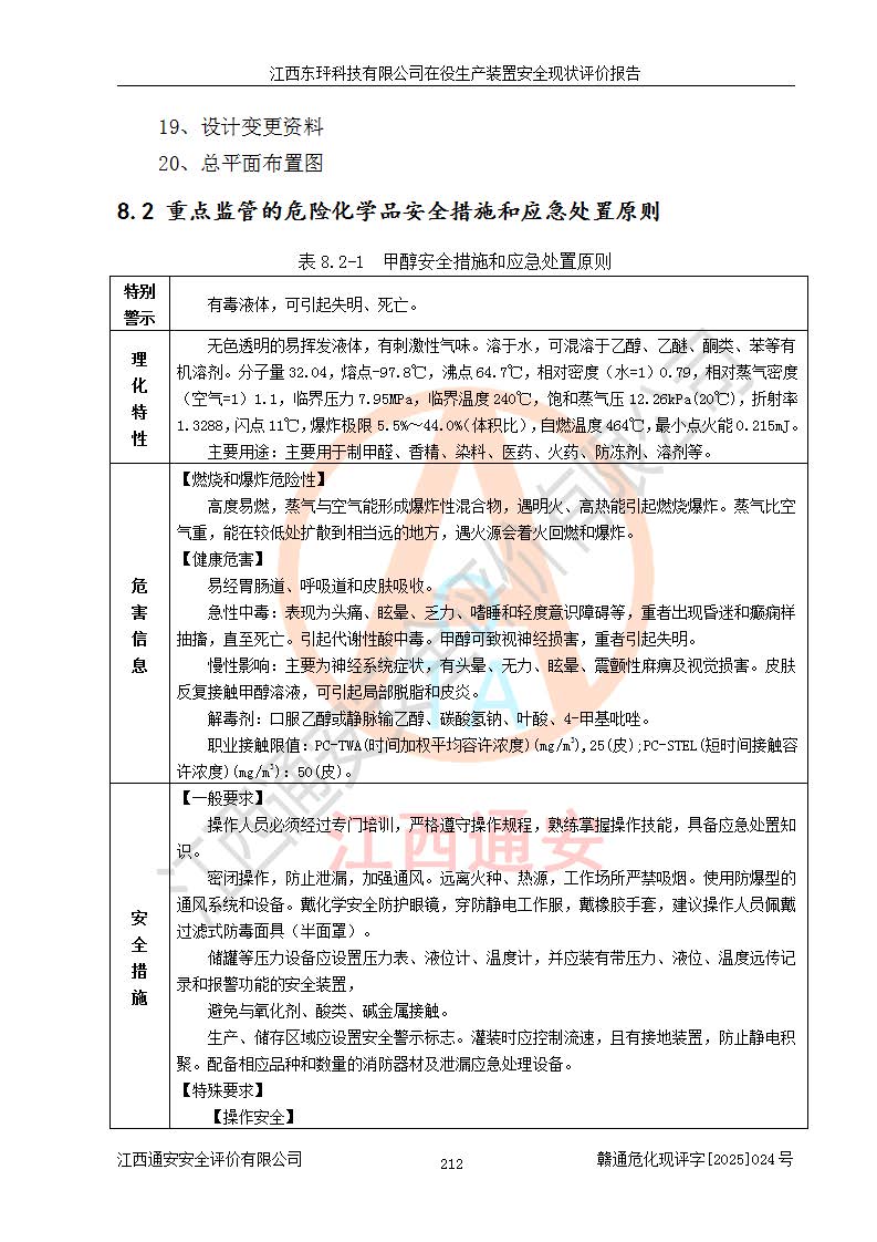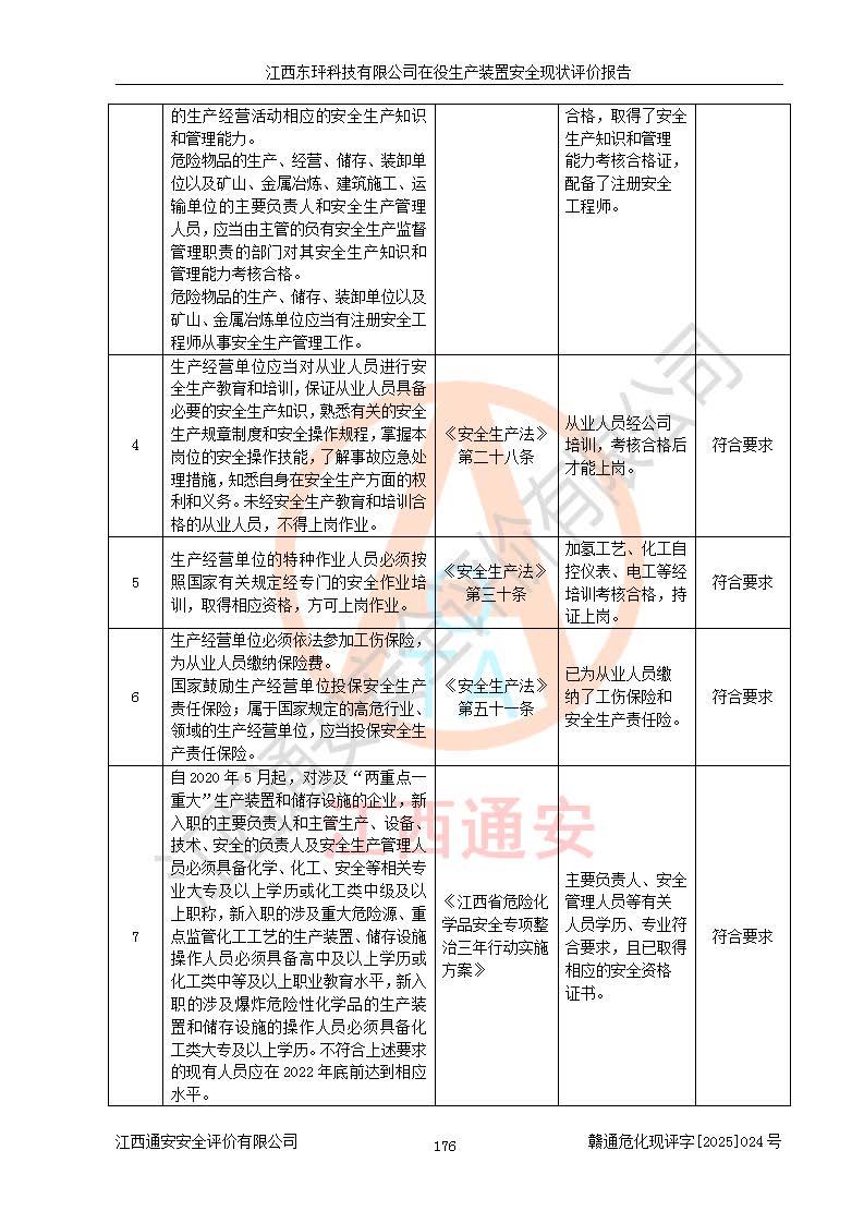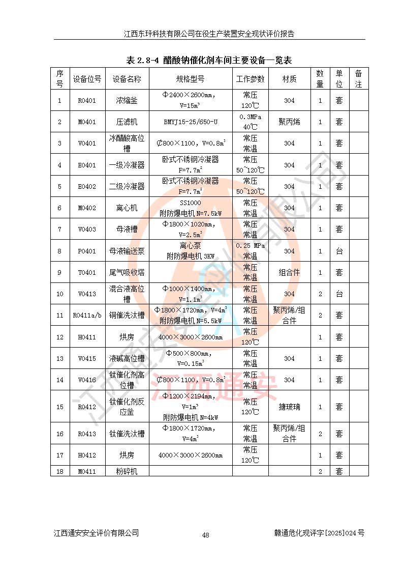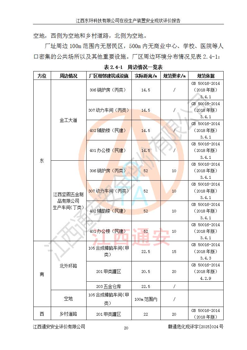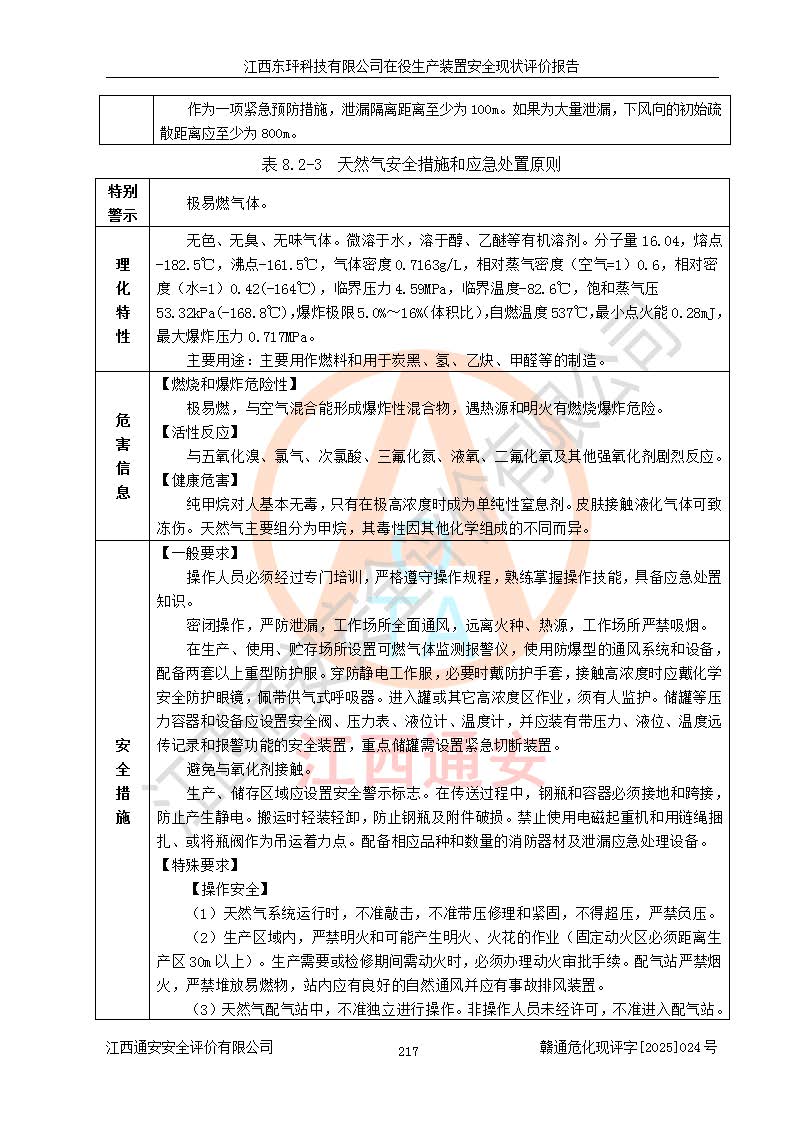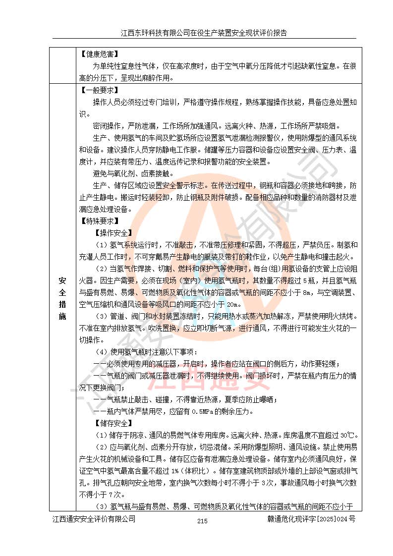 江西东玶科技有限公司位于江西省吉安市吉水县城西工业园区,法定**人为徐东,成立于2018年04月08日,注册资本叁仟贰佰叁拾万元整,经营范围为合成樟脑、α-蒎烯、β-蒎烯、二氢月桂烯(含月桂烯)、莰烯、双戊烯、氢气(中间产品)的制造加工(凭**批准证书经营);白乙酯、双萜烯等合成香料的制造加工等。 江西东玶科技有限公司2022年08月01日取得了《安全生产许可证》,许可证编号:(赣)WH安许证字[2022]1160号,许可范围为合成樟脑(2000t/a)、二氢月桂烯(1000t/a)、月桂烯(3200t/a)、莰烯(1000t/a)、双戊烯(810t/a)、双萜烯(1070t/a)、α-蒎烯(7500t/a)、β-蒎烯(3200t/a)、白乙酯(500t/a),**期为2022年08月01日至2025年07月31日。该公司2023年5月29日取得了三级安全生产标准化证书,证书编号:赣AQBWHⅢ202300036,**期至2026年5月。该公司现有员工53人,其中专职安全生产管理人员2人。 因生产经营需要,江西东玶科技有限公司实施了年产12000吨松节油深加工系列产品项目(二期),并将二氢月桂烯的设计生产规模2000t/a变更为1500t/a,减少中间产品蒎烷的消耗量,剩余的蒎烷(720t/a)作为产品销售。江西东玶科技有限公司委托深圳天阳工程设计有限公司进行了设计变更,按程序要求进行了试生产,委托评价公司编制了安全验收评价报告,并于2025年1月16日组织专家组和相关单位进行了验收。验收完成后,江西东玶科技有限公司2025年06月04日对《安全生产许可证》进行了变更,许可范围变更为合成樟脑(2000t/a)、二氢月桂烯(1500t/a)、月桂烯(3200t/a)、莰烯(1000t/a)、双戊烯(902.5t/a)、双萜烯(1200.7t/a)、α-蒎烯(7500t/a)、β-蒎烯(3200t/a)、白乙酯(500t/a)、蒎烷(中间产品,720t/a)。 江西东玶科技有限公司在役生产装置生产过程中涉及的主要原辅材料为松节油、乙酸、液碱、甲醇、碳酸钠、二甲苯、偏钛酸、甲酸、硫酸铜、雷尼镍、离子膜、天然气、氮气,中间产品为氢气、α-蒎烯、β-蒎烯、蒎烷,产品为合成樟脑、二氢月桂烯、月桂烯、莰烯、双戊烯、白乙酯、双萜烯,副产品为醋酸钠。根据《危险化学品目录》,该在役生产装置涉及的松节油、乙酸、液碱、甲醇、二甲苯、甲酸、雷尼镍、天然气(燃料)、氮气(压缩的)、柴油,中间产品α-蒎烯、β-蒎烯、氢气、蒎烷和产品中合成樟脑、二氢月桂烯、月桂烯、莰烯、双戊烯属于危险化学品。经辨识,甲醇、氢气和天然气(燃料)属于重点监管的危险化学品,甲醇属于特别管控的危险化学品,不涉及监控化学品、易制毒化学品、易制爆危险化学品、剧毒化学品和高毒物品,生产、储存单元不构成危险化学品重大危险源,涉及的加氢工艺属于重点监管的危险化工工艺。根据生产工艺特点及物料的理化特性可知,该在役生产装置生产过程中存在火灾与爆炸、中毒与窒息、触电、机械伤害、灼烫等危险有害因素。 该公司自2022年08月01日取得安全生产许可证以来,生产运行正常,未发生一般及以上生产安全事故。 |