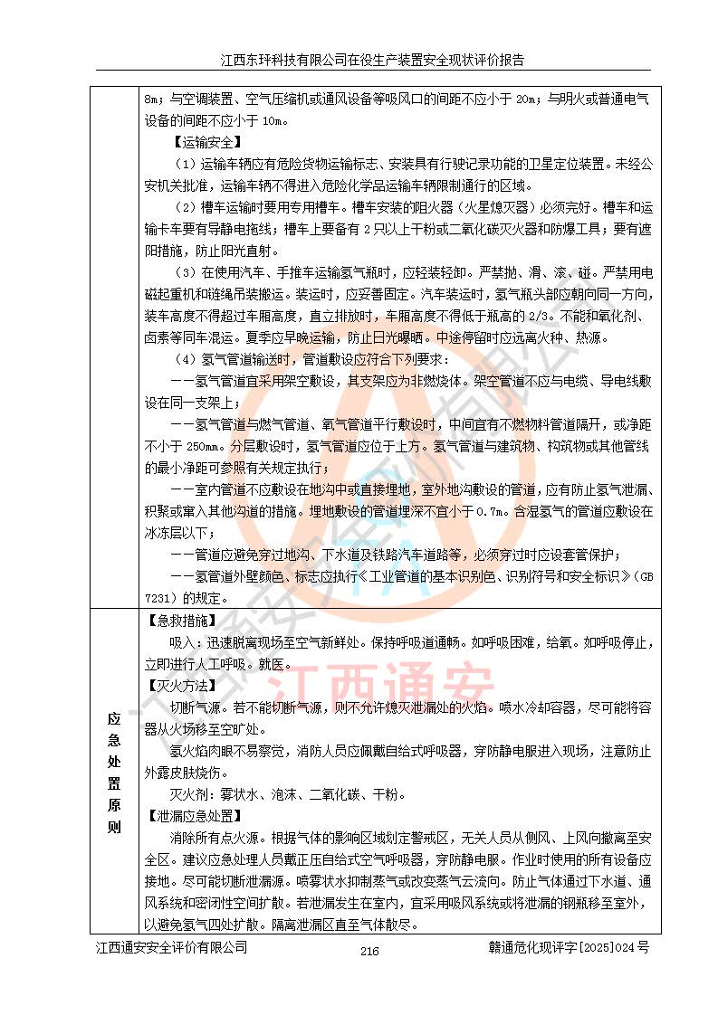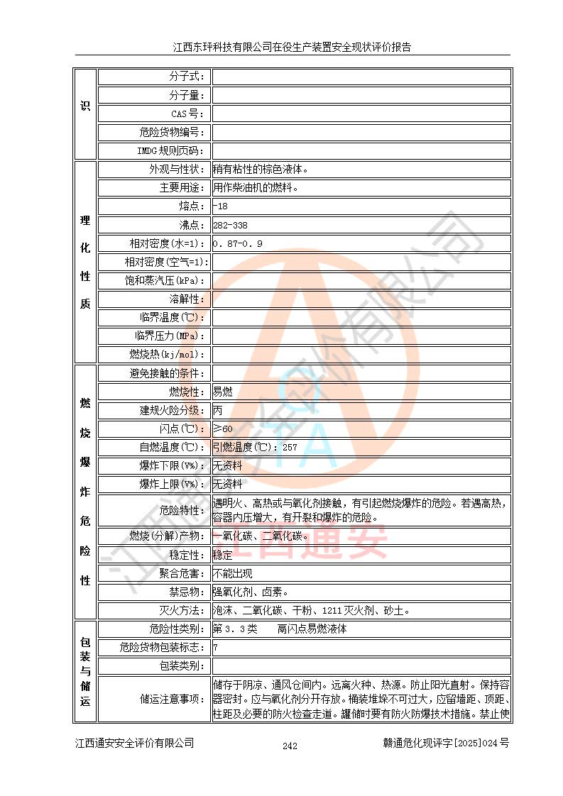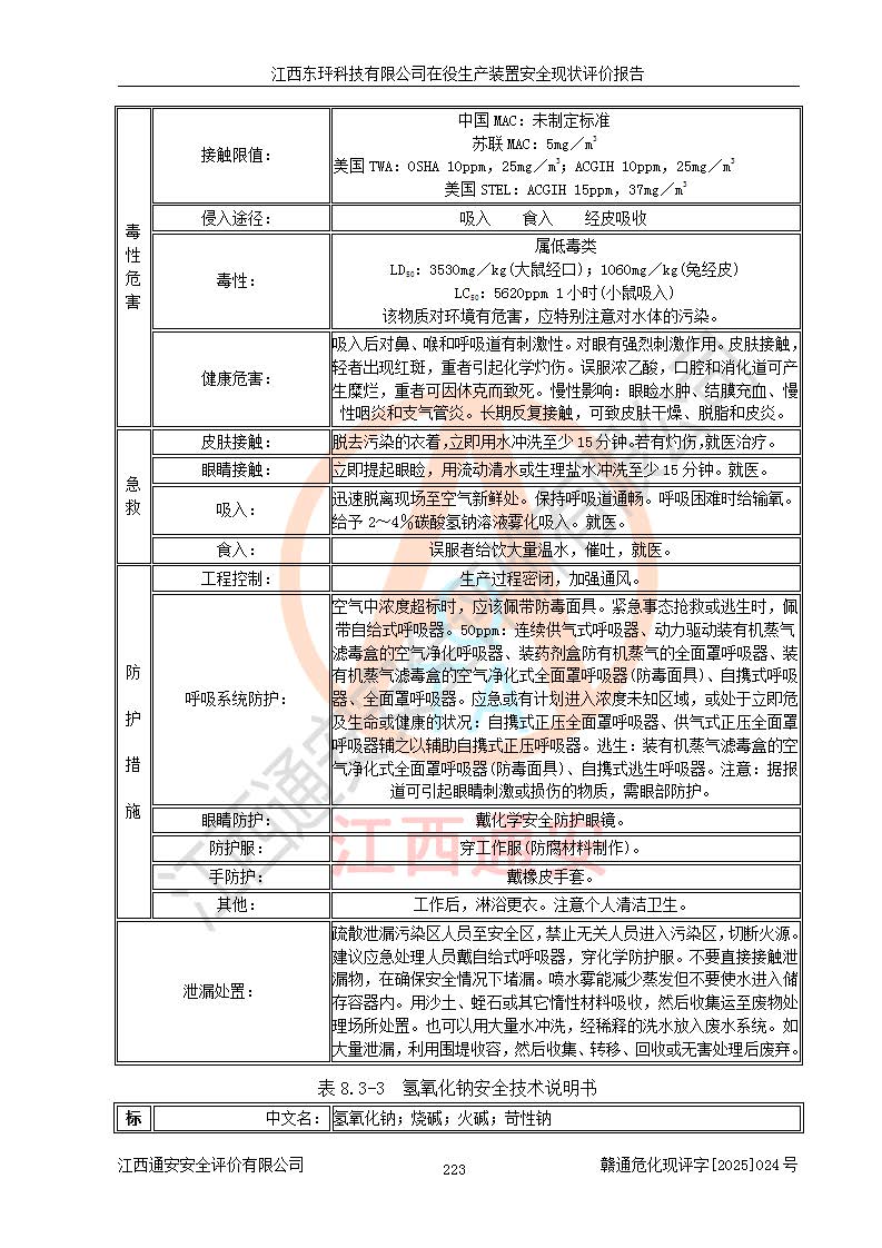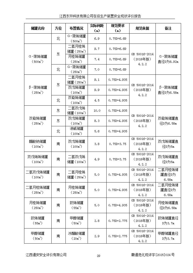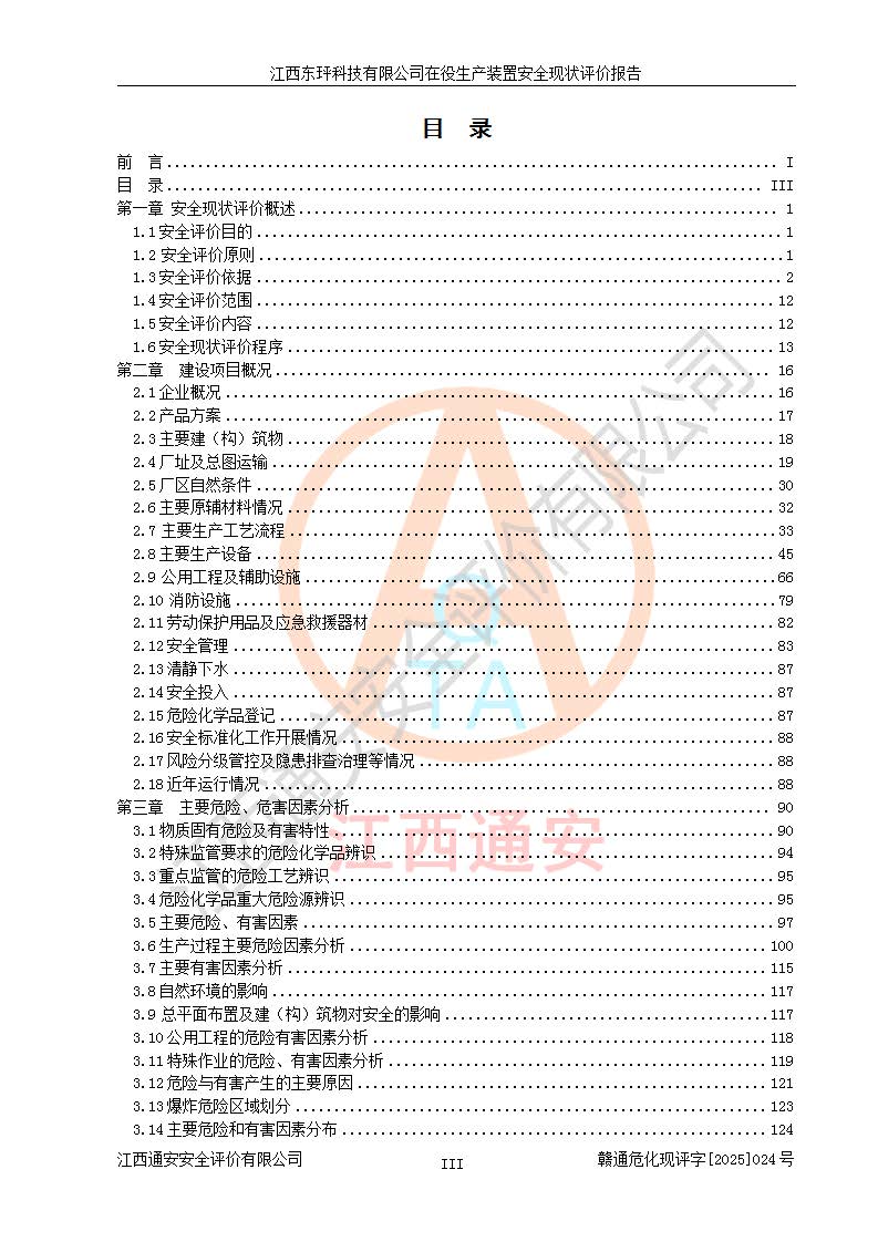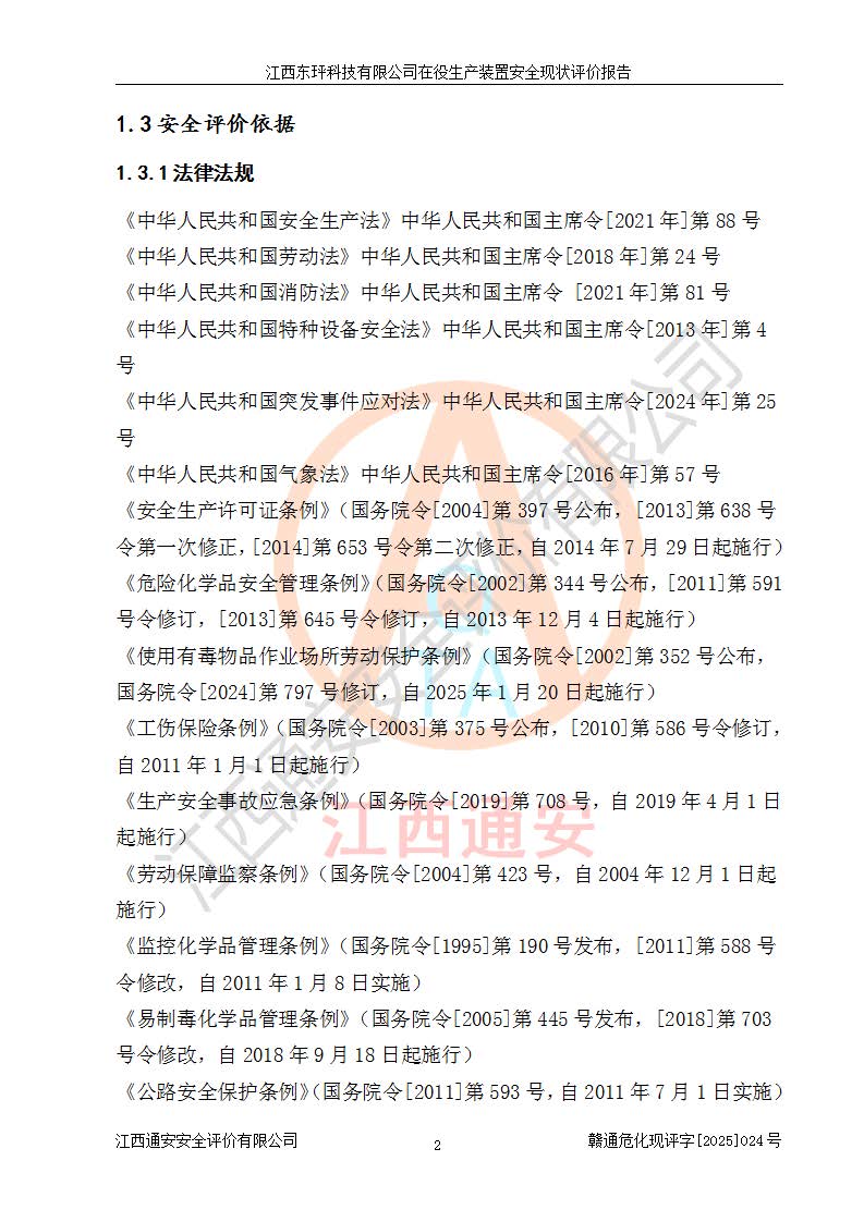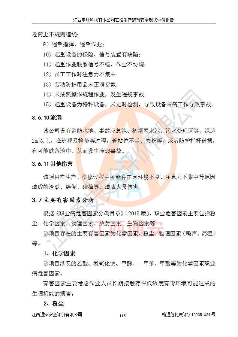 江西东玶科技有限公司位于江西省吉安市吉水县城西工业园区,法定**人为徐东,成立于2018年04月08日,注册资本叁仟贰佰叁拾万元整,经营范围为合成樟脑、α-蒎烯、β-蒎烯、二氢月桂烯(含月桂烯)、莰烯、双戊烯、氢气(中间产品)的制造加工(凭**批准证书经营);白乙酯、双萜烯等合成香料的制造加工等。 江西东玶科技有限公司2022年08月01日取得了《安全生产许可证》,许可证编号:(赣)WH安许证字[2022]1160号,许可范围为合成樟脑(2000t/a)、二氢月桂烯(1000t/a)、月桂烯(3200t/a)、莰烯(1000t/a)、双戊烯(810t/a)、双萜烯(1070t/a)、α-蒎烯(7500t/a)、β-蒎烯(3200t/a)、白乙酯(500t/a),**期为2022年08月01日至2025年07月31日。该公司2023年5月29日取得了三级安全生产标准化证书,证书编号:赣AQBWHⅢ202300036,**期至2026年5月。该公司现有员工53人,其中专职安全生产管理人员2人。 因生产经营需要,江西东玶科技有限公司实施了年产12000吨松节油深加工系列产品项目(二期),并将二氢月桂烯的设计生产规模2000t/a变更为1500t/a,减少中间产品蒎烷的消耗量,剩余的蒎烷(720t/a)作为产品销售。江西东玶科技有限公司委托深圳天阳工程设计有限公司进行了设计变更,按程序要求进行了试生产,委托评价公司编制了安全验收评价报告,并于2025年1月16日组织专家组和相关单位进行了验收。验收完成后,江西东玶科技有限公司2025年06月04日对《安全生产许可证》进行了变更,许可范围变更为合成樟脑(2000t/a)、二氢月桂烯(1500t/a)、月桂烯(3200t/a)、莰烯(1000t/a)、双戊烯(902.5t/a)、双萜烯(1200.7t/a)、α-蒎烯(7500t/a)、β-蒎烯(3200t/a)、白乙酯(500t/a)、蒎烷(中间产品,720t/a)。 江西东玶科技有限公司在役生产装置生产过程中涉及的主要原辅材料为松节油、乙酸、液碱、甲醇、碳酸钠、二甲苯、偏钛酸、甲酸、硫酸铜、雷尼镍、离子膜、天然气、氮气,中间产品为氢气、α-蒎烯、β-蒎烯、蒎烷,产品为合成樟脑、二氢月桂烯、月桂烯、莰烯、双戊烯、白乙酯、双萜烯,副产品为醋酸钠。根据《危险化学品目录》,该在役生产装置涉及的松节油、乙酸、液碱、甲醇、二甲苯、甲酸、雷尼镍、天然气(燃料)、氮气(压缩的)、柴油,中间产品α-蒎烯、β-蒎烯、氢气、蒎烷和产品中合成樟脑、二氢月桂烯、月桂烯、莰烯、双戊烯属于危险化学品。经辨识,甲醇、氢气和天然气(燃料)属于重点监管的危险化学品,甲醇属于特别管控的危险化学品,不涉及监控化学品、易制毒化学品、易制爆危险化学品、剧毒化学品和高毒物品,生产、储存单元不构成危险化学品重大危险源,涉及的加氢工艺属于重点监管的危险化工工艺。根据生产工艺特点及物料的理化特性可知,该在役生产装置生产过程中存在火灾与爆炸、中毒与窒息、触电、机械伤害、灼烫等危险有害因素。 该公司自2022年08月01日取得安全生产许可证以来,生产运行正常,未发生一般及以上生产安全事故。 |
