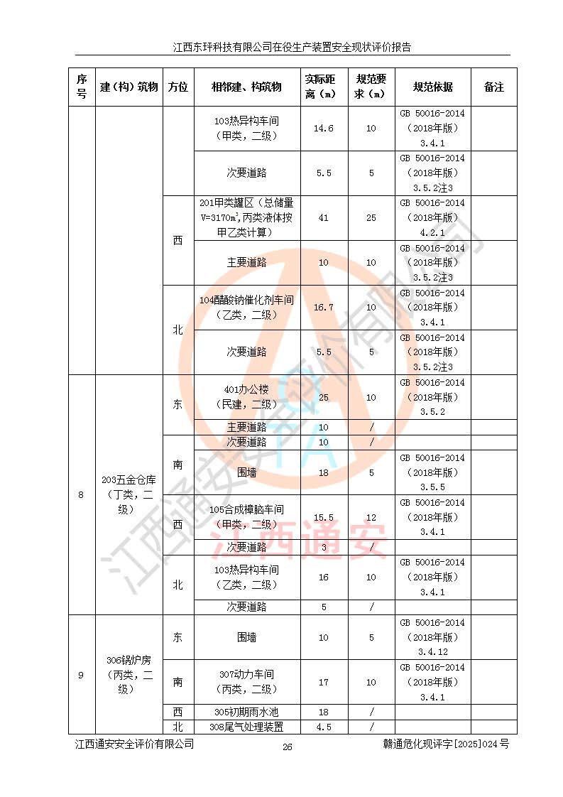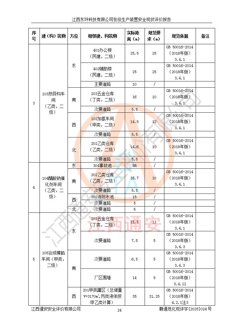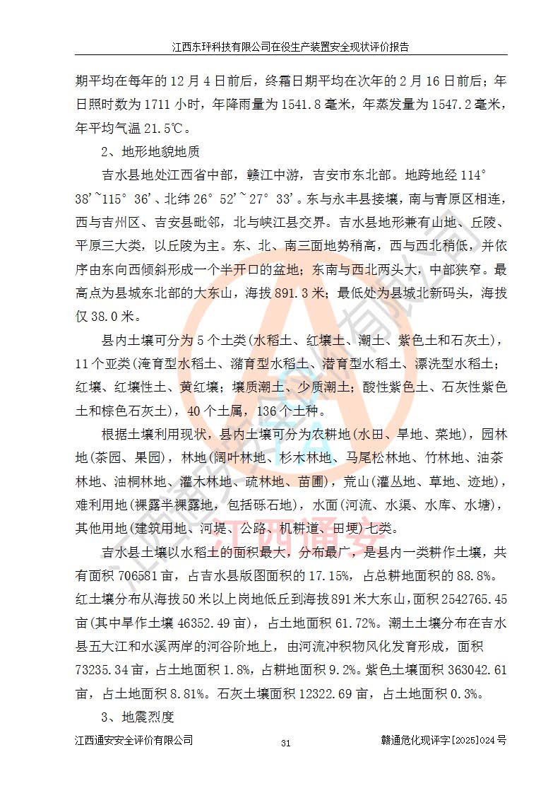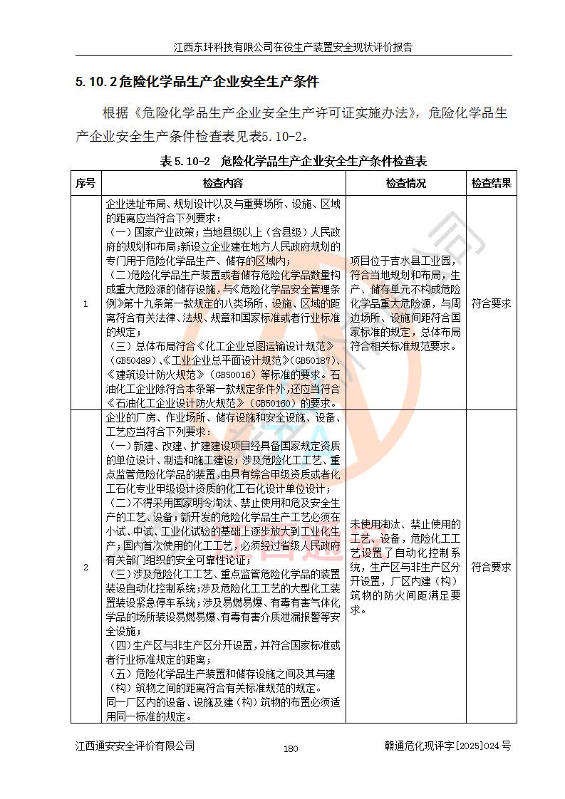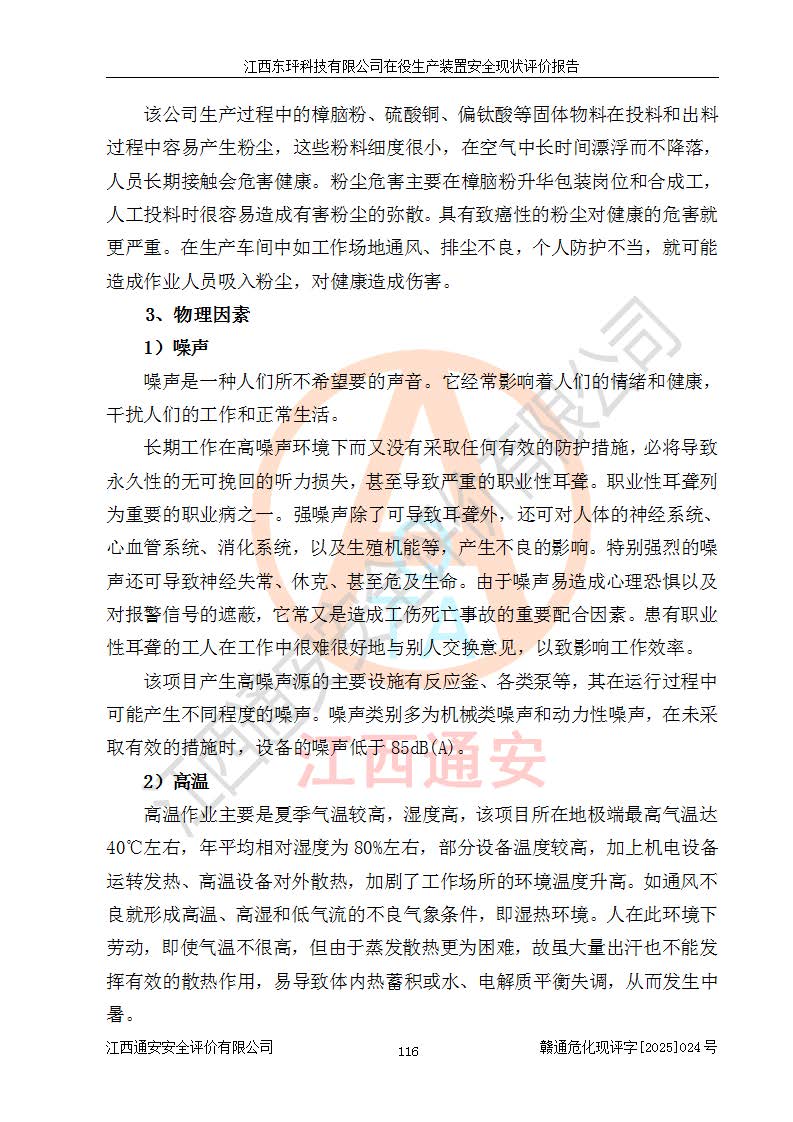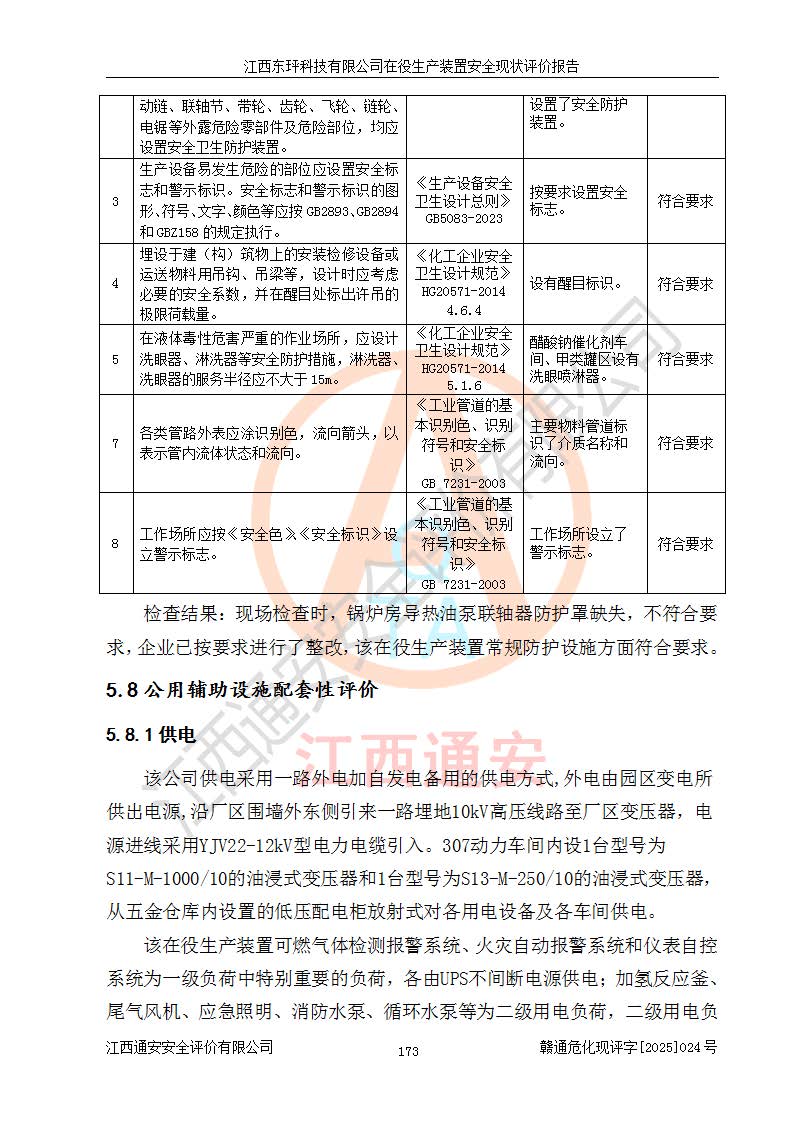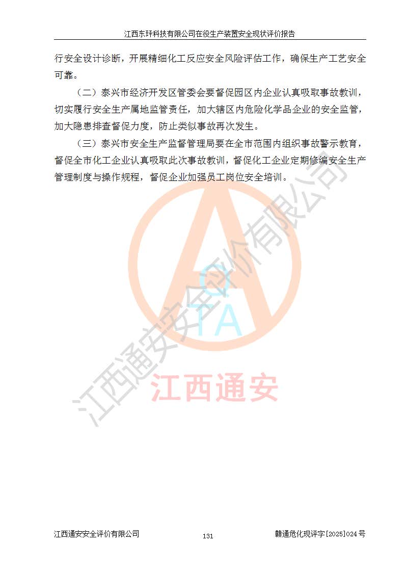 江西东玶科技有限公司位于江西省吉安市吉水县城西工业园区,法定**人为徐东,成立于2018年04月08日,注册资本叁仟贰佰叁拾万元整,经营范围为合成樟脑、α-蒎烯、β-蒎烯、二氢月桂烯(含月桂烯)、莰烯、双戊烯、氢气(中间产品)的制造加工(凭**批准证书经营);白乙酯、双萜烯等合成香料的制造加工等。 江西东玶科技有限公司2022年08月01日取得了《安全生产许可证》,许可证编号:(赣)WH安许证字[2022]1160号,许可范围为合成樟脑(2000t/a)、二氢月桂烯(1000t/a)、月桂烯(3200t/a)、莰烯(1000t/a)、双戊烯(810t/a)、双萜烯(1070t/a)、α-蒎烯(7500t/a)、β-蒎烯(3200t/a)、白乙酯(500t/a),**期为2022年08月01日至2025年07月31日。该公司2023年5月29日取得了三级安全生产标准化证书,证书编号:赣AQBWHⅢ202300036,**期至2026年5月。该公司现有员工53人,其中专职安全生产管理人员2人。 因生产经营需要,江西东玶科技有限公司实施了年产12000吨松节油深加工系列产品项目(二期),并将二氢月桂烯的设计生产规模2000t/a变更为1500t/a,减少中间产品蒎烷的消耗量,剩余的蒎烷(720t/a)作为产品销售。江西东玶科技有限公司委托深圳天阳工程设计有限公司进行了设计变更,按程序要求进行了试生产,委托评价公司编制了安全验收评价报告,并于2025年1月16日组织专家组和相关单位进行了验收。验收完成后,江西东玶科技有限公司2025年06月04日对《安全生产许可证》进行了变更,许可范围变更为合成樟脑(2000t/a)、二氢月桂烯(1500t/a)、月桂烯(3200t/a)、莰烯(1000t/a)、双戊烯(902.5t/a)、双萜烯(1200.7t/a)、α-蒎烯(7500t/a)、β-蒎烯(3200t/a)、白乙酯(500t/a)、蒎烷(中间产品,720t/a)。 江西东玶科技有限公司在役生产装置生产过程中涉及的主要原辅材料为松节油、乙酸、液碱、甲醇、碳酸钠、二甲苯、偏钛酸、甲酸、硫酸铜、雷尼镍、离子膜、天然气、氮气,中间产品为氢气、α-蒎烯、β-蒎烯、蒎烷,产品为合成樟脑、二氢月桂烯、月桂烯、莰烯、双戊烯、白乙酯、双萜烯,副产品为醋酸钠。根据《危险化学品目录》,该在役生产装置涉及的松节油、乙酸、液碱、甲醇、二甲苯、甲酸、雷尼镍、天然气(燃料)、氮气(压缩的)、柴油,中间产品α-蒎烯、β-蒎烯、氢气、蒎烷和产品中合成樟脑、二氢月桂烯、月桂烯、莰烯、双戊烯属于危险化学品。经辨识,甲醇、氢气和天然气(燃料)属于重点监管的危险化学品,甲醇属于特别管控的危险化学品,不涉及监控化学品、易制毒化学品、易制爆危险化学品、剧毒化学品和高毒物品,生产、储存单元不构成危险化学品重大危险源,涉及的加氢工艺属于重点监管的危险化工工艺。根据生产工艺特点及物料的理化特性可知,该在役生产装置生产过程中存在火灾与爆炸、中毒与窒息、触电、机械伤害、灼烫等危险有害因素。 该公司自2022年08月01日取得安全生产许可证以来,生产运行正常,未发生一般及以上生产安全事故。 |