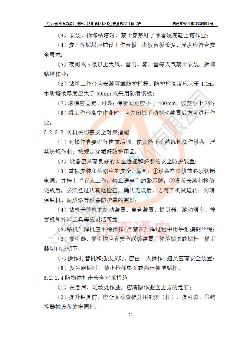 勘察现场发现的问题及安全对策措施 | 江西省地质局第九地质大队目前未承接地质钻探作业施工项目。 | |||||