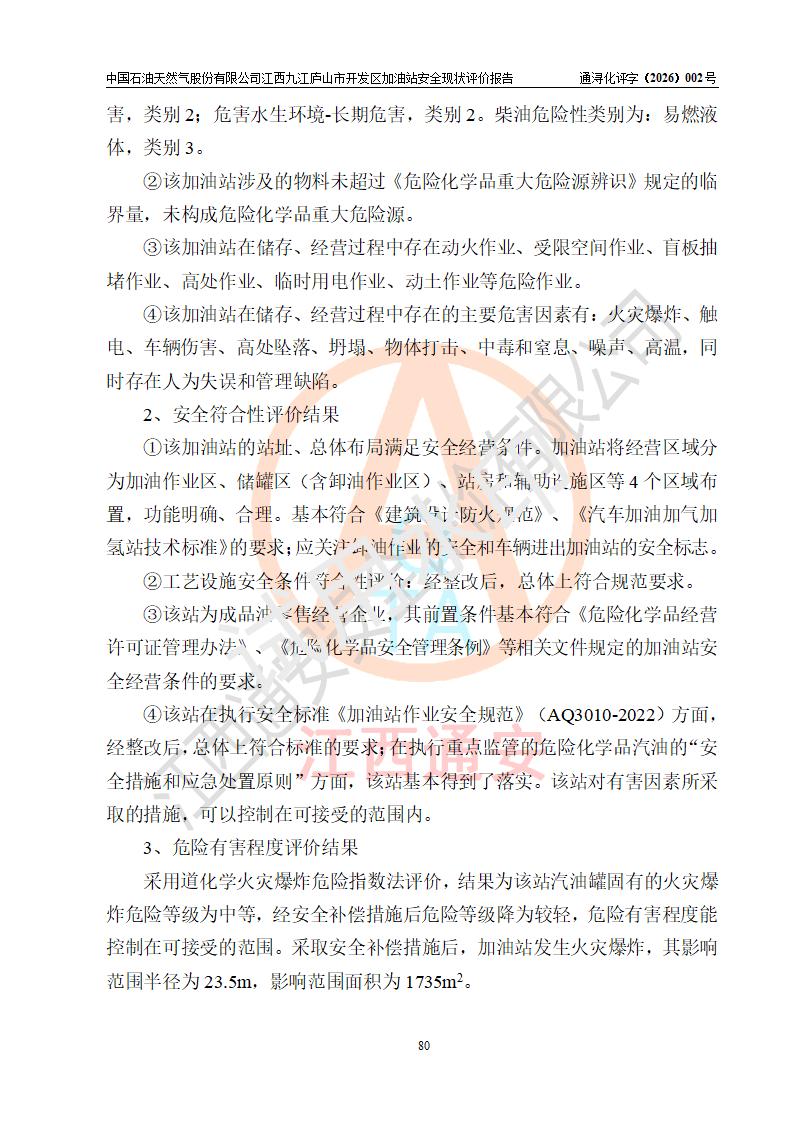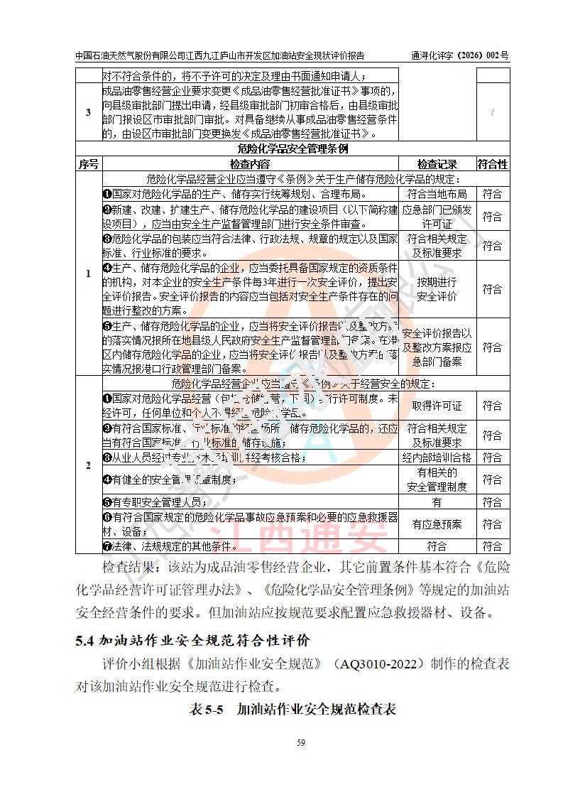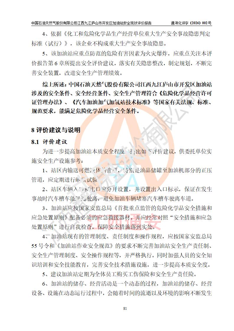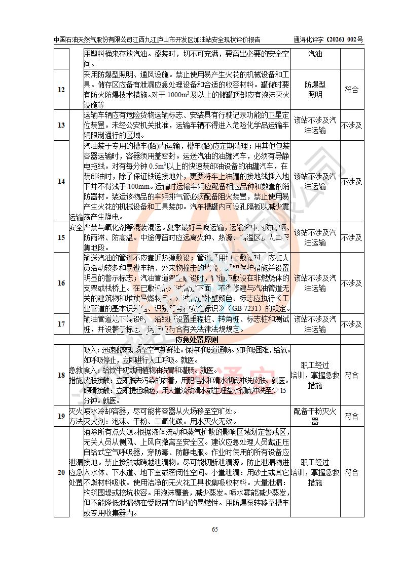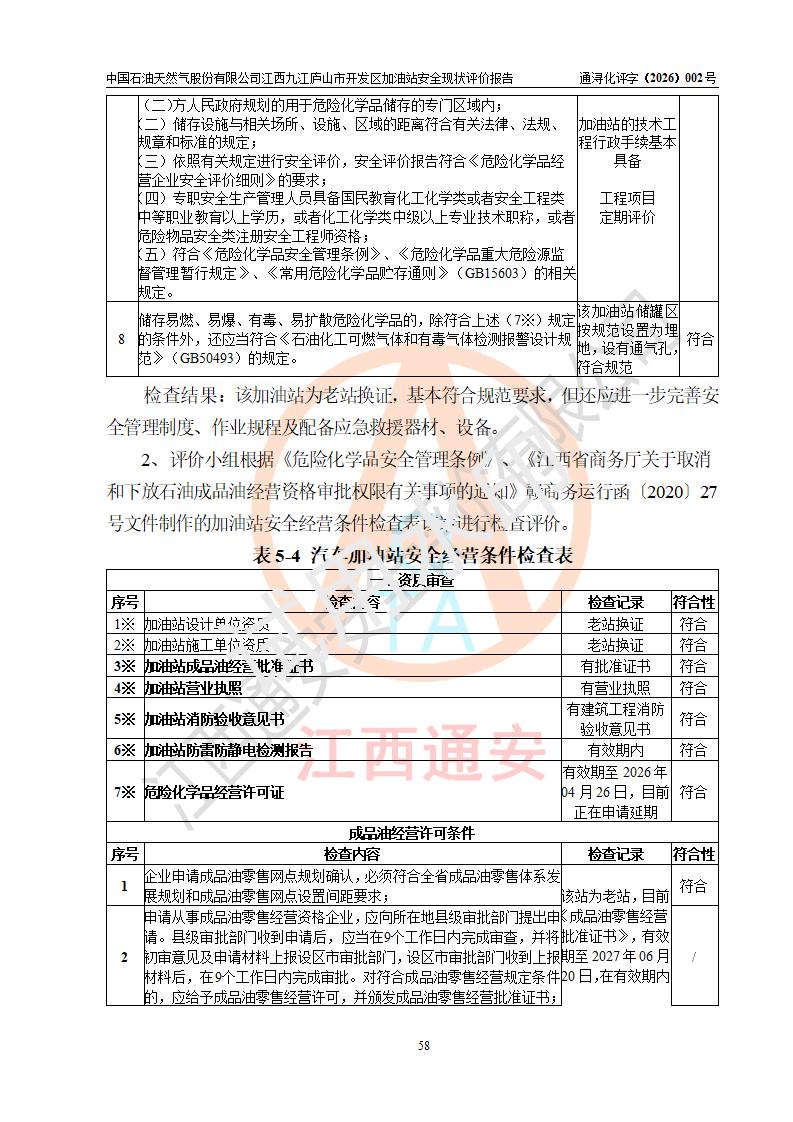 评价结论 | 中国石油天然气股份有限公司江西九江庐山市开发区加油站涉及的安全条件、安全经营条件、安全生产管理符合《危险化学品经营许可证管理办法》、《汽车加油加气加氢站技术标准》等**有关法规、标准、规范要求,能满足危险化学品经营安全条件。 | |||