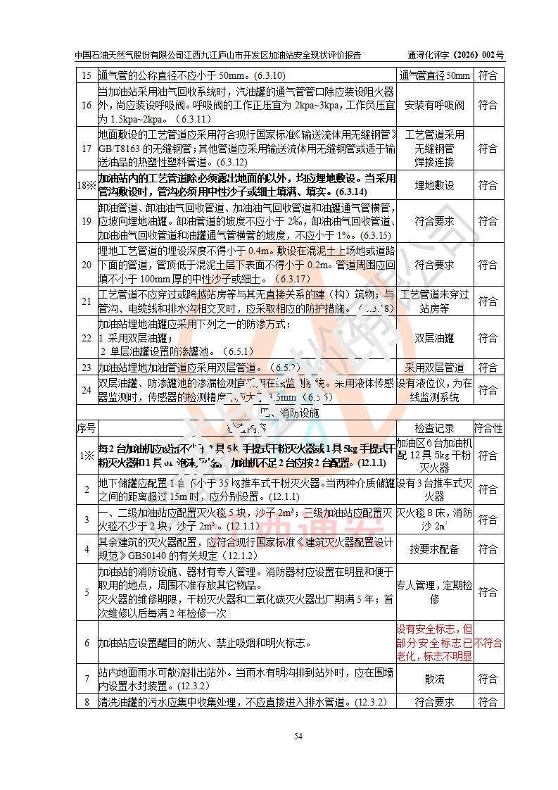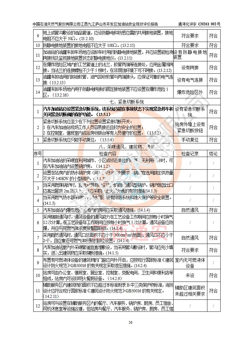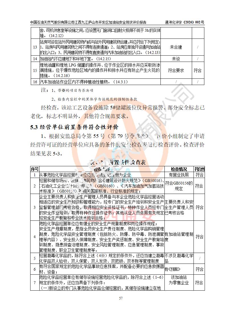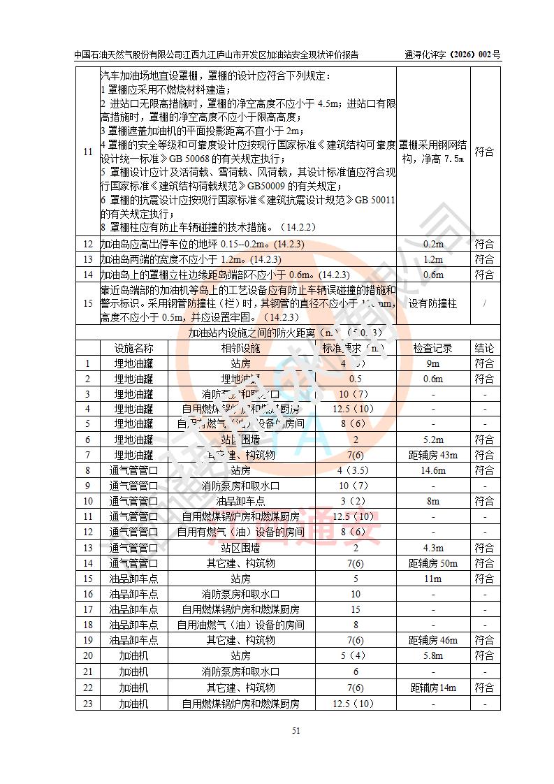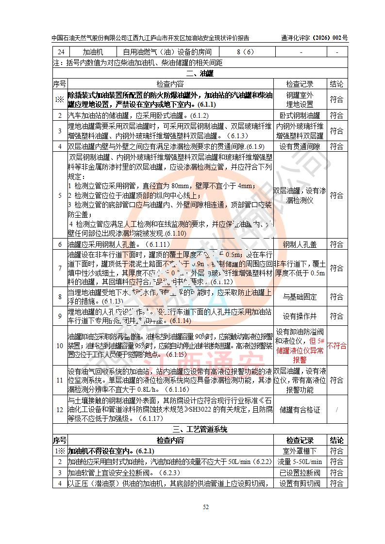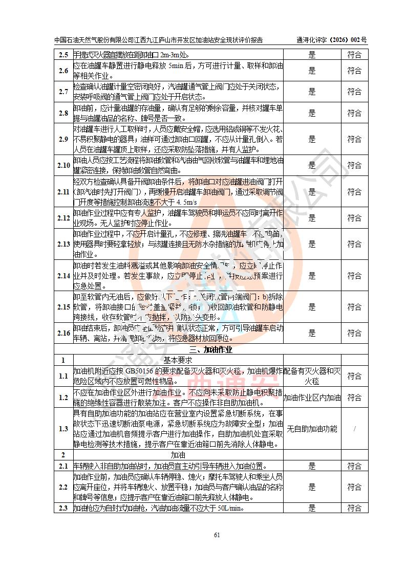 评价结论 | 中国石油天然气股份有限公司江西九江庐山市开发区加油站涉及的安全条件、安全经营条件、安全生产管理符合《危险化学品经营许可证管理办法》、《汽车加油加气加氢站技术标准》等**有关法规、标准、规范要求,能满足危险化学品经营安全条件。 | |||