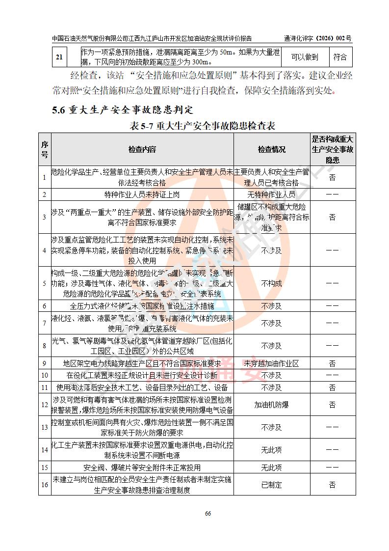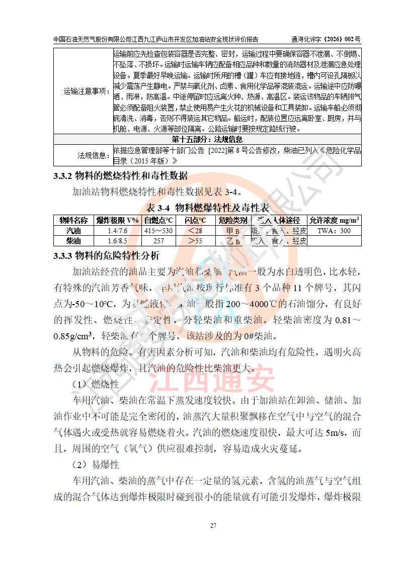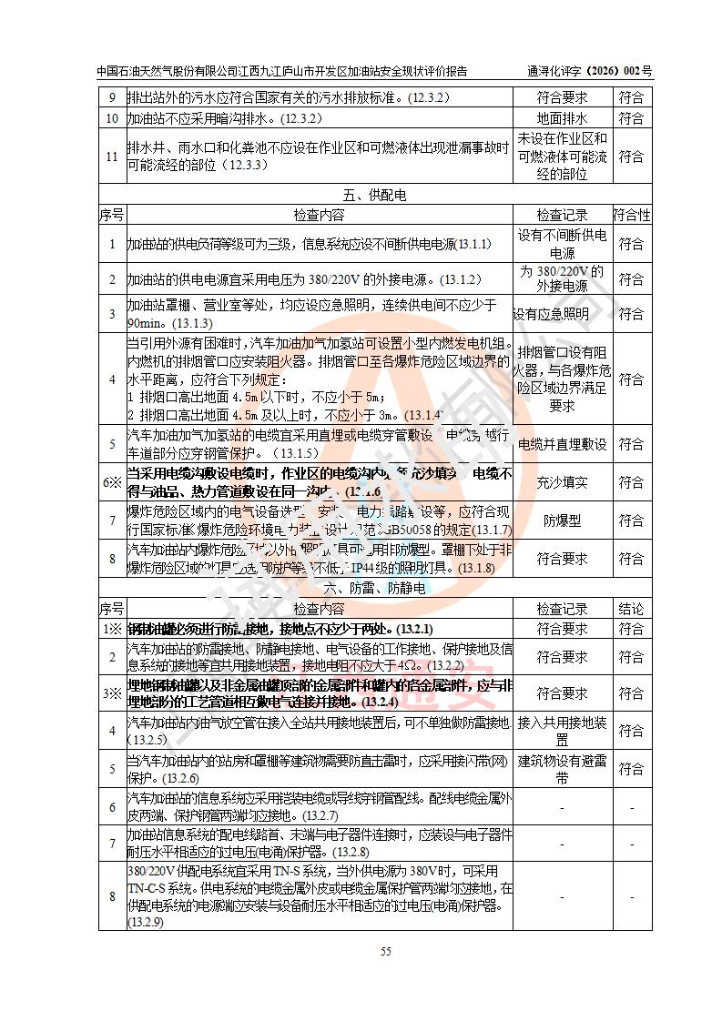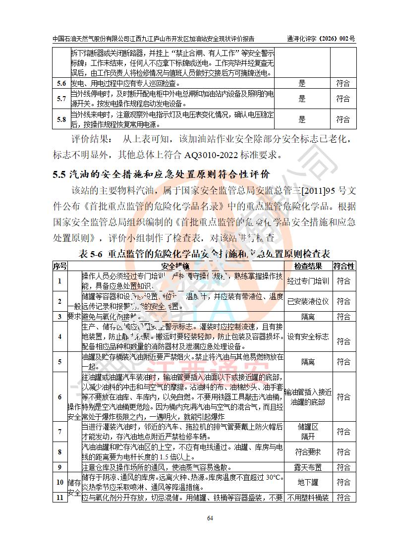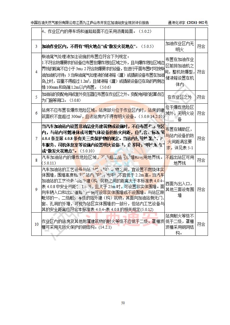 评价结论 | 中国石油天然气股份有限公司江西九江庐山市开发区加油站涉及的安全条件、安全经营条件、安全生产管理符合《危险化学品经营许可证管理办法》、《汽车加油加气加氢站技术标准》等**有关法规、标准、规范要求,能满足危险化学品经营安全条件。 | |||