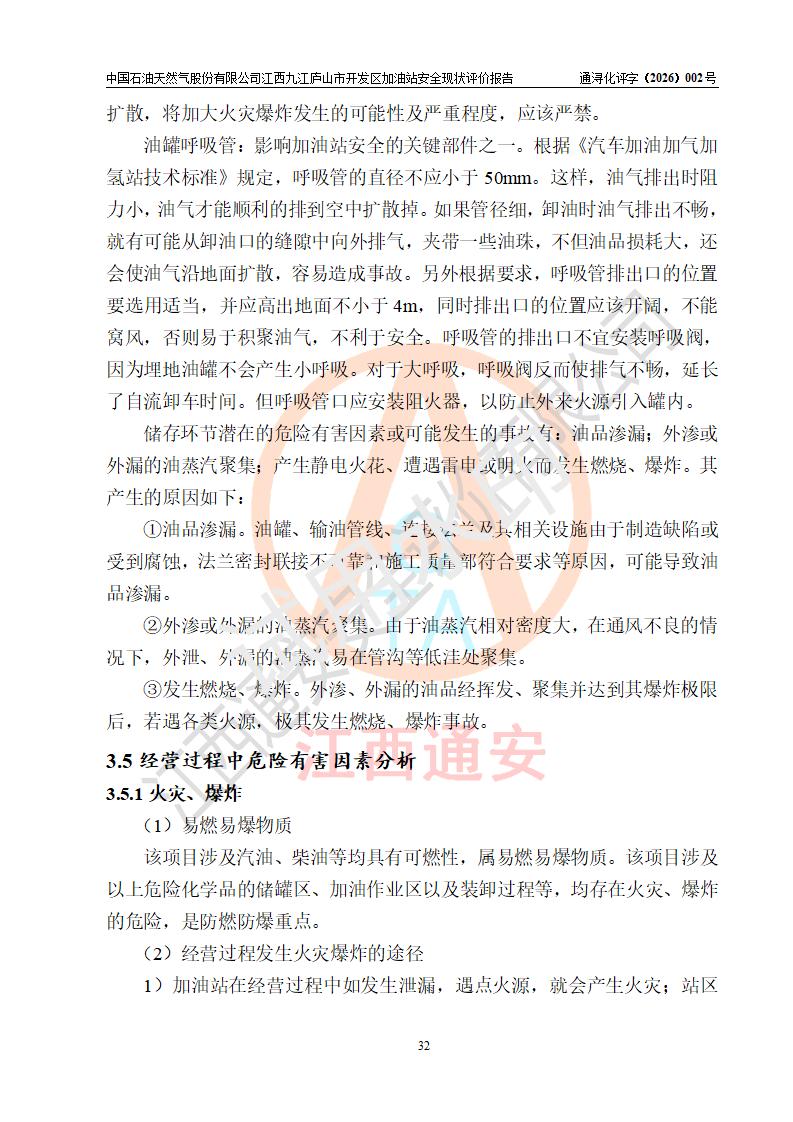 项目简介 | 中国石油天然气股份有限公司江西九江庐山市开发区加油站是一家专门从事成品油零售经营的其他股份有限公司分公司(上市),经营场所位于江西省九江市庐山市金鹿工业园西北处、环庐山路东侧。现有从业人员9名,其中安全管理人员1人,加油站负责人杨全荣。 该加油站占地面积为4000m2,站区内设置有2台四枪和4台双枪程控燃油加油机及配套的工艺管线,设有SF双层储罐5台,其中30m3的0#柴油储罐2台、30m3的92#汽油储罐2台,30m3的95#汽油储罐1台,油品储罐总容积为150m3(折算成汽油为120m3),按现行《汽车加油加气加氢站技术标准》对加油站的等级划分原则,属二级加油站。 该站由九江市行政审批局换发《危险化学品经营许可证》(证号:赣九行审经(甲)字[2023]000013号),**期限2023年04月27日至2026年04月26日。 | |||