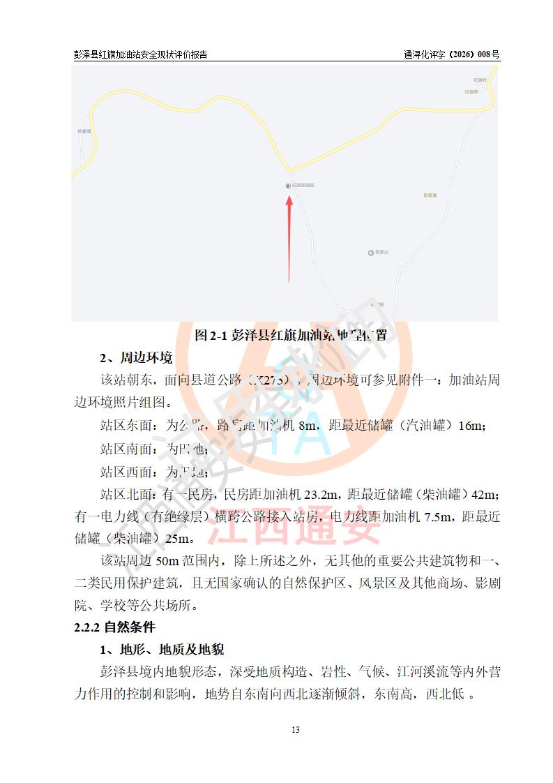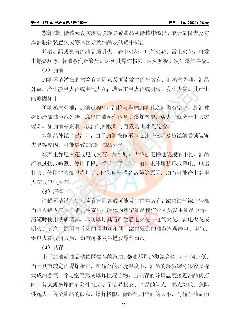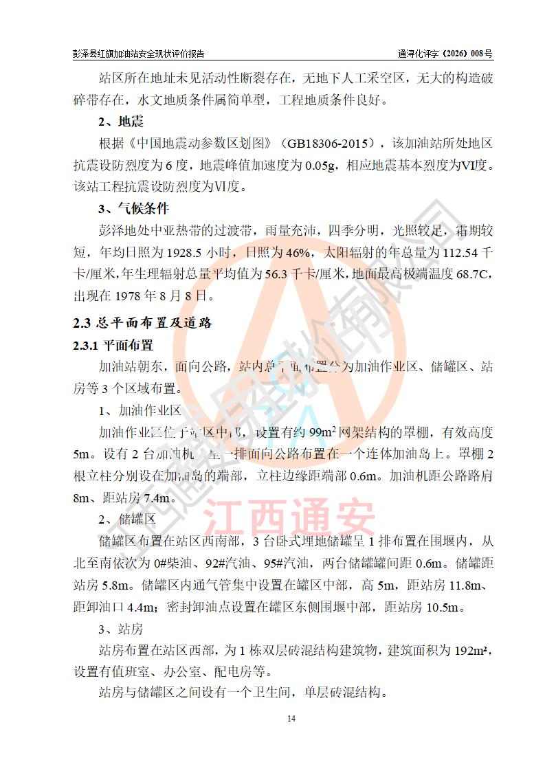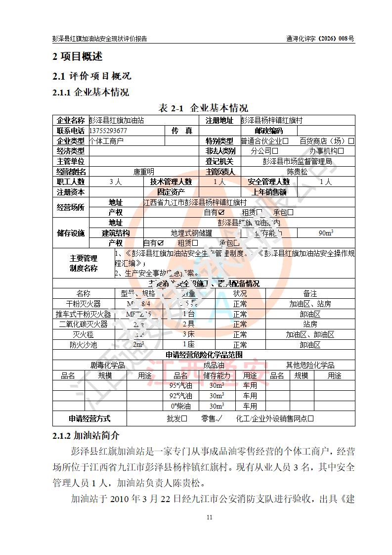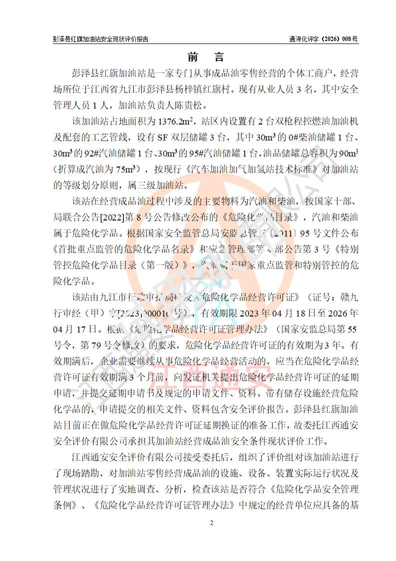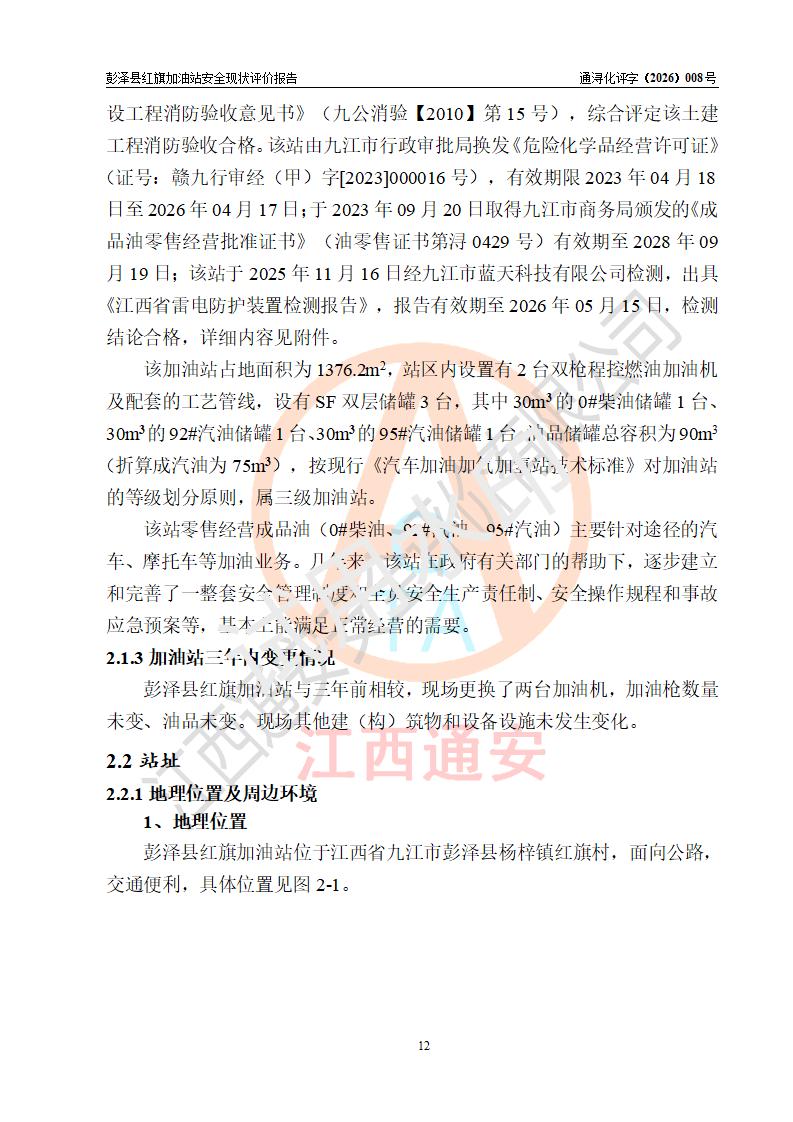 项目简介 | 彭泽县红旗加油站是一家专门从事成品油零售经营的个体工商户,经营场所位于江西省九江市彭泽县杨梓镇红旗村。现有从业人员3名,其中安全管理人员1人,加油站负责人陈贵松。 该加油站占地面积为1376.2m2,站区内设置有2台双枪程控燃油加油机及配套的工艺管线,设有SF双层储罐3台,其中30m3的0#柴油储罐1台、30m3的92#汽油储罐1台、30m3的95#汽油储罐1台,油品储罐总容积为90m3(折算成汽油为75m3),按现行《汽车加油加气加氢站技术标准》对加油站的等级划分原则,属三级加油站。 该站由九江市行政审批局换发《危险化学品经营许可证》(证号:赣九行审经(甲)字[2023]000016号),**期限2023年04月18日至2026年04月17日。 | |||