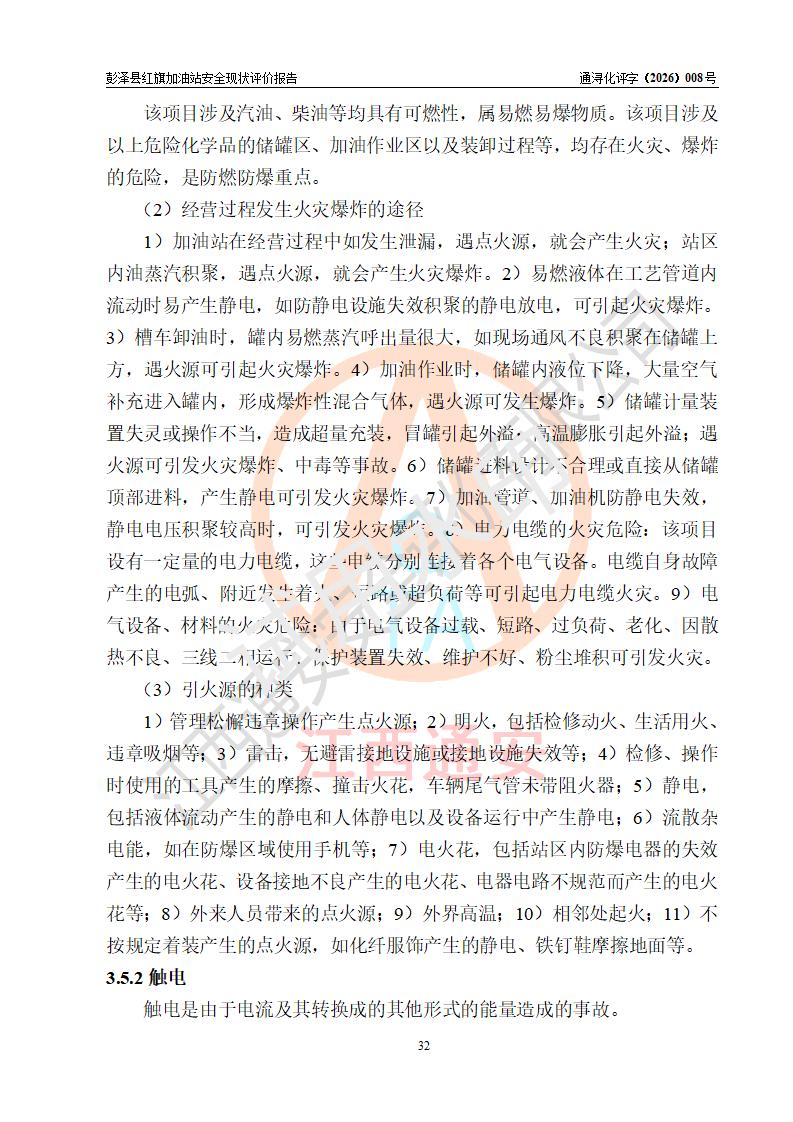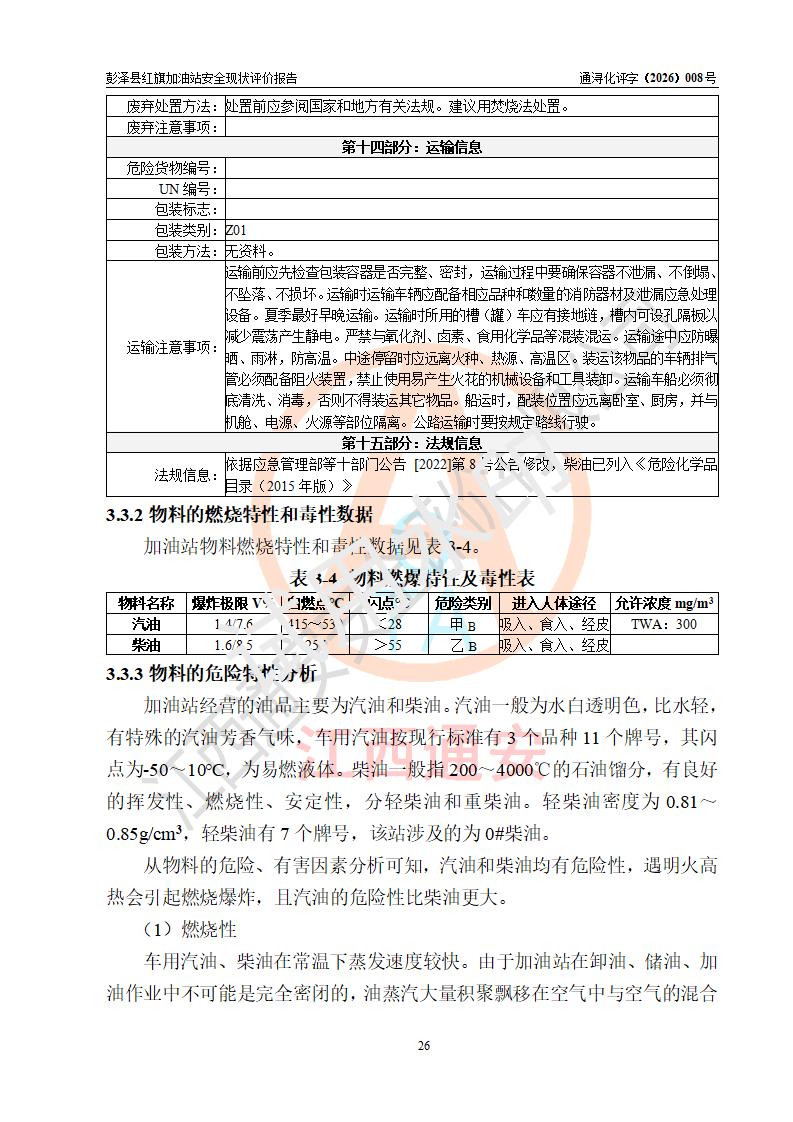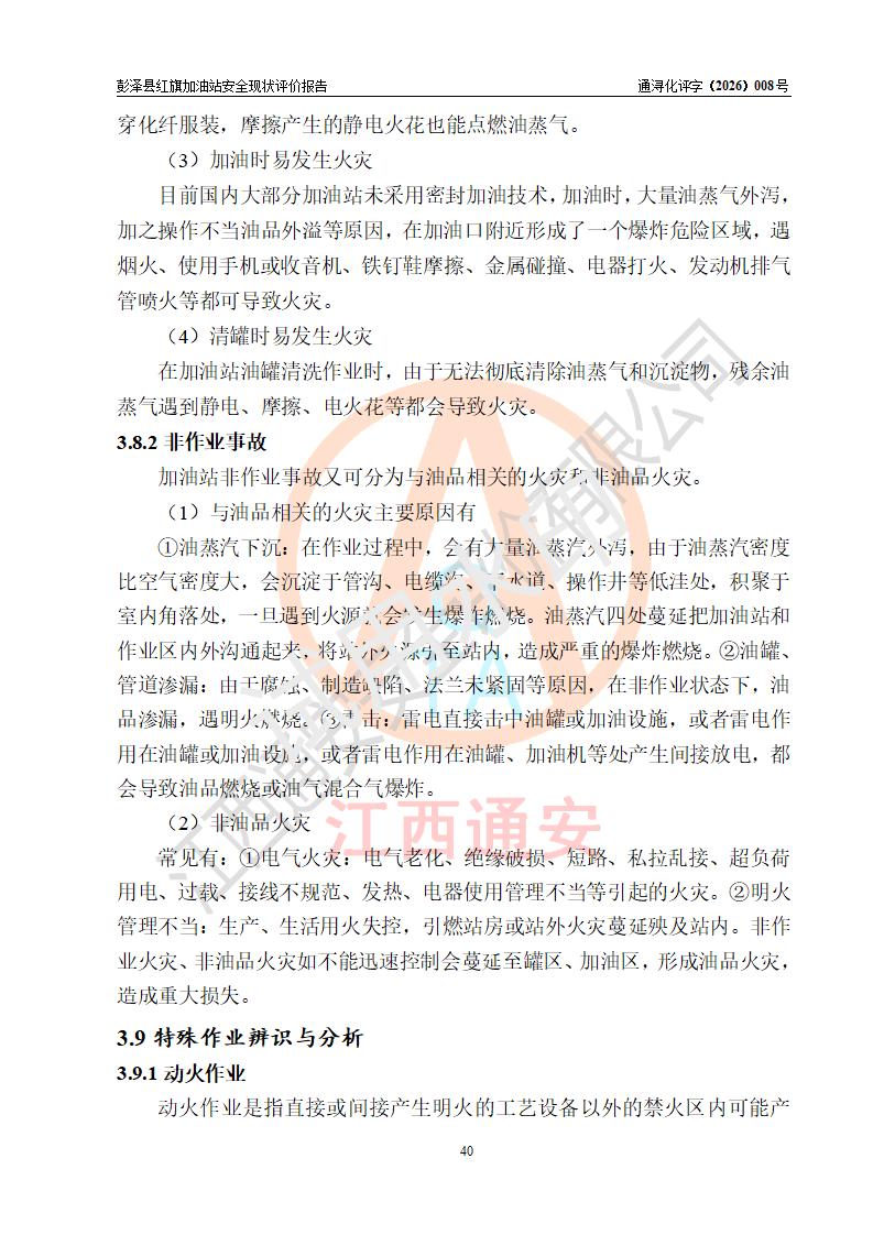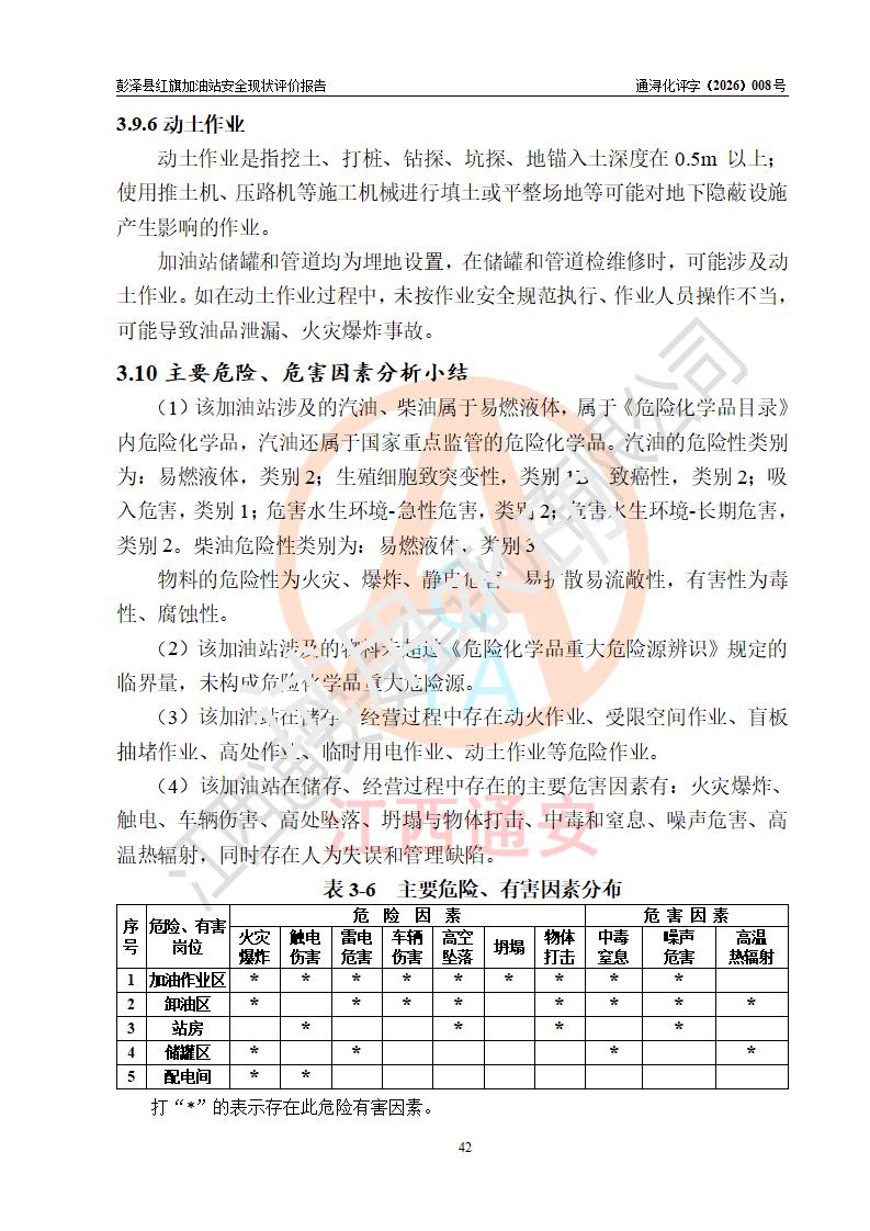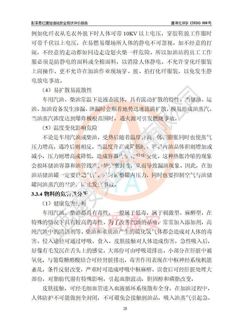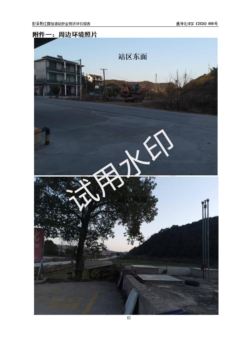 项目简介 | 彭泽县红旗加油站是一家专门从事成品油零售经营的个体工商户,经营场所位于江西省九江市彭泽县杨梓镇红旗村。现有从业人员3名,其中安全管理人员1人,加油站负责人陈贵松。 该加油站占地面积为1376.2m2,站区内设置有2台双枪程控燃油加油机及配套的工艺管线,设有SF双层储罐3台,其中30m3的0#柴油储罐1台、30m3的92#汽油储罐1台、30m3的95#汽油储罐1台,油品储罐总容积为90m3(折算成汽油为75m3),按现行《汽车加油加气加氢站技术标准》对加油站的等级划分原则,属三级加油站。 该站由九江市行政审批局换发《危险化学品经营许可证》(证号:赣九行审经(甲)字[2023]000016号),**期限2023年04月18日至2026年04月17日。 | |||