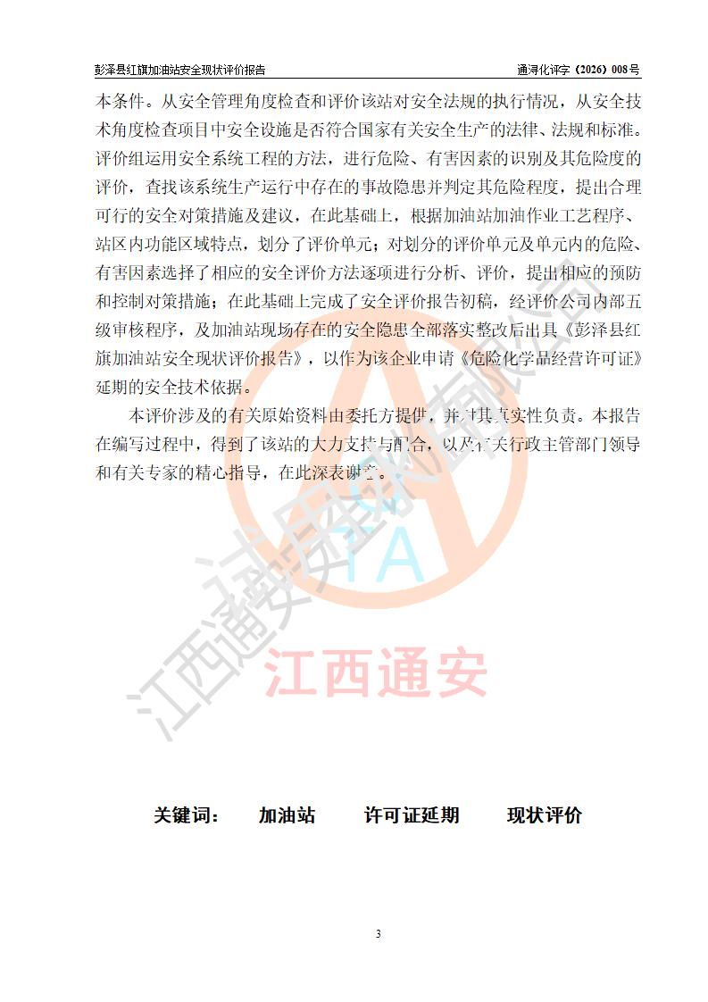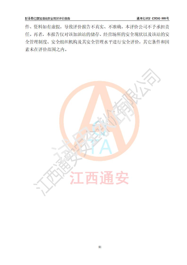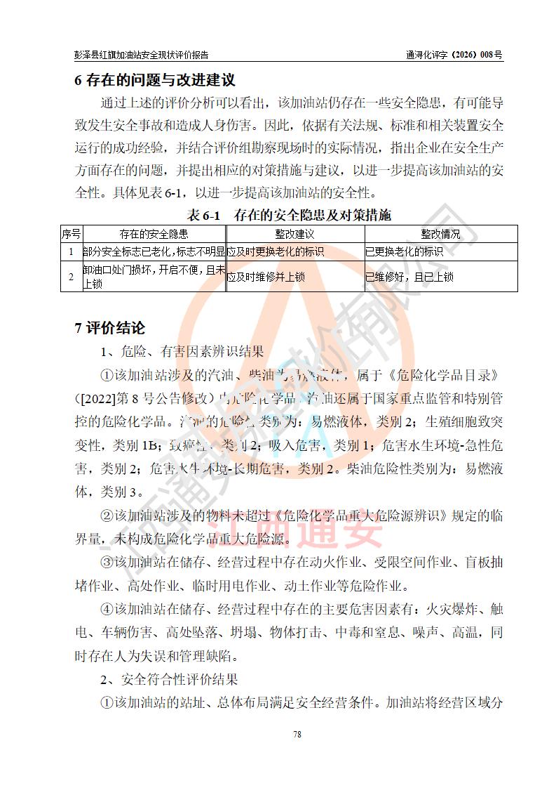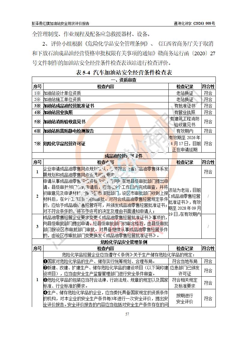 评价结论 | 彭泽县红旗加油站涉及的安全条件、安全经营条件、安全生产管理符合《危险化学品经营许可证管理办法》、《汽车加油加气加氢站技术标准》等**有关法规、标准、规范要求,能满足危险化学品经营安全条件。 | |||