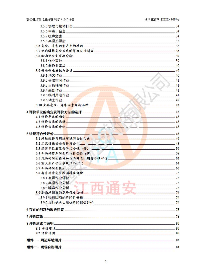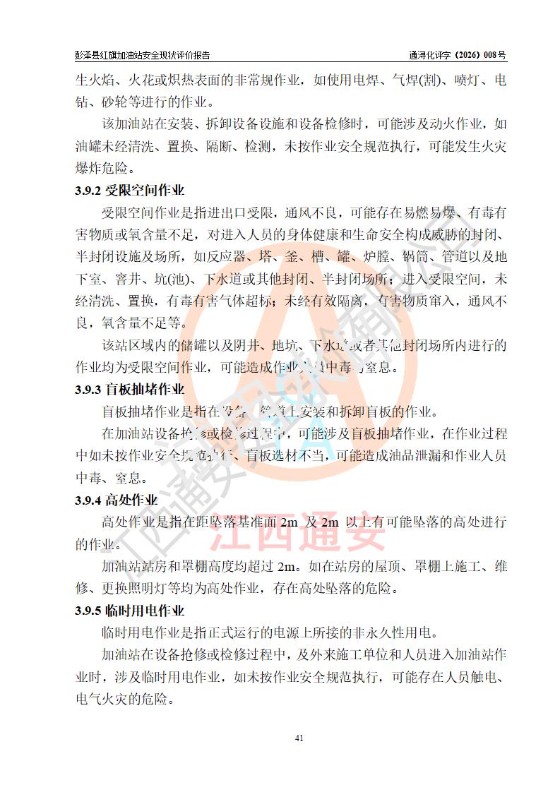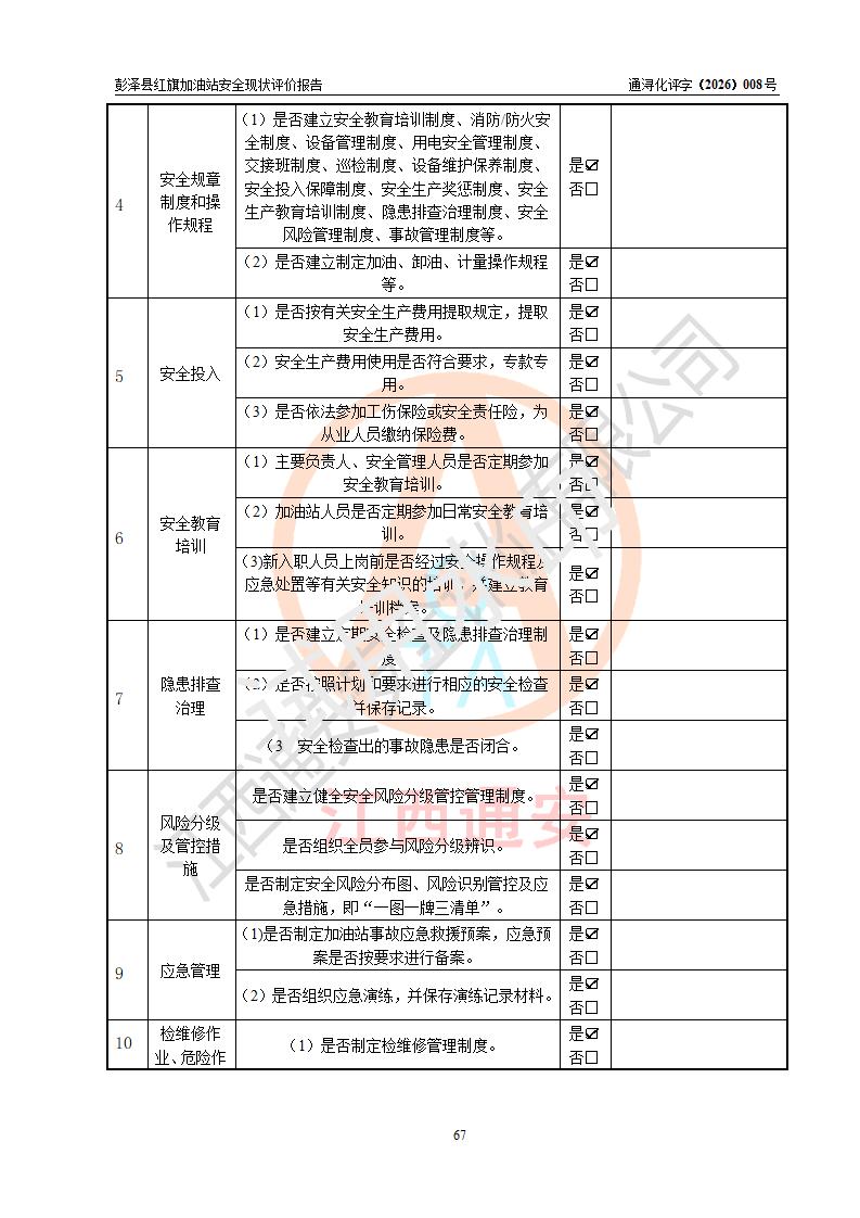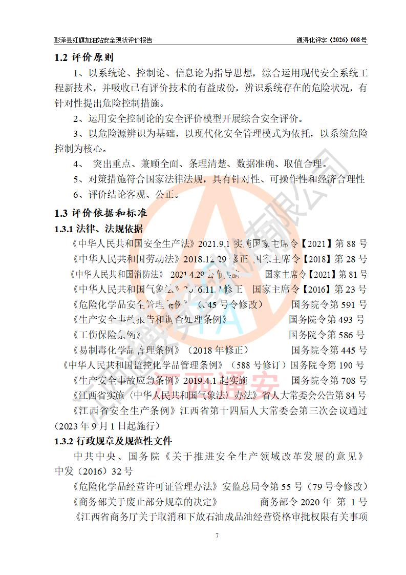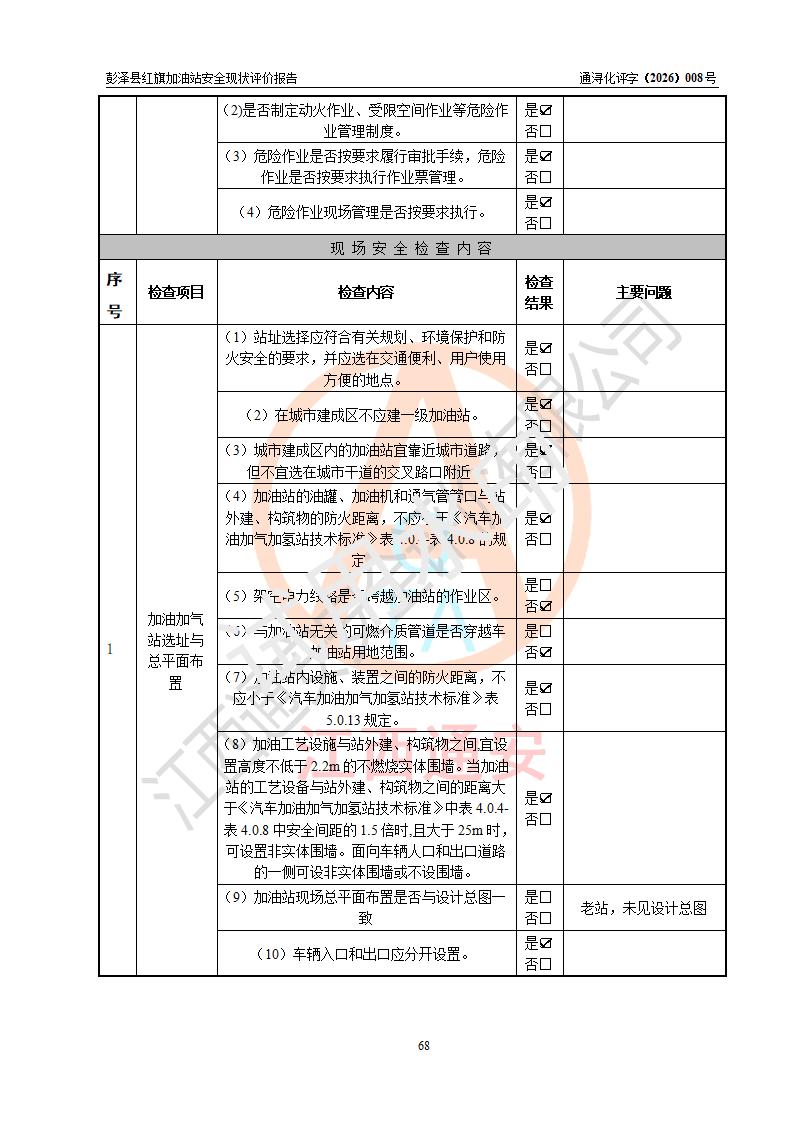 评价结论 | 彭泽县红旗加油站涉及的安全条件、安全经营条件、安全生产管理符合《危险化学品经营许可证管理办法》、《汽车加油加气加氢站技术标准》等**有关法规、标准、规范要求,能满足危险化学品经营安全条件。 | |||