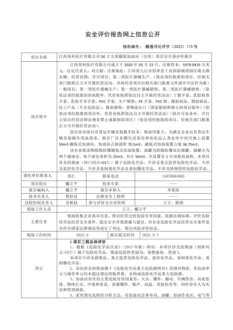 江西英科医疗有限公司50立方米撬装加油站(自用)项目安全预评价报告