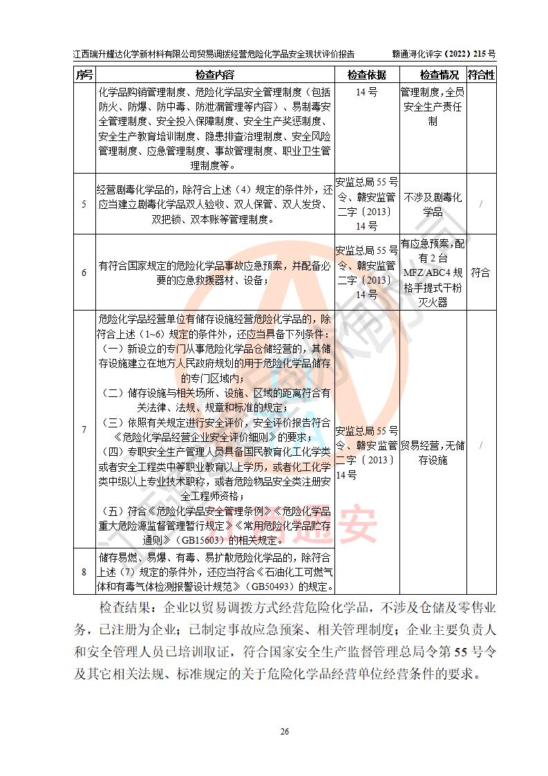评价结论 | 江西瑞升耀达化学新材料有限公司贸易调拨经营危险化学品的安全条件符合**有关法规、标准、规范要求,落实评价报告有关建议后,风险可控,具备危险化学品经营安全条件。 | |||