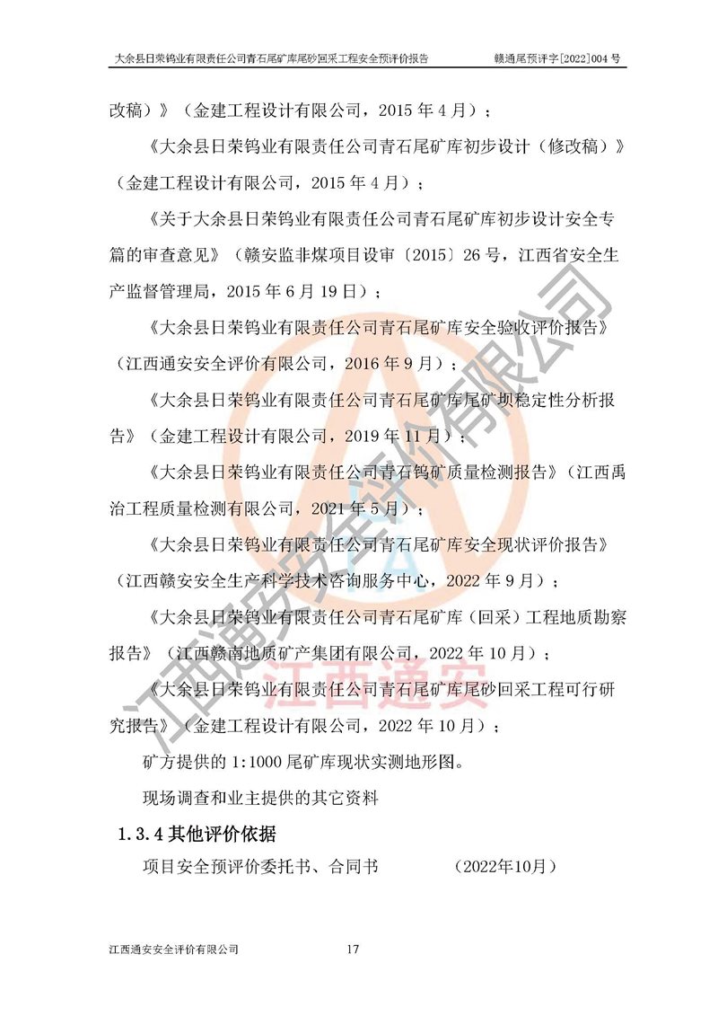 评价报告名称 | 大余县日荣钨业有限责任公司青石尾矿库尾砂回采工程安全预评价报告 | |||