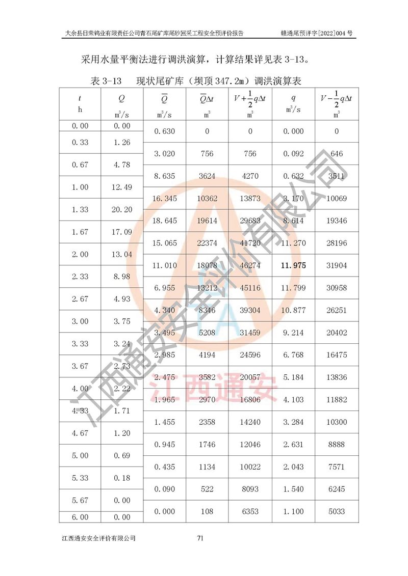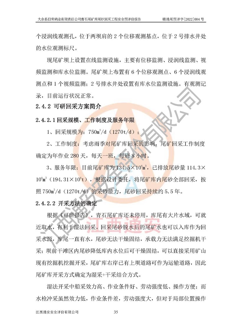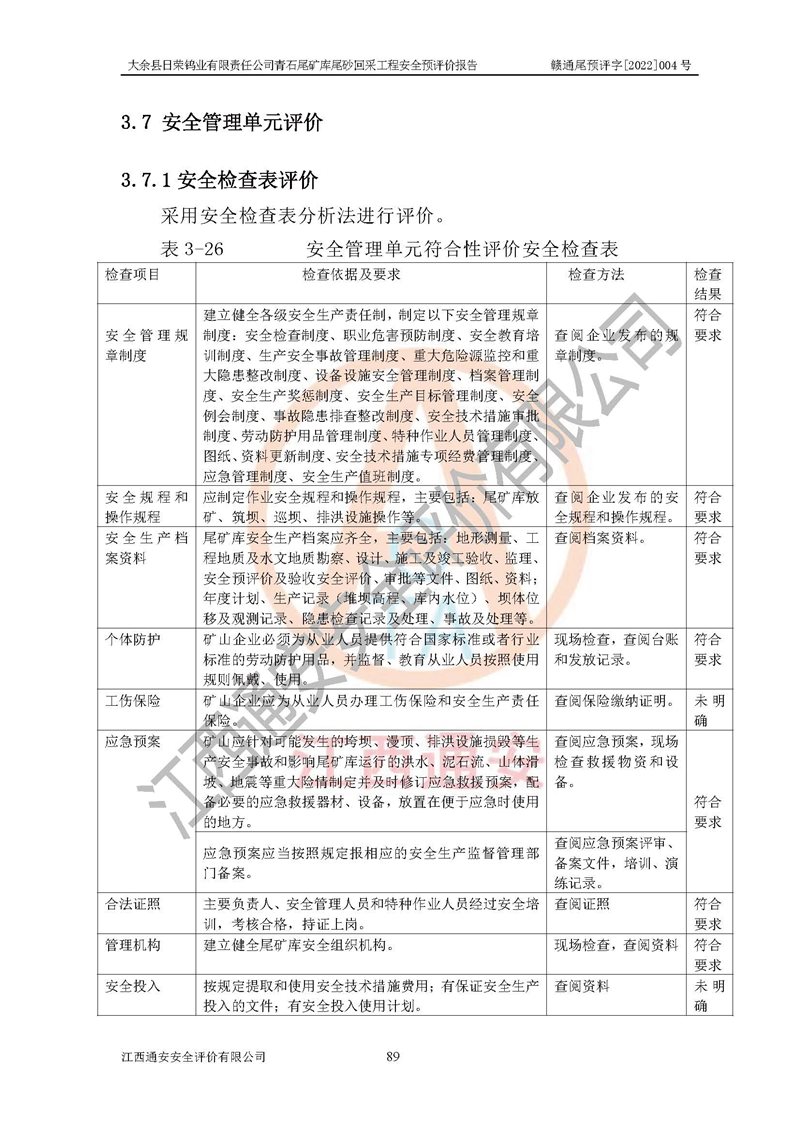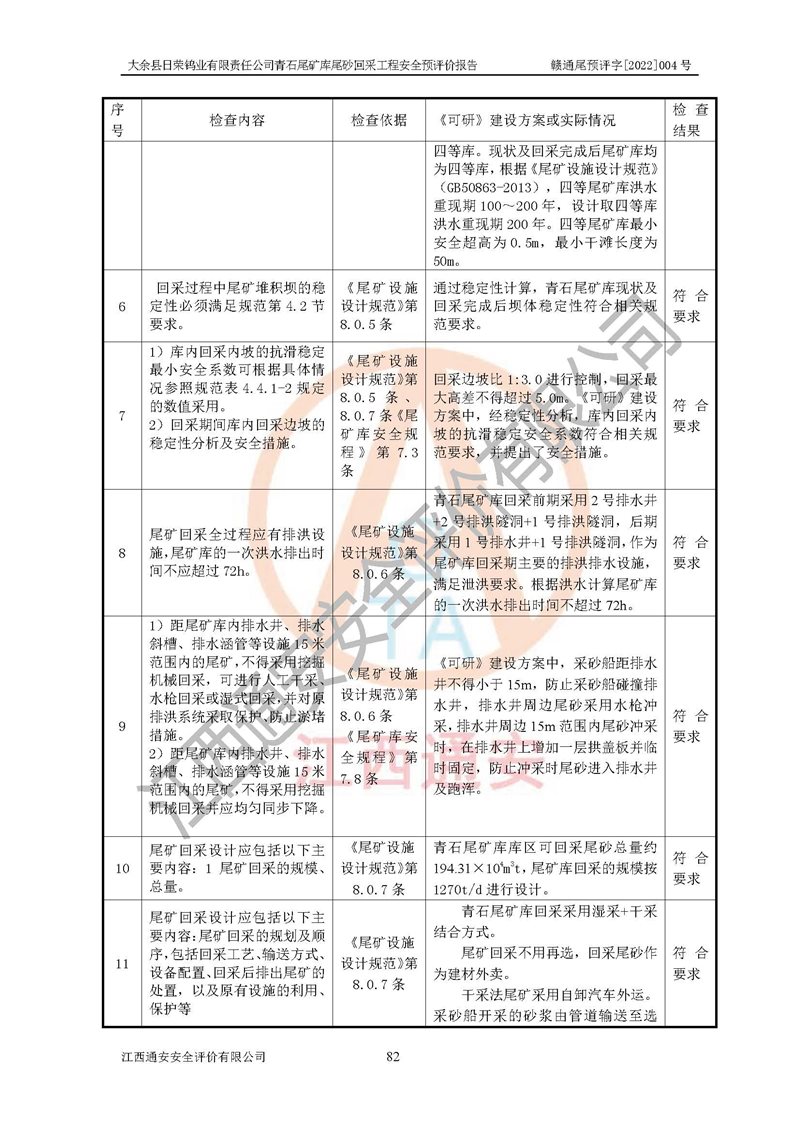 评价结论 | 建设单位依据《可研》建设方案,结合本报告提出的安全措施建议,进行大余县日荣钨业有限责任公司青石尾矿库尾砂回采工程后续设计、施工、生产、管理,则尾矿库尾砂回采工程项目危险、有害因素的风险程度可以控制在可承受的范围之内,青石尾矿库尾砂回采工程安全条件可满足安全生产需要。 | |||