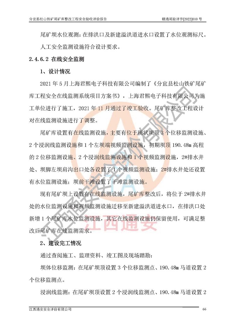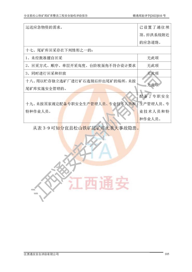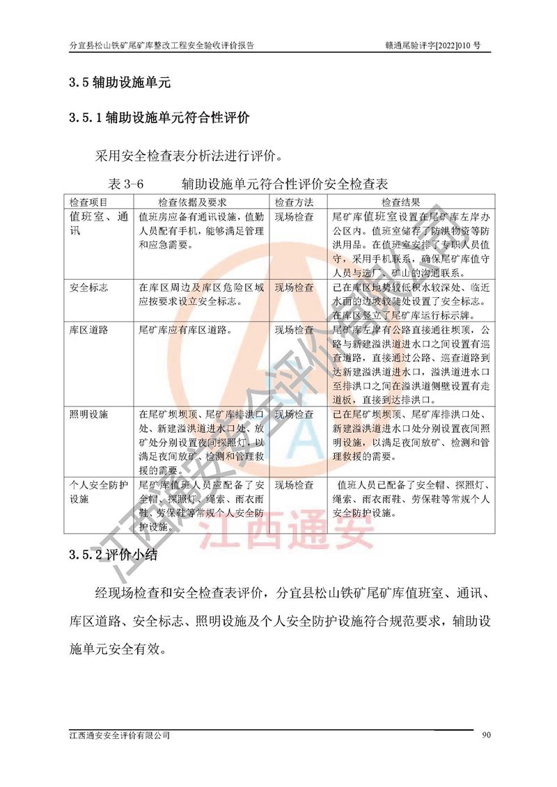 评价结论 | 1、分宜县松山铁矿尾矿库整改工程委托了有设计资质的单位进行工程设计,选择有相应资质的单位承担工程建设施工、监理工作,项目建成后,安全设施工程质量经建设、设计、施工、监理单位各方联合验收,工程划分1个单位工程,7个分部工程皆符合设计和规范要求,整个工程质量评定为合格;投入试生产运行后安全设施运行正常,安全管理规范**,符合**相关法律法规和技术标准的要求。 2、经过尾矿库安全设施竣工验收表的对照检查,该建设项目无否决项,且验收检查项无“不符合”项,建设项目为合格。 安全验收评价结论:分宜县松山铁矿尾矿库为正常库,尾矿库整改工程质量合格,符合设计要求并符合**现行法律法规要求,具备安全验收条件。 | |||