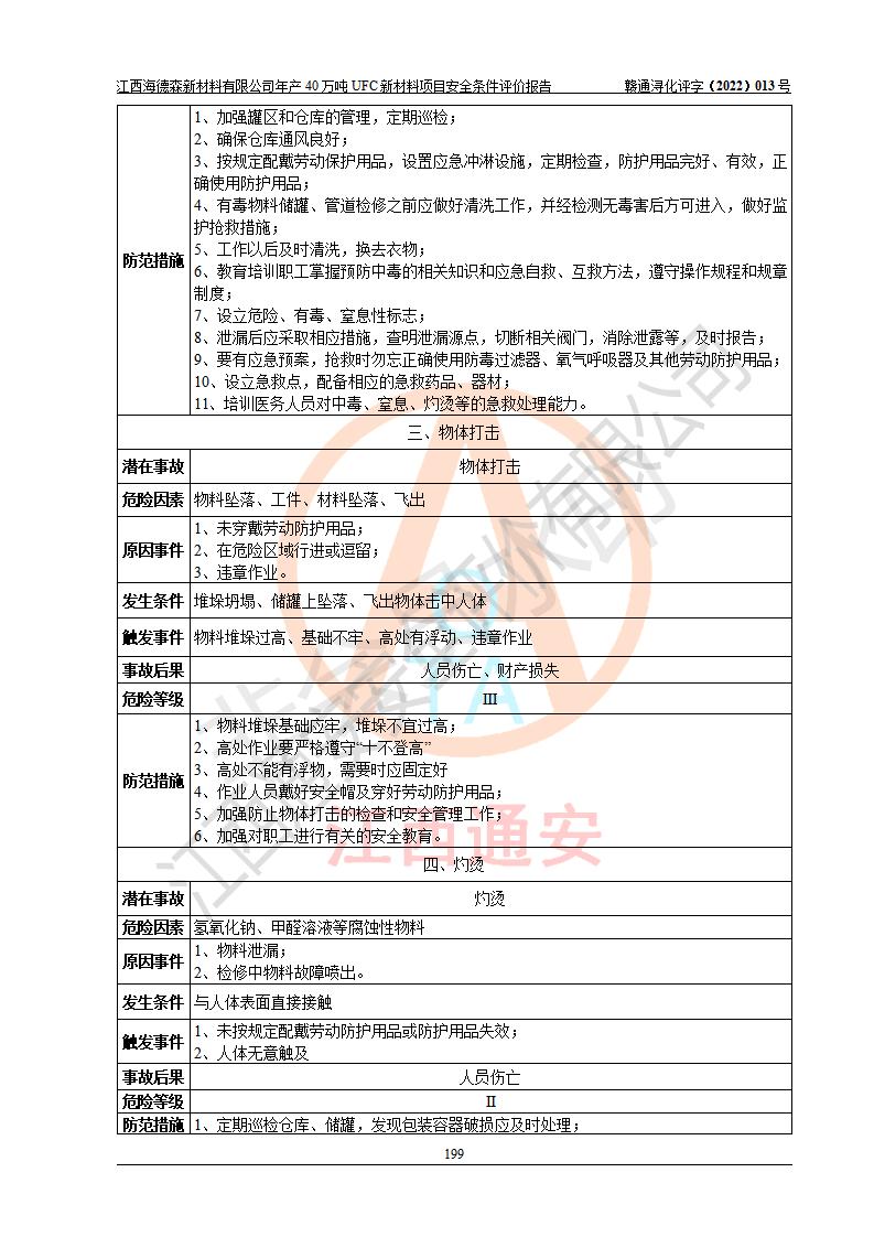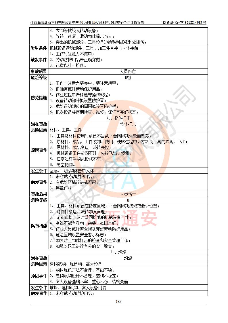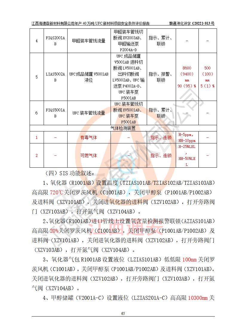 评价结论 | 江西海德森新材料有限公司新建年产40万吨UFC新材料项目的选址、总体布局、周边环境、自然环境能满足建设安全条件;项目选择的工艺过程及设备设施的安全可靠性能达到**法规、标准规定要求;项目存在的危险有害因素可控,在落实本评价报告提出的有关安全对策措施后,其危险有害程度能达到可以接受的程度,项目建设能够实现安全运行的目标。 | |||