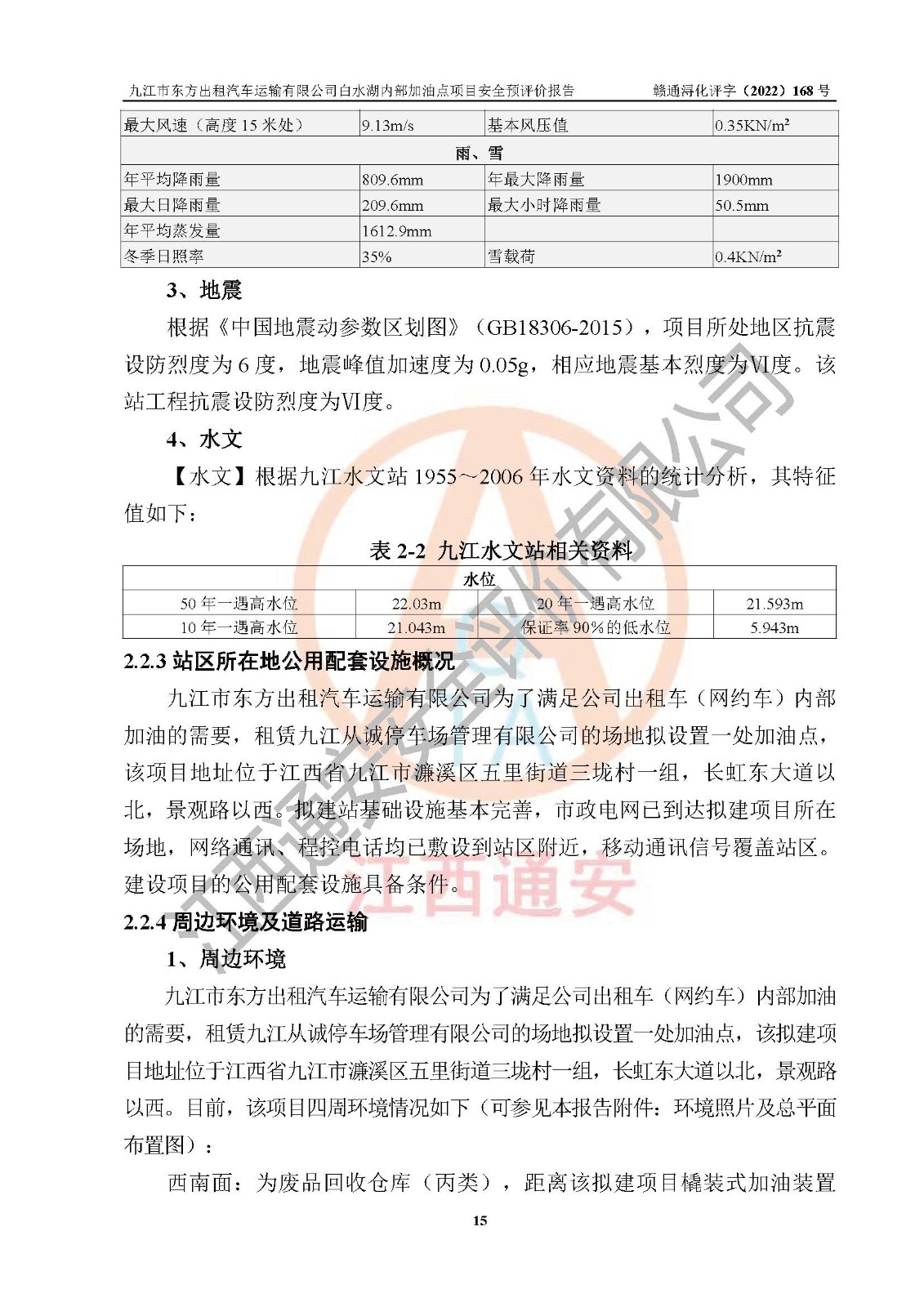 项目简介 | 九江市东方出租汽车运输有限公司为了满足公司出租车(网约车)内部加油的需要,租赁九江从诚停车场管理有限公司的场地拟设置一处加油点,该项目地址位于江西省九江市濂溪区五里街道三垅村一组,长虹东大道以北,景观路以西。该撬装式汽车加油点拟采用的加油装置为阻隔防爆撬装式加油装置,是集加油机、阻隔防爆储油罐、阻隔防爆油气回收装置和自动灭火器于一体的地面加油设备(撬装机),属于成套装置。该项目阻隔防爆撬装式加油装置拟设置92#汽油储罐一个(油罐拟采用双层罐壁),总容量为20m3(中间设隔仓,每个仓10m3);设双枪税控燃油加油机2台(共4枪)及配套的工艺管线,根据《采用橇装式加油装置的汽车加油站技术规范》SH/T 3134-2002、《汽车加油加气加氢站技术标准》GB50156-2021、《**安全监管总局办公厅关于自用撬装式加油装置安全监管问题复函 》**安全监管总局办公厅管三函【2016】30号,九江市东方出租汽车运输有限公司拟设加油点属企业自用撬装式加油装置,为企业内部加油使用,不对其他外界**提供加油服务,不对外进行经营、零售。 | |||