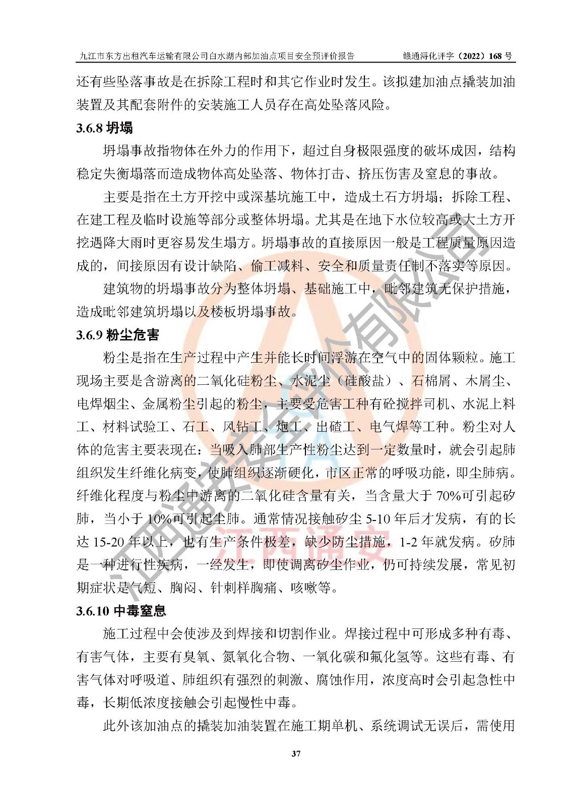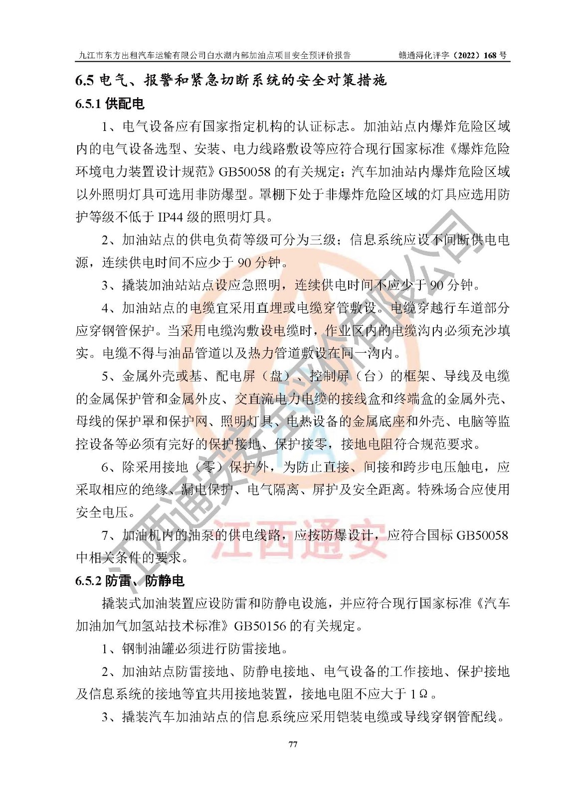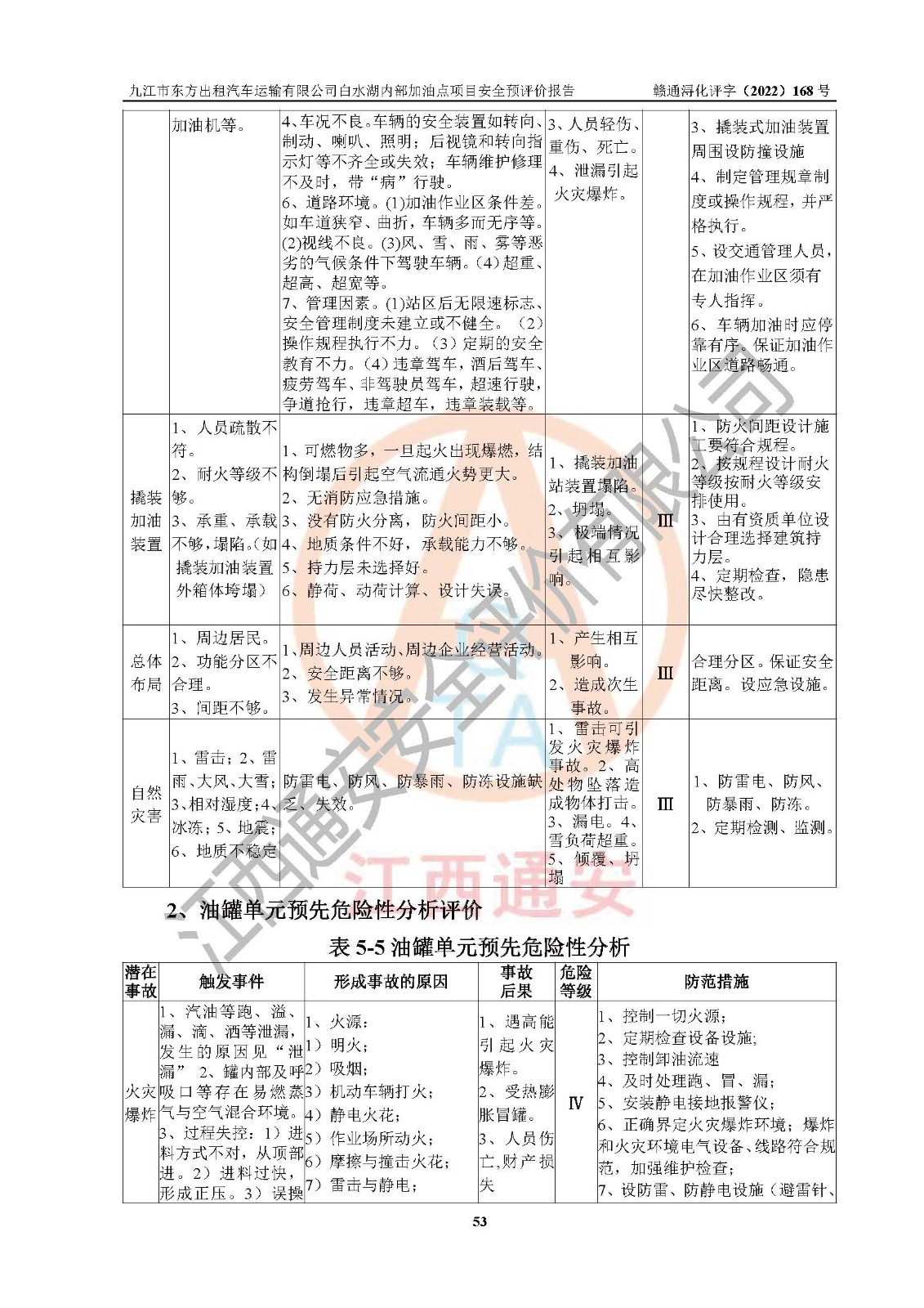 评价结论 | 九江市东方出租汽车运输有限公司白水湖内部加油点新建项目的选址、自然条件适宜该项目工程的建设;项目规划设计中的总体布局方案可行,符合有关法规、标准要求;项目选择的工艺过程及设备设施的安全可靠性能达到**法规、标准规定要求;项目存在的危险有害因素可控,在落实项目建设方案及评价报告提出的有关安全对策措施后,其危险有害程度能达到可以接受的程度,项目建设能够实现安全运行的目标。 | |||