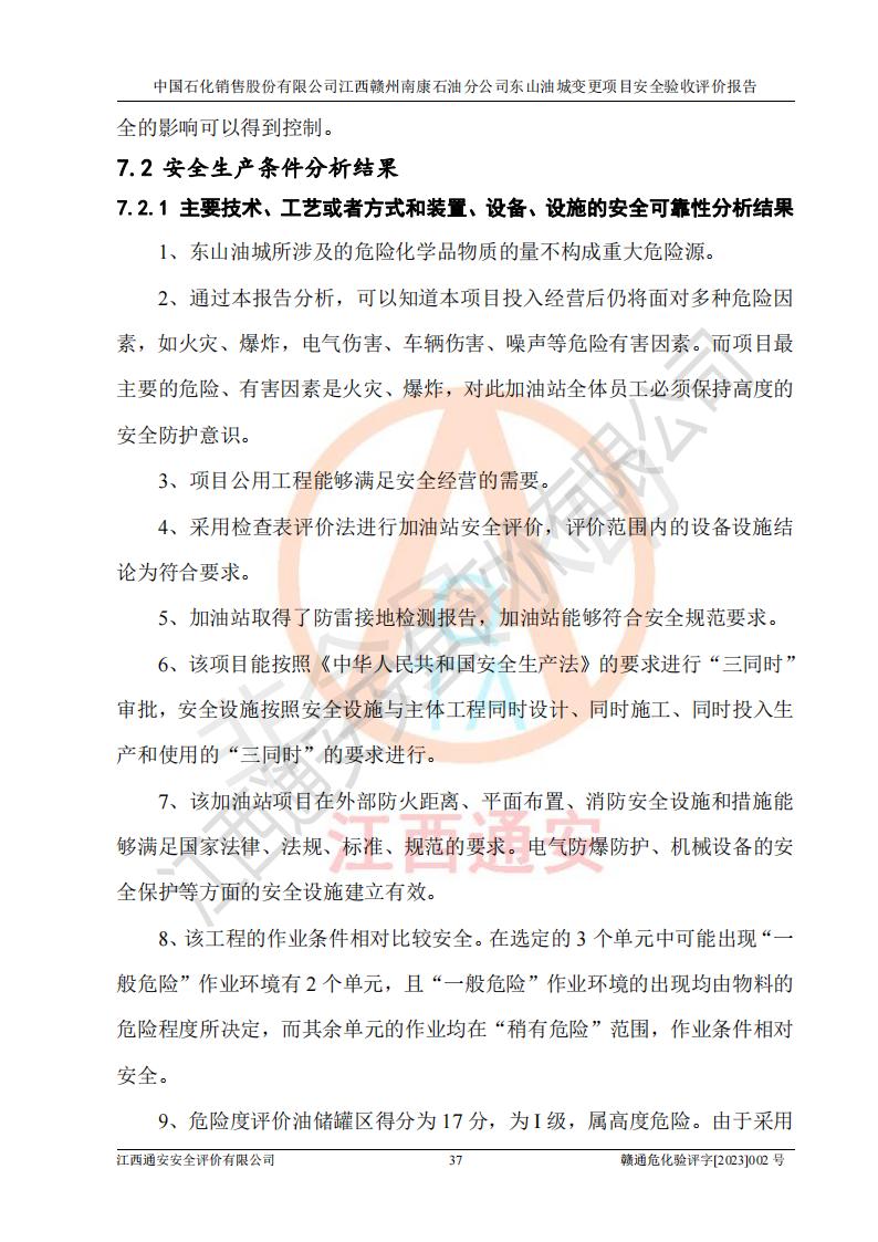 其它 | 在对该项目危险、有害因素辨识分析的基础上,运用安全检查表、预作业条件危险性分析法、危险度评价、重大事故后果分析结果等评价方法对该项目进行了分析评价,评价结果如下: 1、东山油城所涉及的危险化学品物质的量不构成重大危险源。经辨识本项目不涉及监控、易制毒、易制爆、剧毒和**危险化学品;项目涉及的汽油属于重点监管和特别管控危险化学品,储存经营单位应根据“汽油安全措施和应急处理原则”要求的措施完善安全、应急设施和资源;依据《特别管控危险化学品目录(**版)》管控措施进行检查,加油站对汽油进行储存定置化管理,设置油罐区**储存汽油,并制定各种管理制度,依法依规严格管理。项目不涉及重点监管危险化工工艺。 2、通过本报告分析,可以知道本项目投入经营后仍将面对多种危险因素,如火灾、爆炸,电气伤害、**伤害、噪声等危险有害因素。而项目主要的危险、有害因素是火灾、爆炸,对此加油站全体员工**保持**的安全防护意识。 3、项目公用工程能够满足安全经营的需要。 4、采用检查表评价法进行加油站安全评价,评价范围内的设备设施结论为符合要求。 5、加油站取得了防雷接地检测报告,加油站能够符合安全规范要求。 6、该项目能按照《中华人民共和国安全生产法》的要求进行“三同时”审批,安全设施按照安全设施与主体工程同时设计、同时施工、同时投入生产和使用的“三同时”的要求进行。 7、该项目选址、外部防火距离、平面布置、消防安全设施和措施能够满足**法律、法规、标准、规范的要求。电气防爆防护、机械设备的安全保护等方面的安全设施建立**。 8、该工程的作业条件相对比较安全。在选定的3个单元中可能出现“一般危险”作业环境有2个单元,且“一般危险”作业环境的出现均由物料的危险程度所决定,而其余单元的作业均在“稍有危险”范围,作业条件相对安全。 9、危险度评价油储罐区得分为17分,为I级,属**危险。由于采用埋地油罐、密封操作等措施,危险有害程度能控制在可接受的范围。 10、加油站设置了安全**小组,制定了相应的管理制度,操作规程和事故应急预案,加油站的安全管理机构工作有力,加油站安全经营管理处于正常有序开展范围。应急资源配置和应急管理能达到加油站的应急要求。 评价结论: 综上所述,东山油城改建项目严格执行**有关安全生产法律、法规和有关标准、规范,认真落实并合理采纳安全条件评价报告及安全设施设计专篇设计中的安全对策、措施及建议,做到安全设施与主体工程同时设计、同时施工、同时投入生产和使用的“三同时”,对潜在的危险、有害因素采取了安全对策措施,工程潜在的危险、有害因素可得到**控制,风险在**控制和可接受范围内。现场与设计一致。 该项目安全设施设计专篇设计的安全设施得到落实符合**安全生产方面的法律、法规、标准、规范的要求,具备安全验收条件,符合安全生产条件。 | ||||