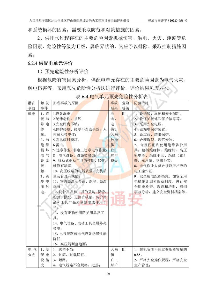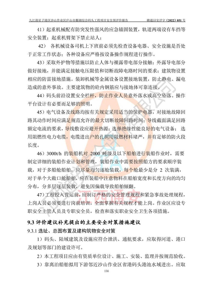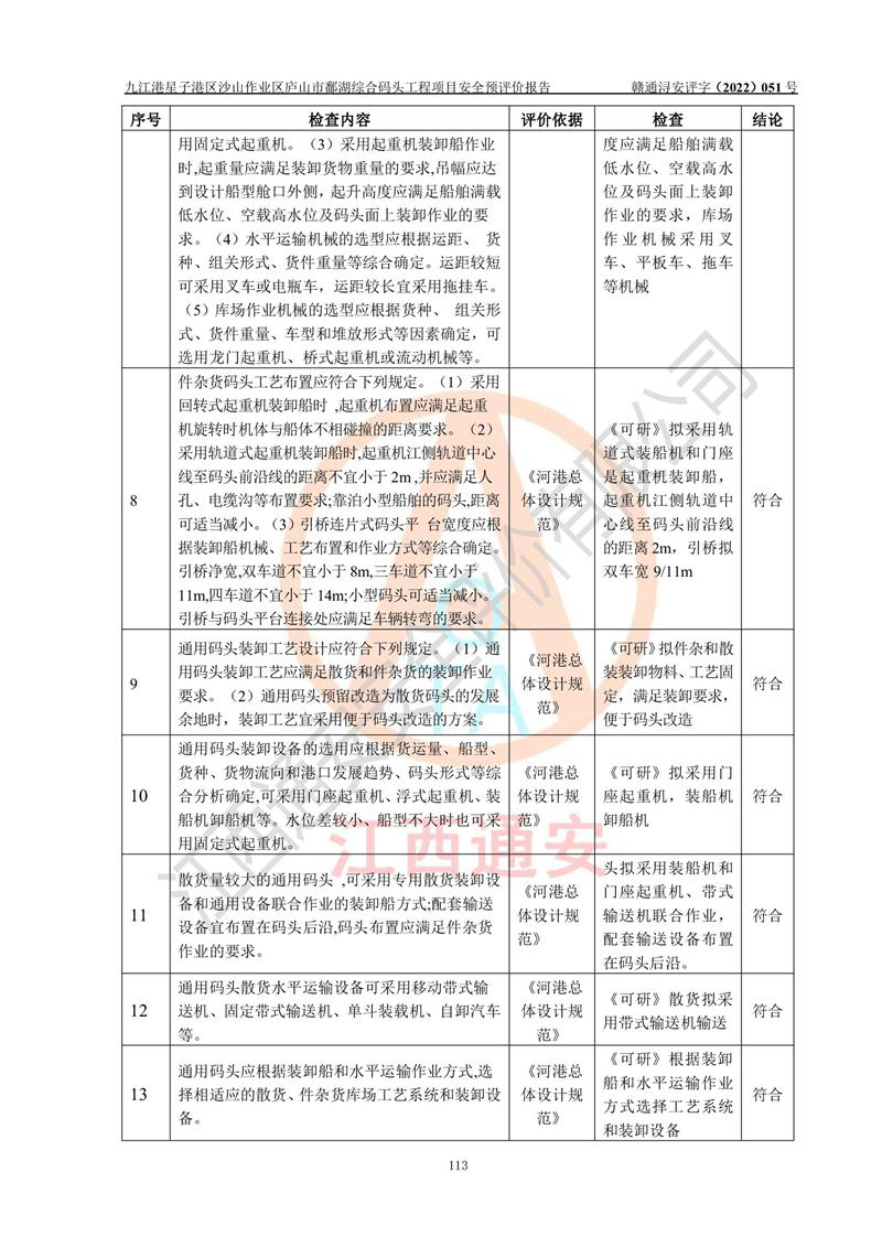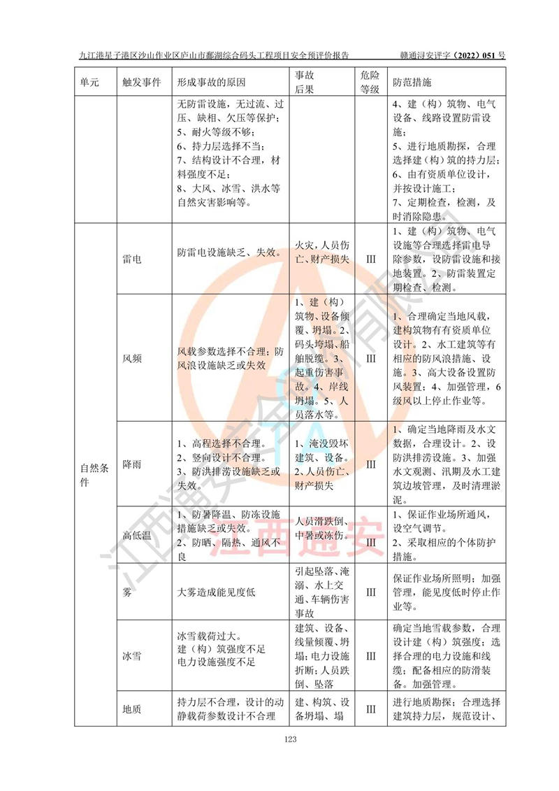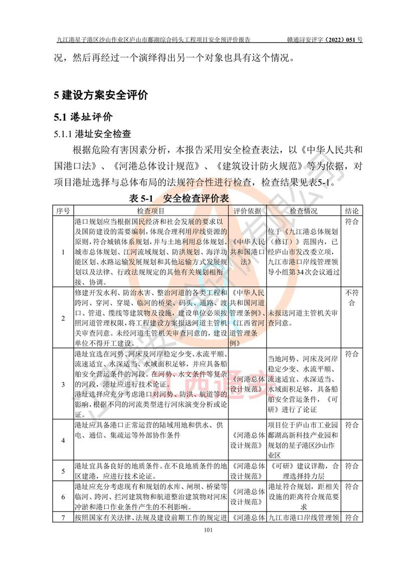 评价结论 | 九江港星子港区沙山作业区庐山市鄱湖综合码头工程项目的选址、周边环境、总体布局、自然环境能满足建设安全条件;项目选择的工艺过程及设备设施的安全可靠性能达到**法规、标准规定要求;项目存在的危险有害因素可控,在落实本评价报告和《可研》提出的有关安全对策措施后,其危险有害程度能达到可以接受的程度,项目建设能够实现安全运行的目标。 | |||||