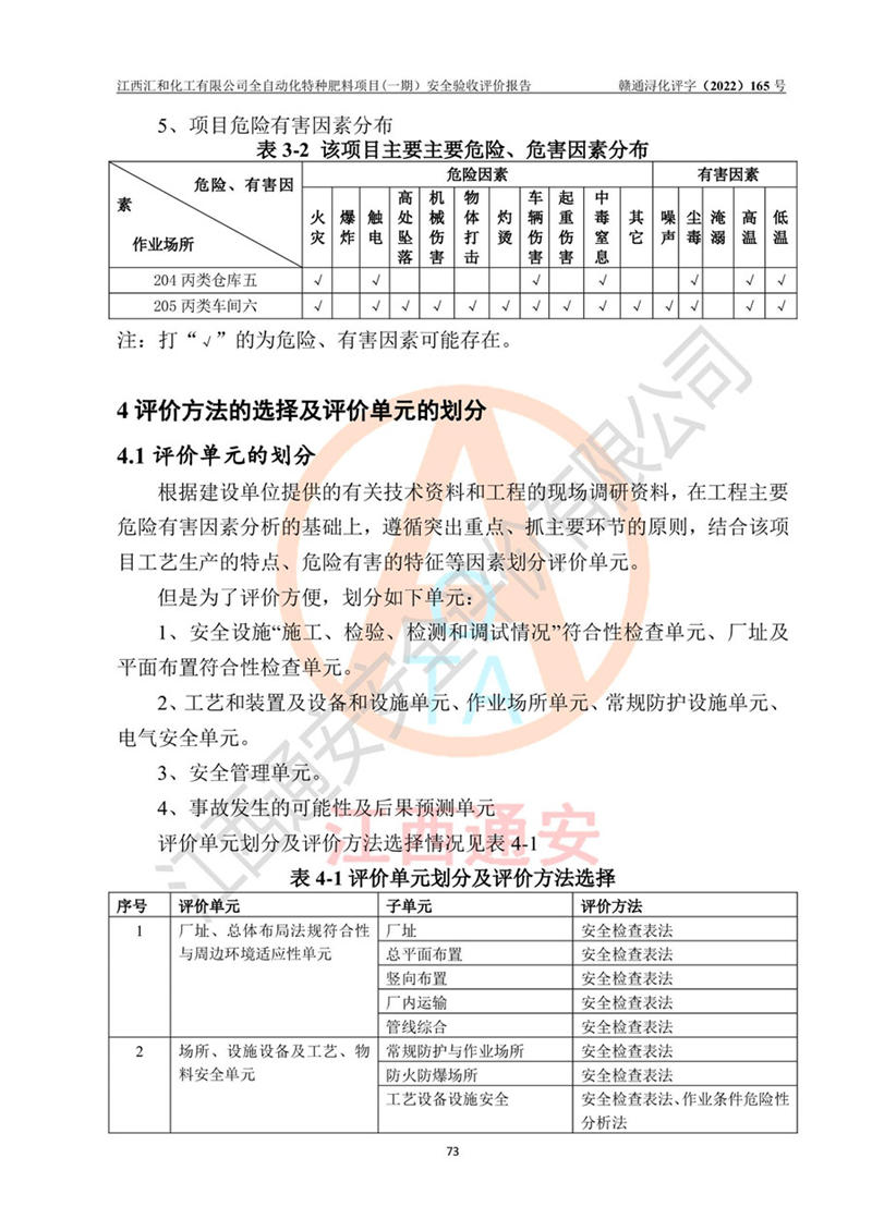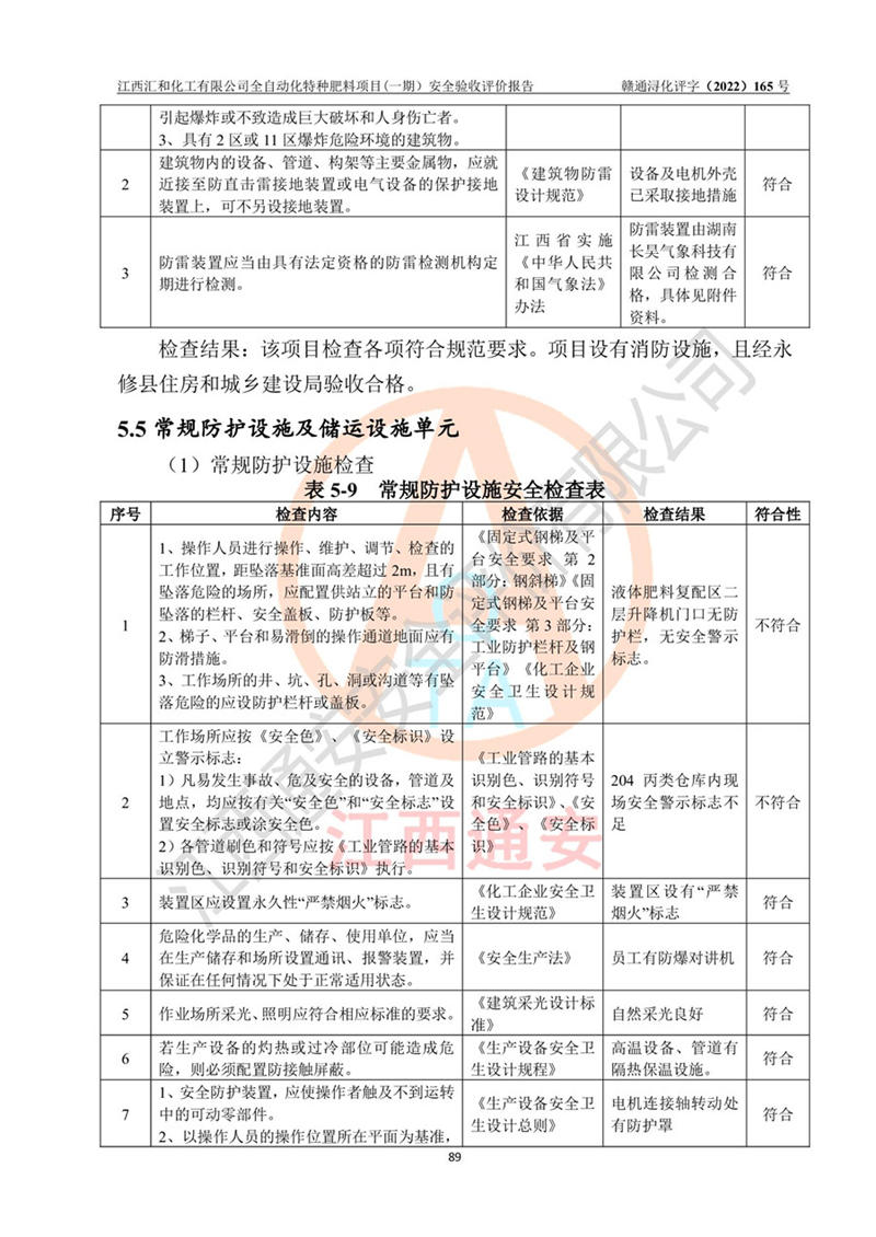 评价结论 | 评价结论:经评价组评价,江西汇和化工有限公司全自动化特种肥料项目(一期)现场总体布局、设备布置、自控系统情况与安全设计变更图纸一致;企业在役装置未涉及重点监管危险化学品,相关自控系统配置与安全设计相符并正常投用;企业主要负责人、安全负责人均不属于新入职,企业主要负责人及安全负责人已取得危险化学品生产企业主要负责人及安全管理人员考核合格证,符合三年专项整治要求。 江西汇和化工有限公司全自动化特种肥料项目(一期)配套安全装置、防护设施以及采取的安全技术措施及安全管理措施符合**有关法规、标准、规范要求,在落实本评价报告有关对策措施后,项目风险可控,其安全生产条件和安全管理方面具备竣工安全验收的条件。 | |||||||