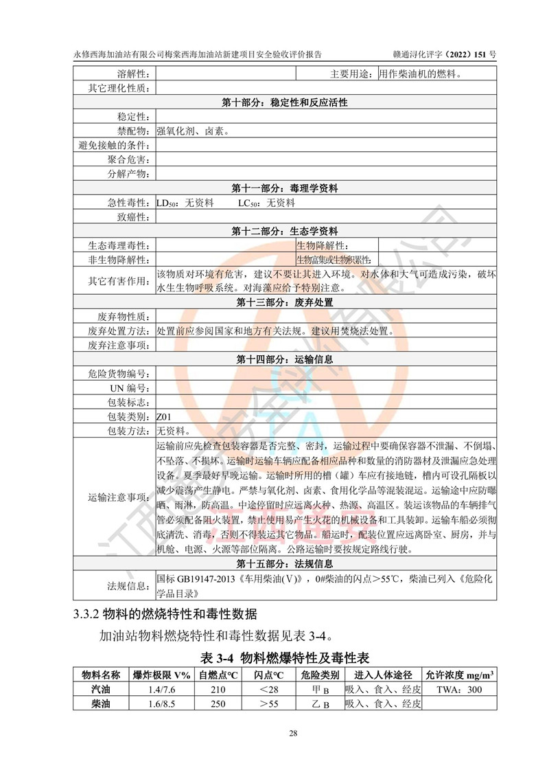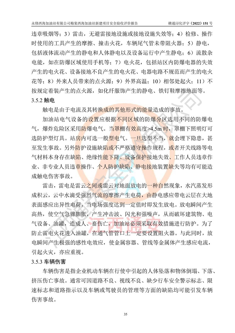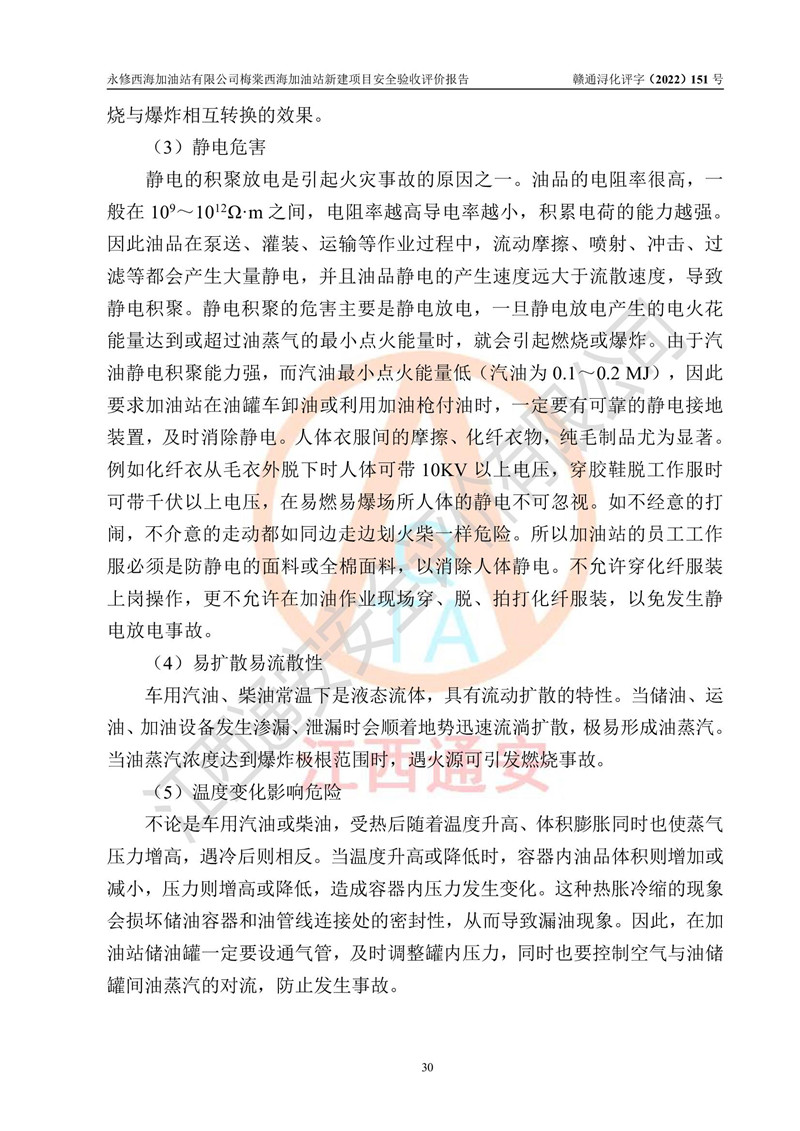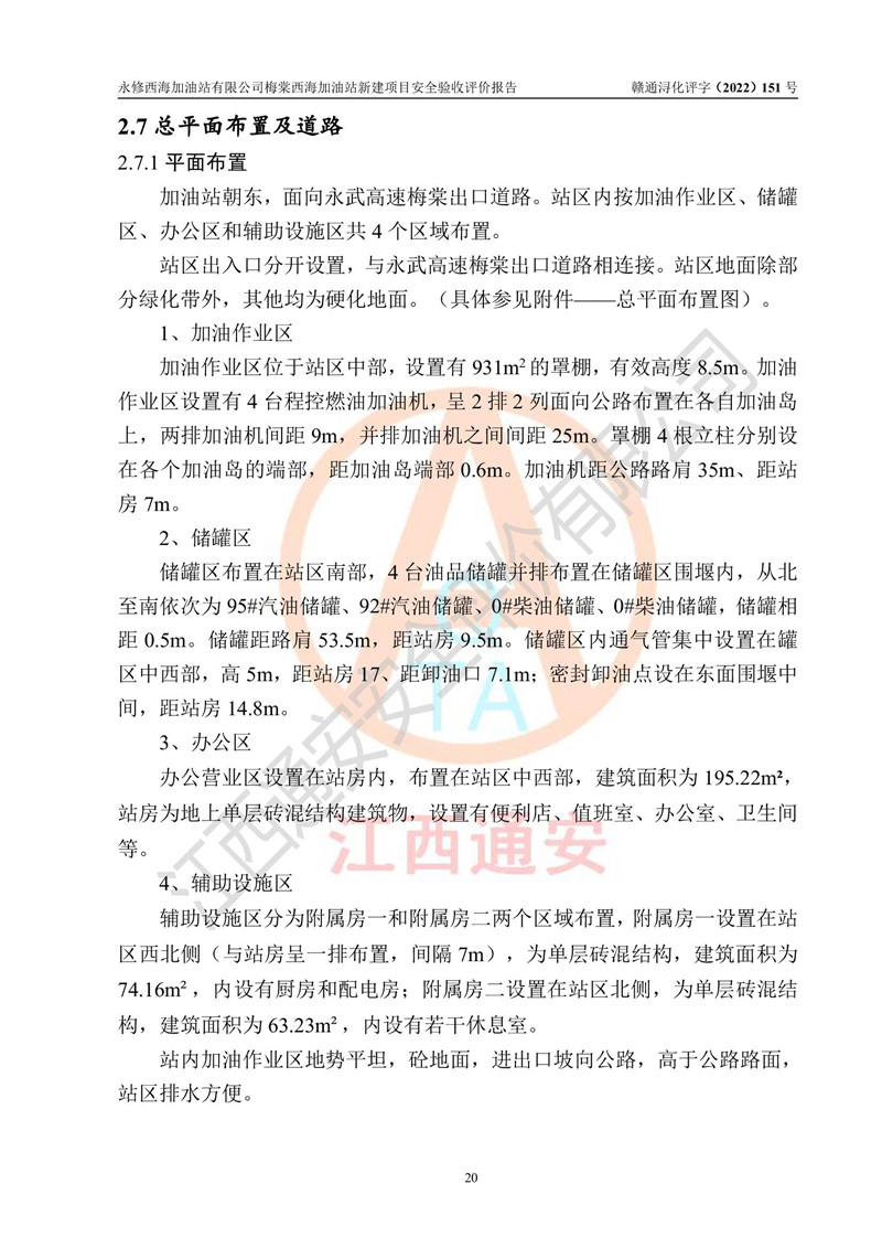 评价结论 | 永修西海加油站有限公司梅棠西海加油站新建项目涉及的安全条件、安全生产条件、安全生产管理符合《危险化学品经营许可证管理办法》、《汽车加油加气加氢站技术标准》等**有关法规、标准、规范要求,能满足成品油零售经营单位的安全条件,具备项目竣工验收的条件。 | |||