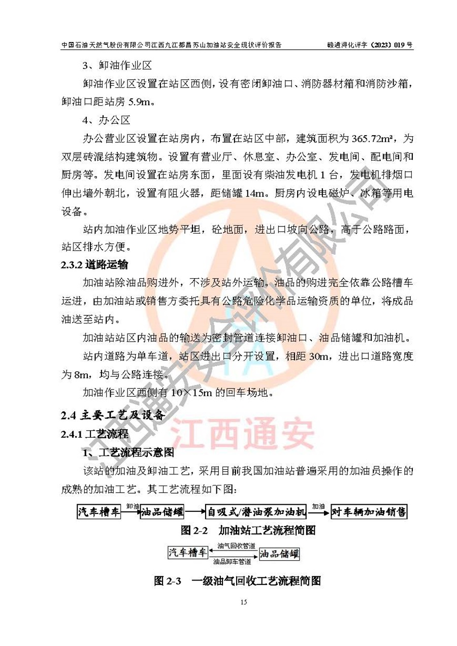 项目简介 | 中国石油天然气股份有限公司江西九江都昌苏山加油站是一家专门从事成品油零售经营的其他股份有限公司分公司(上市),经营场所位于九江市都昌县苏山乡前山村边。现有从业人员3名,其中安全管理人员1人,加油站负责人杨全荣。 该加油站占地面积1353.67m2,站区内设置有1台双枪和1台四枪税控燃油加油机及配套的工艺管线,设有SF双层储罐4台,其中30m3的92#汽油储罐1台、30m3的95#汽油储罐1台、30m3的0#柴油储罐2台,油品储罐总容积为120m3(折算成汽油为90 m3),按现行《汽车加油加气加氢站技术标准》对加油站的等级划分原则,属三级加油站。 该站由九江市行政审批局换发《危险化学品经营许可证》(证号:赣九行审经(甲)字[2022]000042号),**期限2020年05月10日至2023年05月09日。 | |||