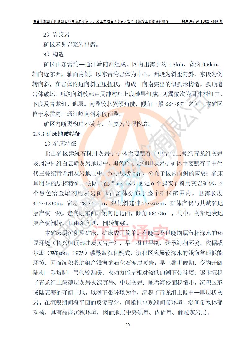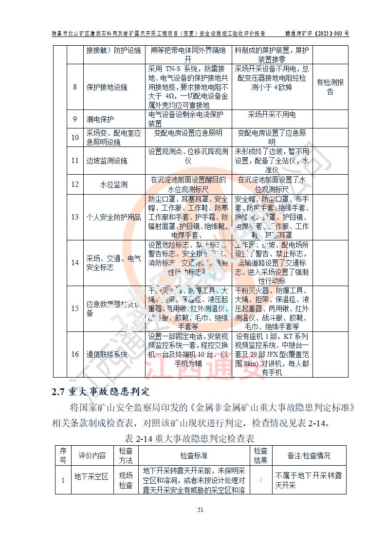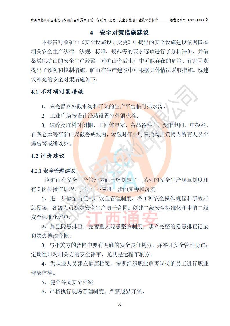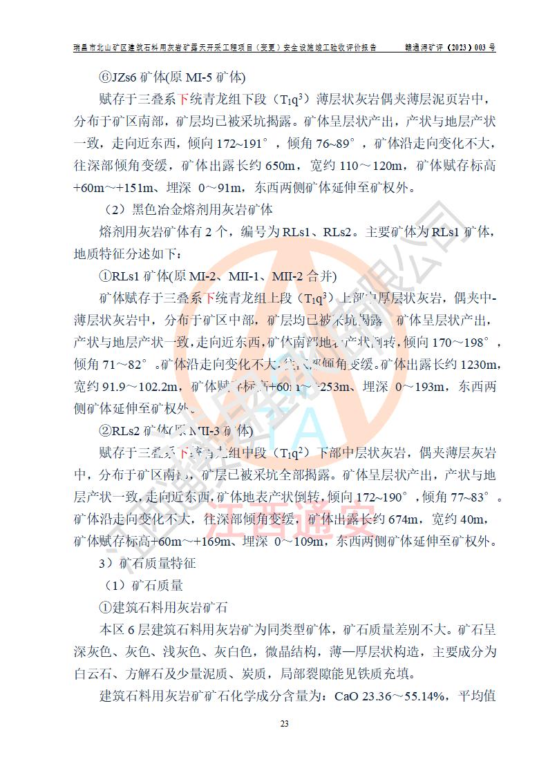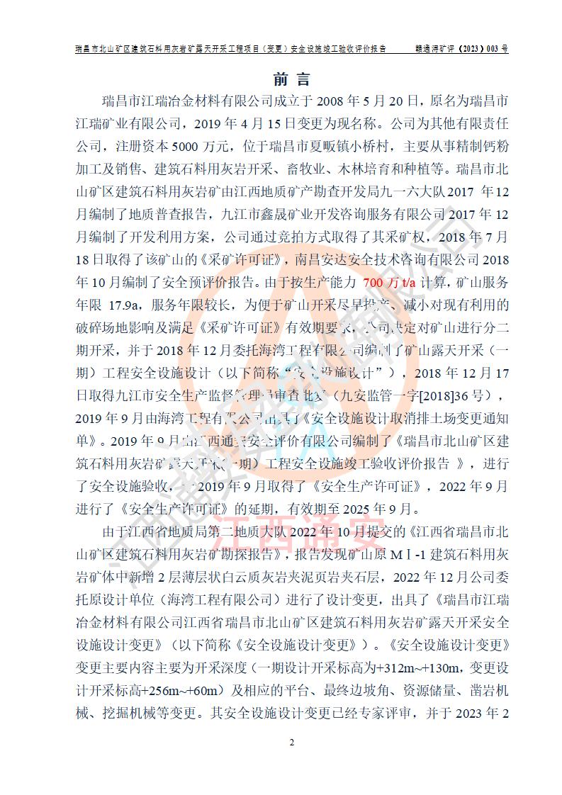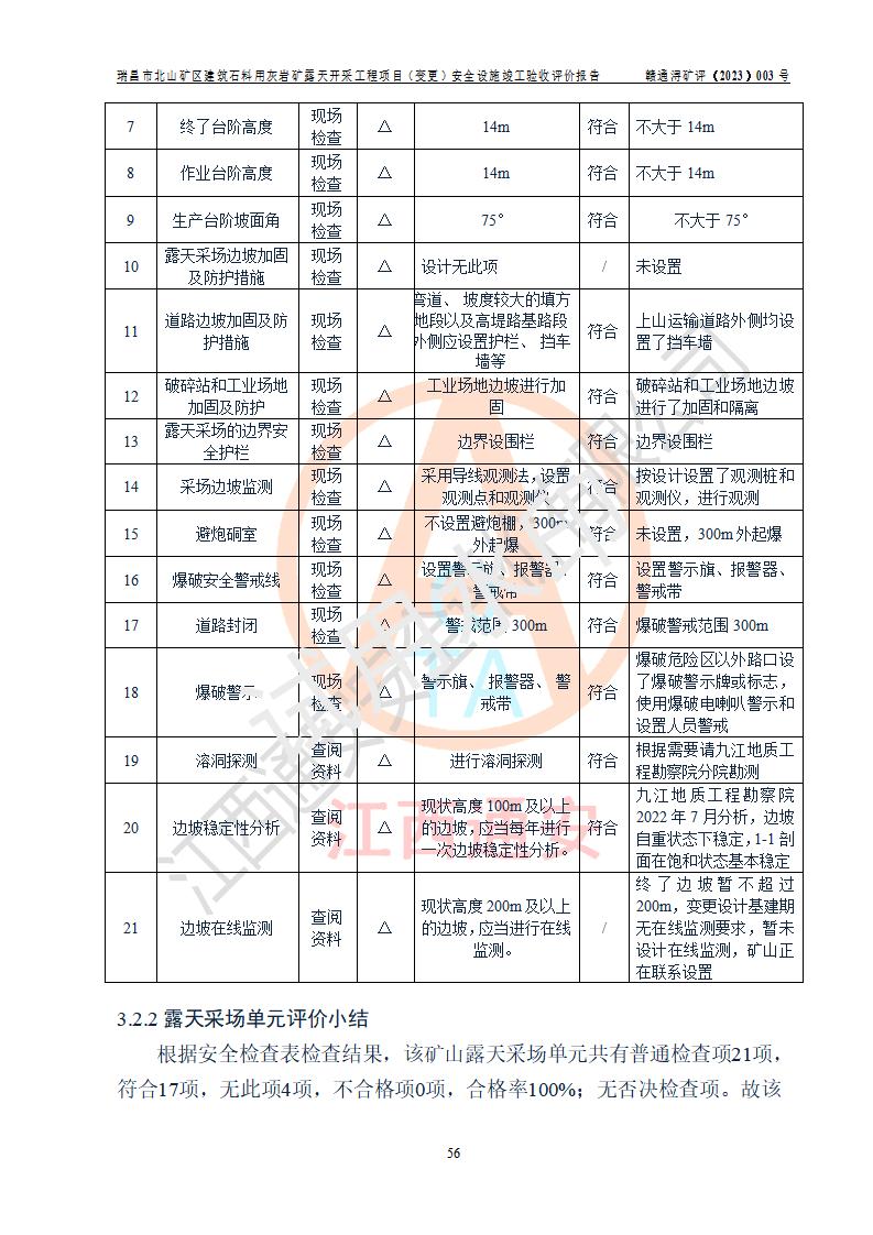 1)矿山无**矿山安全监察局印发的《金属非金属矿山重大事故隐患判定标准》规定的重大事故隐患。不构成《危险化学品重大危险源辨识》规定的危险化学品重大危险源。 2)企业应重点关注的安全对策:矿山*终边坡**达262m,*终边坡高差*过200m前,**设置边坡在线监测设施;破碎及堆料封闭棚、工间休息室、备品备件库、变配电间、中控室、石灰仓库等在矿山爆破警戒线内,爆破时作业时应撤离建筑物内所有人员至爆破警戒线以外;后期按《安全设施设计变更》设置清扫平台的排水沟;边坡角度、台阶**、平台宽度均应符合设计要求,并遵循**的有关规程、标准要求等。 评价结论:瑞昌市江瑞冶金材料有限公司瑞昌市北山矿区建筑石料用灰岩矿露天开采工程项目(变更)通过前期建设,周边环境、总平面布置、开采现场总体符合**安全生产法律、法规、规章、规范的要求,安全设施总体符合《瑞昌市江瑞冶金材料有限公司瑞昌市北山矿区建筑石料用灰岩矿露天开采工程项目安全设施设计变更》的要求,满足安全生产条件。 瑞昌市江瑞冶金材料有限公司瑞昌市北山矿区建筑石料用灰岩矿露天开采工程项目(变更)具备安全设施竣工验收条件。 |