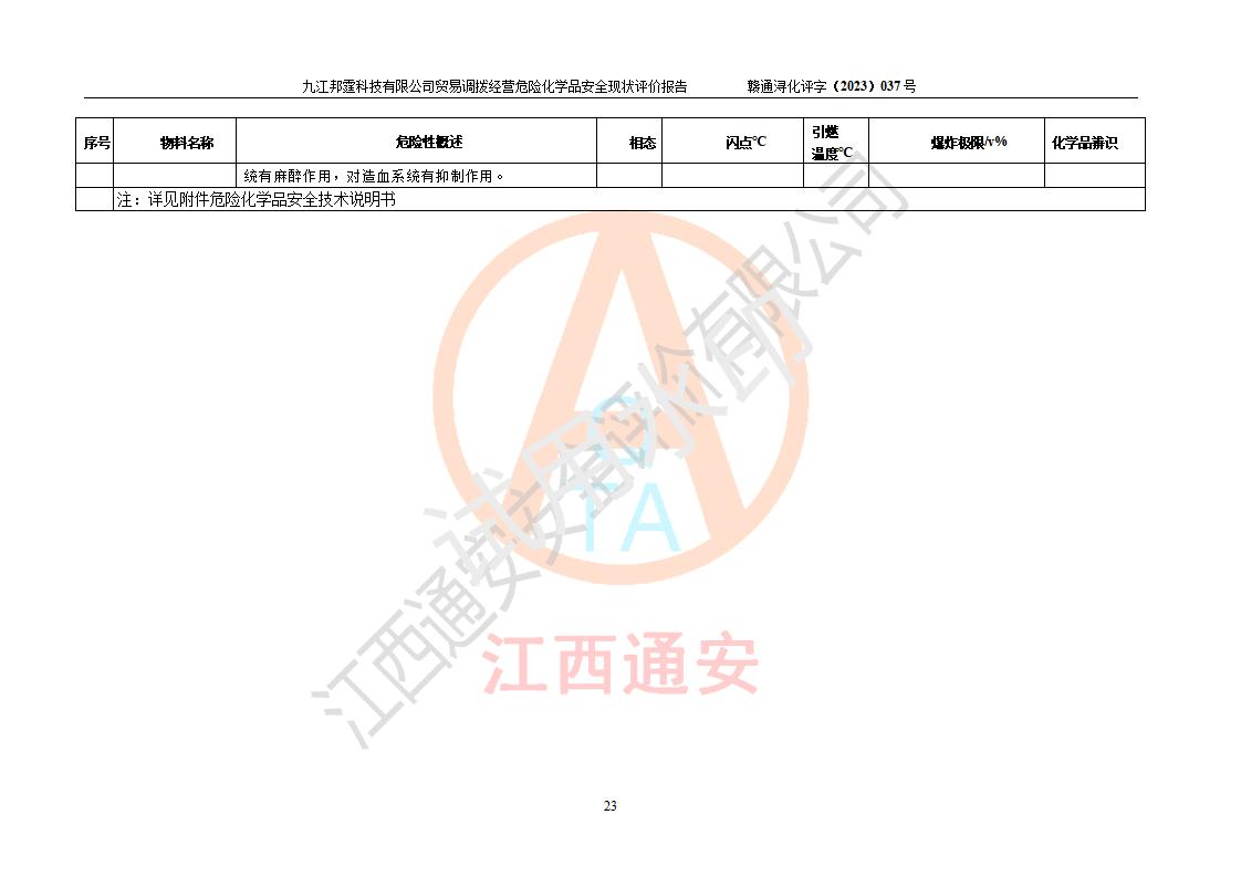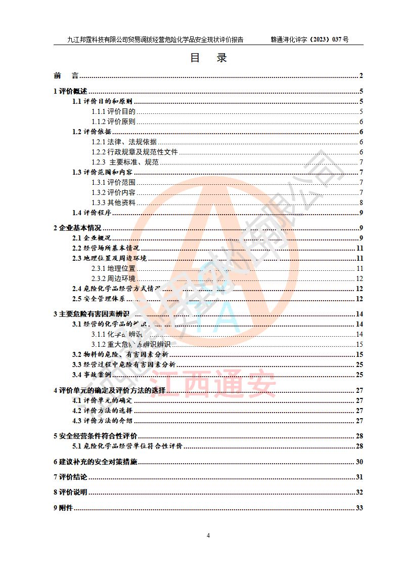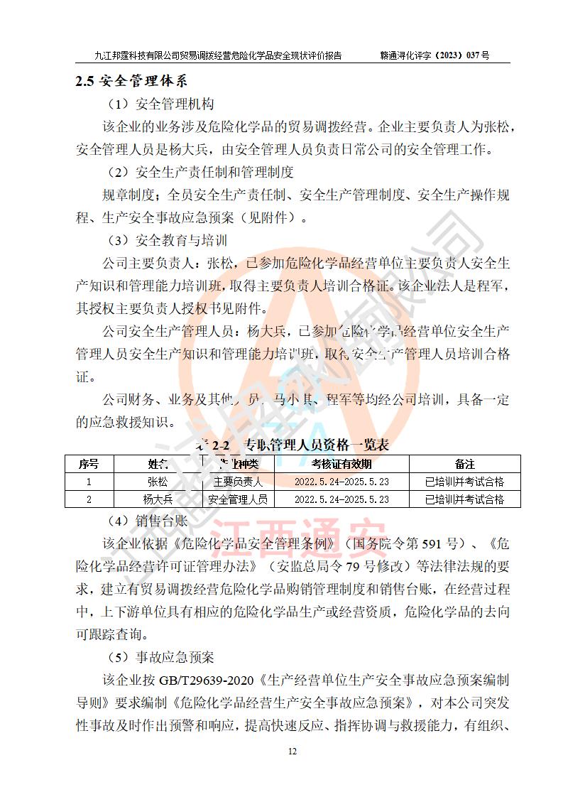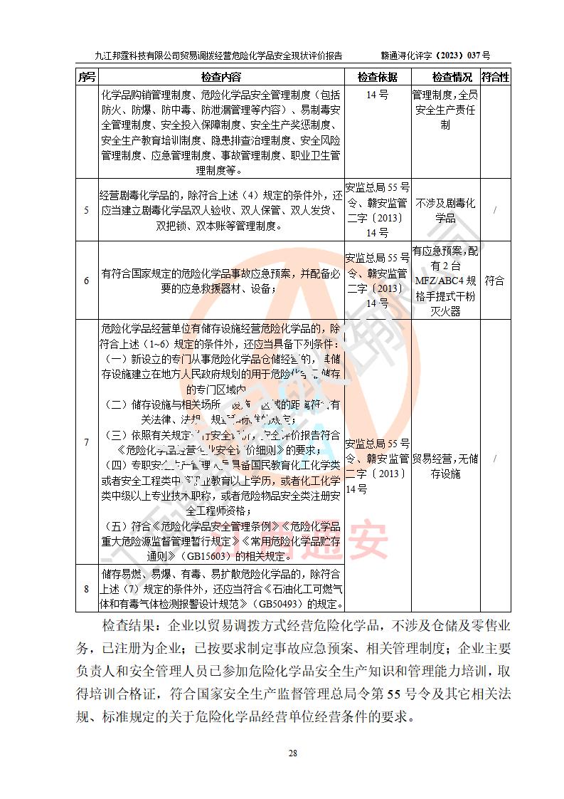 评价结论 | 九江邦霆科技有限公司贸易调拨经营危险化学品的安全条件符合**有关法规、标准、规范要求,落实评价报告有关建议后,风险可控,具备危险化学品经营安全条件。 | |||||
