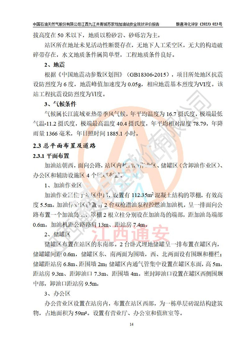 项目简介 | 中国石油天然气股份有限公司江西九江共青城苏家垱加油站是一家专门从事成品油零售经营的其他股份有限公司分公司(上市),经营场所位于九江市共青城市苏家垱乡高梁地段、横苏公路东侧。现有从业人员3名,其中安全管理人员1人,加油站负责人杨全荣。 该加油站占地面积800m2,站区内设置有2台双枪税控燃油加油机及配套的工艺管线,设有SF双层储罐2台,其中30m3的92#汽油储罐1台、30m3的0#柴油储罐1台,油品储罐总容积为60m3(折算成汽油为45 m3),按现行《汽车加油加气加氢站技术标准》对加油站的等级划分原则,属三级加油站。 该站由共青城市行政审批局换发《危险化学品经营许可证》(证号:赣共危化经字[2017]000001号),**期限2020年05月19日至2023年05月18日。 | |||