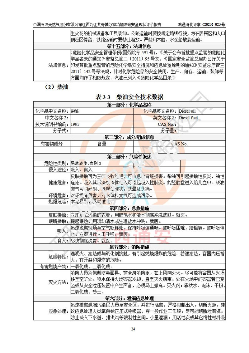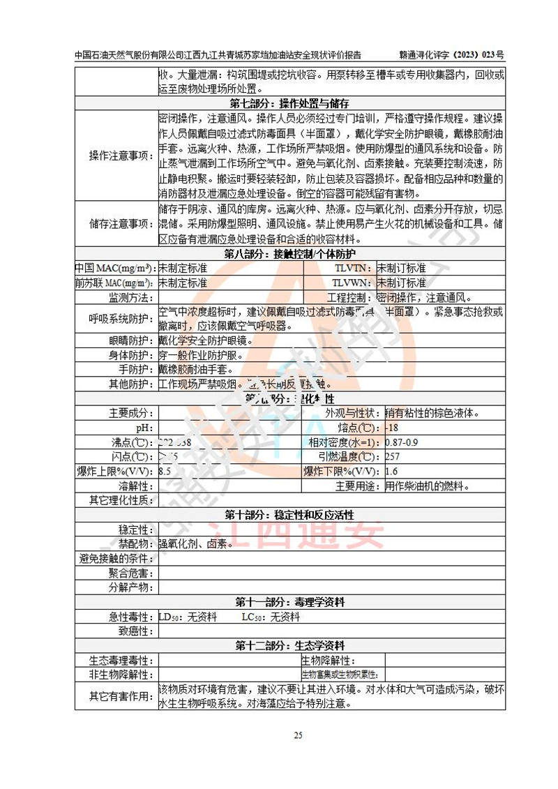 评价结论 | 中国石油天然气股份有限公司江西九江共青城苏家垱加油站涉及的安全条件、安全经营条件、安全生产管理符合《危险化学品经营许可证管理办法》、《汽车加油加气加氢站技术标准》等**有关法规、标准、规范要求,能满足危险化学品经营安全条件。 | |||