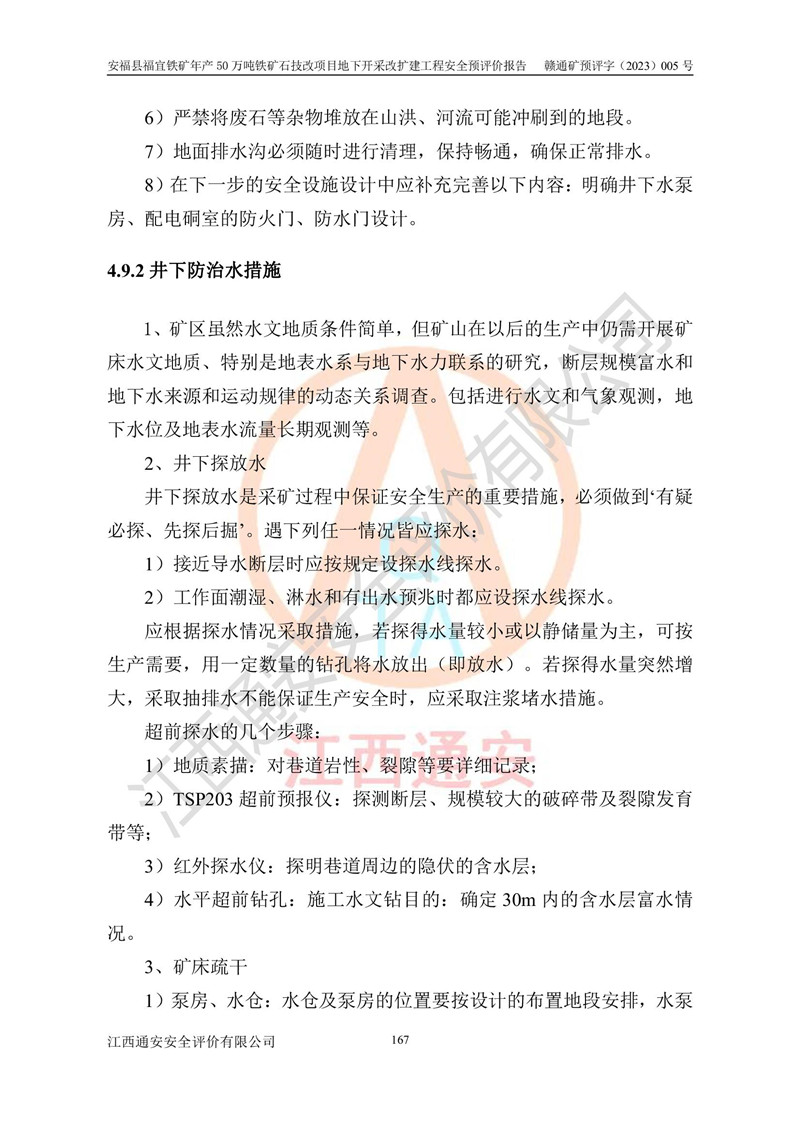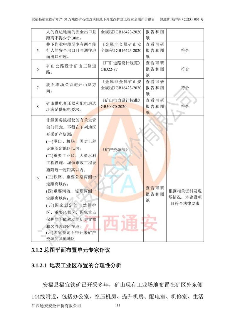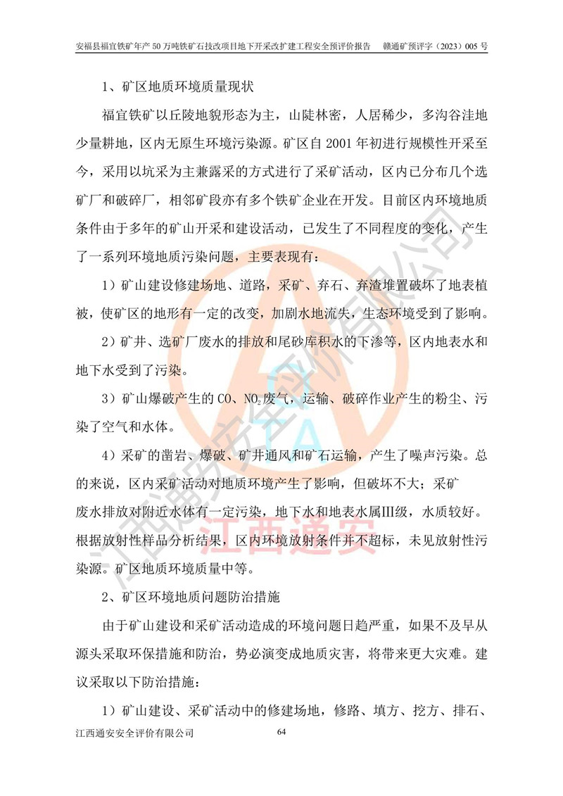其它 | 安福县福宜铁矿年产50万吨铁矿石技改项目地下开采改扩建工程《可研报告》设计的开采方案总体可行,未使用**明令禁止使用的设备、材料和工艺,没有重大危险源。针对该项目在今后建设和生产中潜在的危险、有害因素,在安全设施设计阶段充分采纳《可研报告》及本《安全预评价报告》中提出的安全对策措施与建议,严格执行《金属非金属矿山安全规程》等的要求,是可以得到**控制的,在安全对策措施建议得到**落实后,风险是可以接受的,可以**该矿生产的安全运行。 安福县福宜铁矿年产50万吨铁矿石技改项目地下开采改扩建工程从安全生产角度符合**有关法律、法规、标准和规范的要求。 | ||||