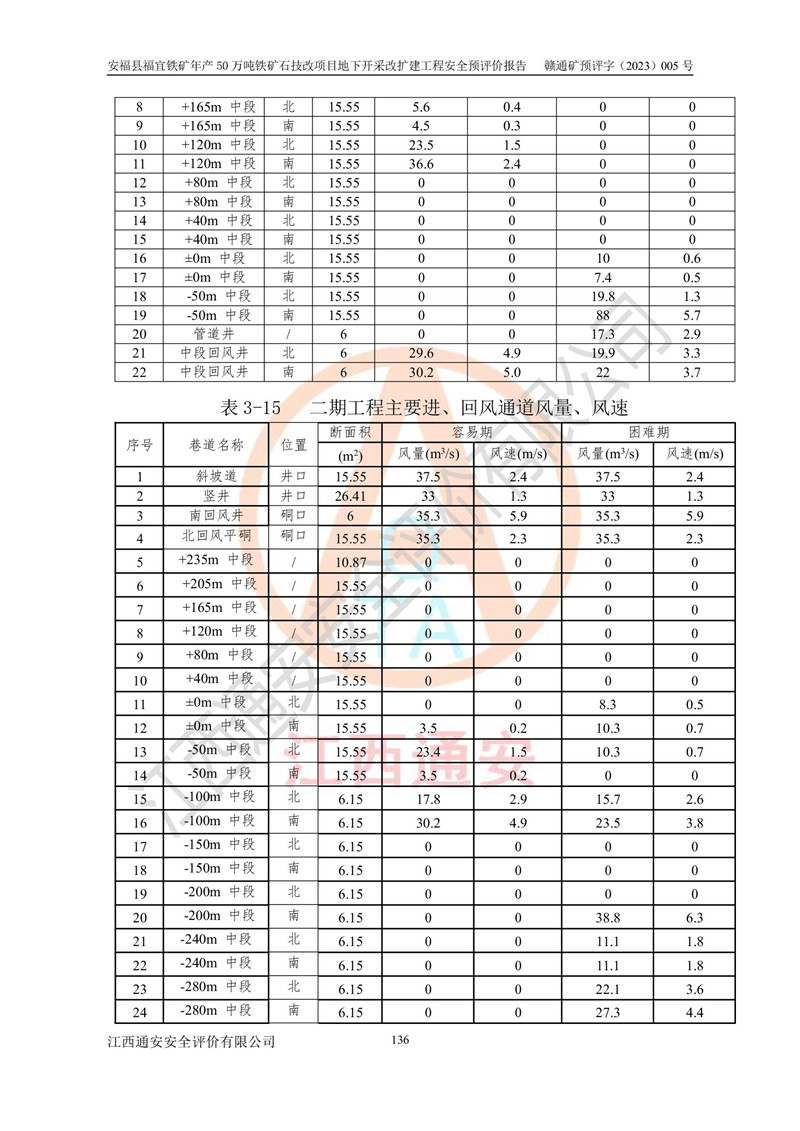 项目简介 | 安福县福宜铁矿属普通合伙企业。安福福宜铁矿区位于位于江西省安福县境内,属安福县赤谷乡管辖,距安福县城45°方向约25**。地理座标:东经114°41′10″~114°41′50″,北纬27°35′09″~27°35′59″。福宜铁矿区长约1.3**,宽约0.45**,面积0.5582平方**。 矿区有(大元~松山)长达7**的简易公路与分(宜)-文(竹)铁路及安福-分宜公路相接,往北21**与浙赣铁路分宜站相接。交通尚属方便。 2022年8月11日,取得江西省自然资源厅颁发的《采矿许可证》,证号:C3600002011012120103985;采矿权人:安福县福宜铁矿;地址:江西省吉安市安福县赤谷乡;矿山名称:安福县福宜铁矿;经济类型:私营合伙企业;开采矿种:铁矿;开采方式:地下开采;生产规模:50.00 万吨/年,矿区面积:0.5582平方**;开采深度:由+360米至-280米标高;**期限:壹年壹拾月,自 2022年7月17日至 2024年 5月17日。 2022年9月,矿山委托江西省冶金设计院有限责任公司编制了《安福县杨家桥铁矿矿区福宜铁矿扩深项目改扩建工程可行性研究报告》(以下简称为《可研报告》)。根据《可研报告》,安福县福宜铁矿年产50万吨铁矿石技改项目地下开采改扩建工程主要对采矿许可证范围内184线~136线+205m~-280m标高的矿体进行分期开采,一期工程开采184线~160线+205m~-50m标高及160线~136线+165m~-50m 标高的矿体(160线~136线+165m 标高以上为原设计开采范围,184线~160线+205m以上为前期民采空区和露天采场,不在本次可研开采范围内),二期工程开采184线~136 线-50m~-280m标高的矿体。本次安全预评价范围为安福县福宜铁矿年产50万吨铁矿石技改项目地下开采改扩建工程。 2022年12月27日获得《江西省工业和信息化厅关于安福县福宜铁矿年产50万吨铁矿石技改项目的批复》(赣工信冶金〔2022〕78号)。 本项目已经符合编制安全预评价的前置条件。根据《中华人民共和国安全生产法》和《建设项目安全设施“三同时”监督管理办法》的规定,安福县福宜铁矿2022年9月1日委托我公司(江西通安安全评价有限公司)对其安福县福宜铁矿年产50万吨铁矿石技改项目地下开采改扩建工程进行安全预评价。我公司接受委托后组建了评价项目组,评价人员先后于2022年9月24日、2023年2月17日及2月23日到项目现场进行勘查,收集矿山安全管理和安全预评价所需的有关资料。 | ||||