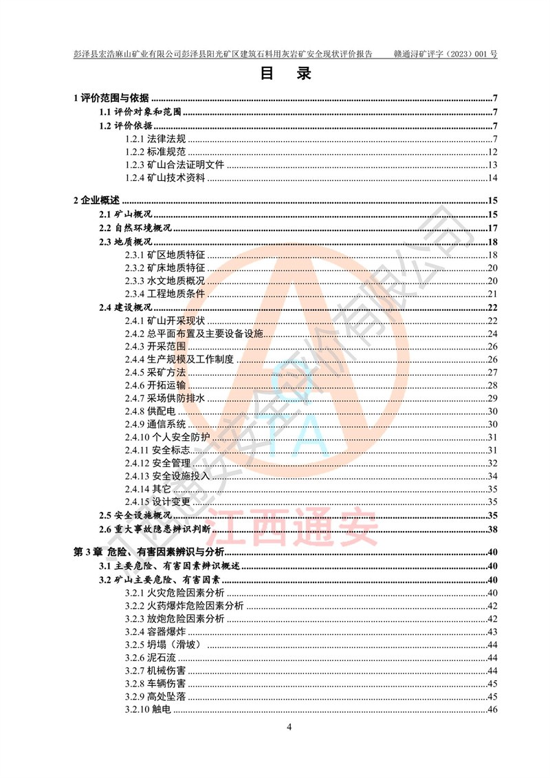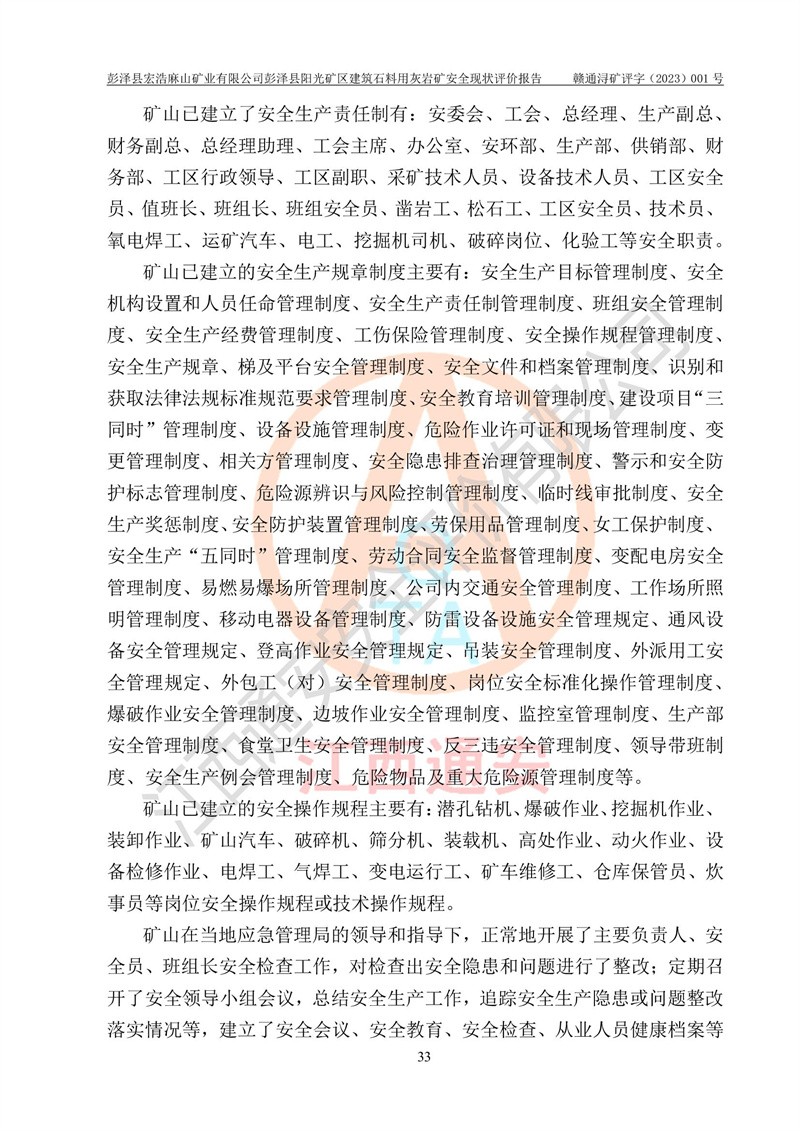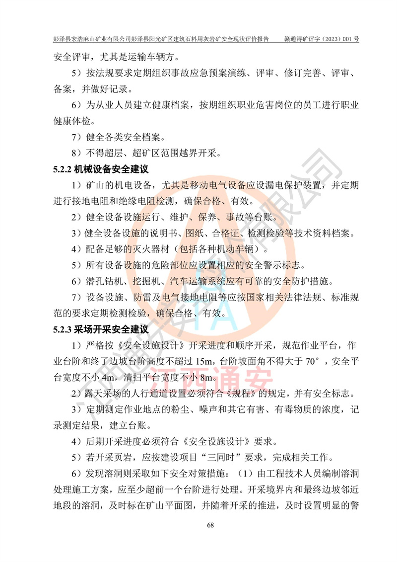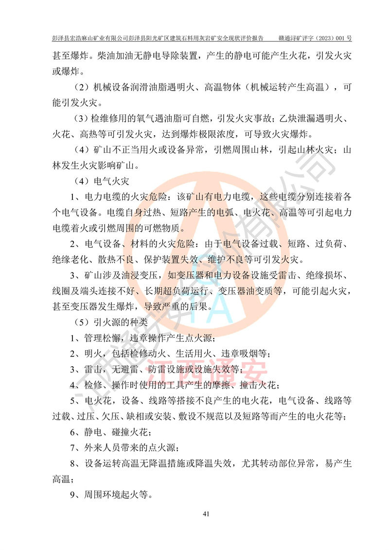 (1)矿山存在火灾、火药爆炸、雷管爆炸、放炮、坍塌(滑坡)、泥石流、机械伤害、容器爆炸、高处坠落、**伤害、触电与雷击、物体打击、淹溺、高低温、振动、粉尘危害等危险有害因素。矿山无**矿山安全监察局印发的《金属非金属矿山重大生产安全事故隐患判定标准》规定的重大事故隐患;不构成《危险化学品重大危险源辨识》规定的重大危险源。 (2)矿山总体符合《彭泽县宏浩麻山矿业有限公司彭泽县阳光矿区建筑石料用灰岩矿安全设施设计》和**安全生产法律、法规和行业标准、规范的要求。。 (3)矿山应重点防范的重大危险有害因素有:坍塌、放炮、**伤害等。 总体结论:彭泽县宏浩麻山矿业有限公司彭泽县阳光矿区建筑石料用灰岩矿周边环境符合法规要求;安全设施总体符合《彭泽县宏浩麻山矿业有限公司彭泽县阳光矿区建筑石料用灰岩矿安全设施设计》的要求,风险可控,满足安全生产条件。 |