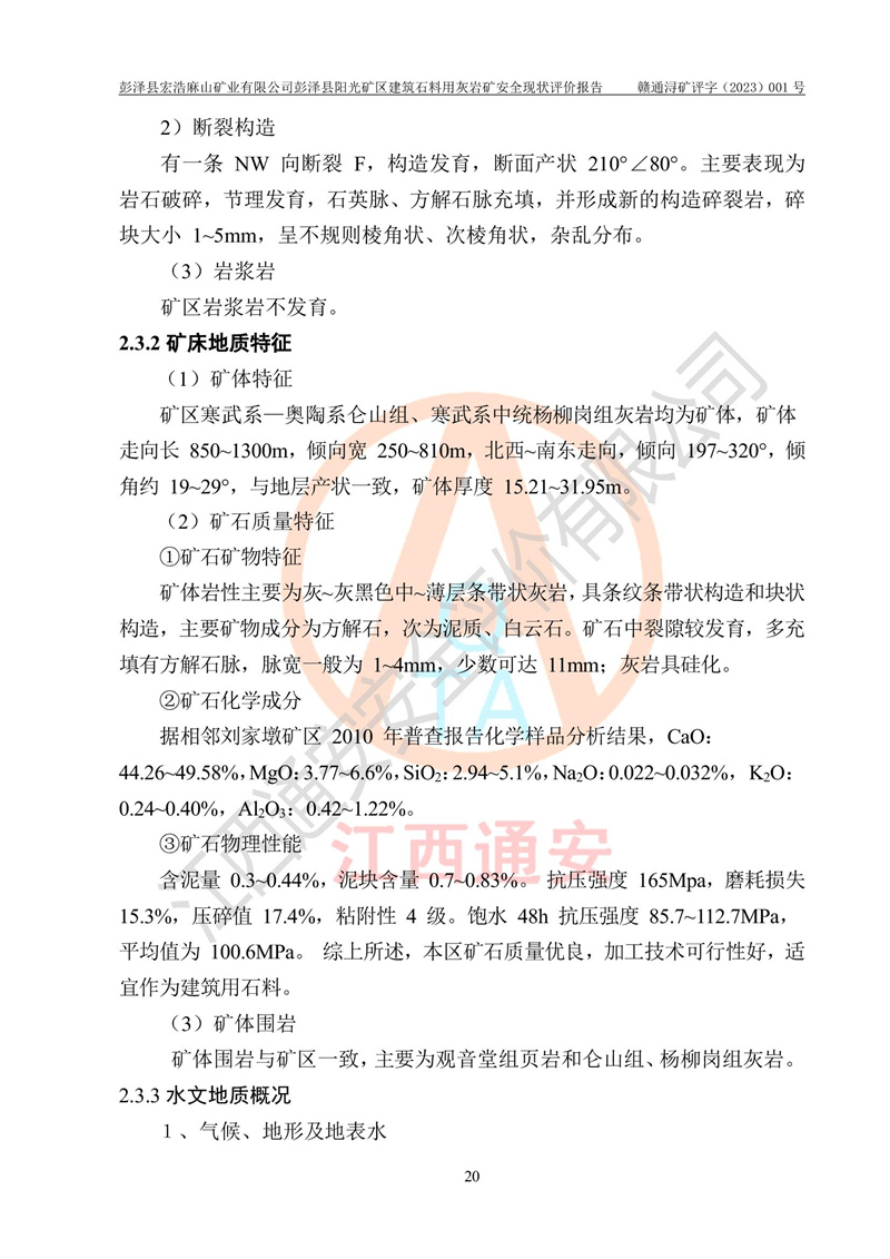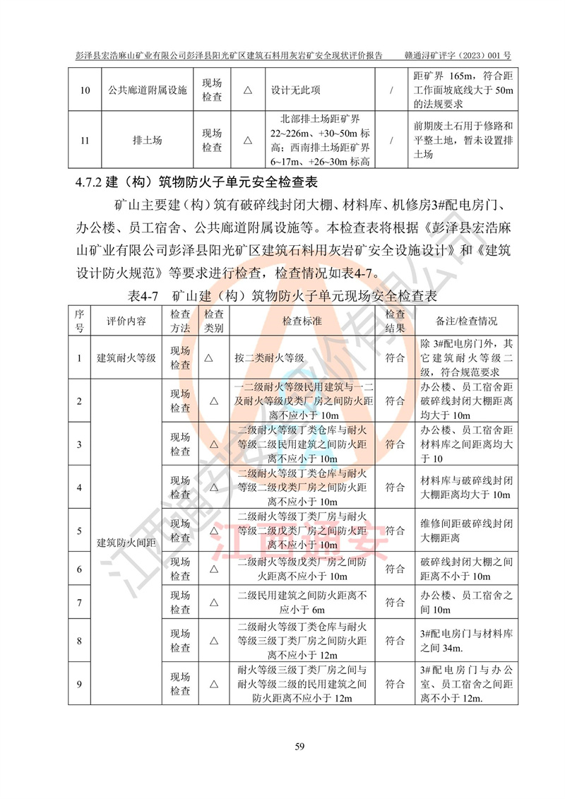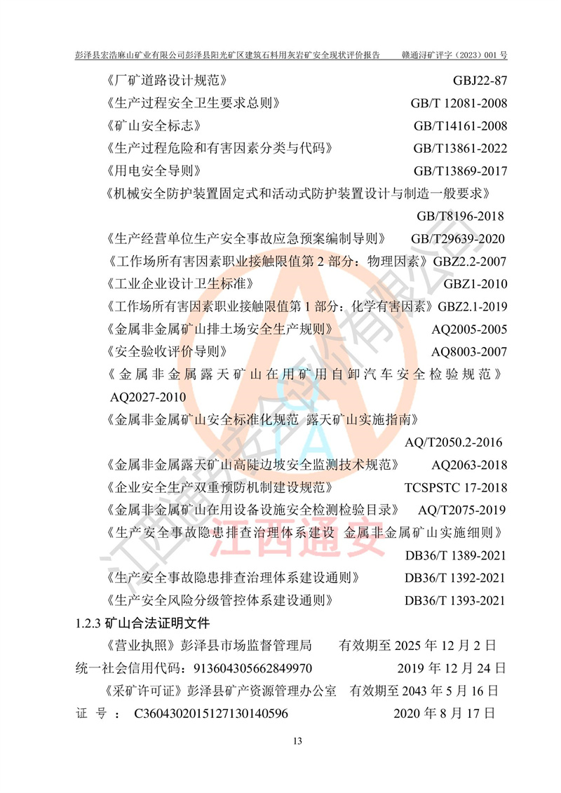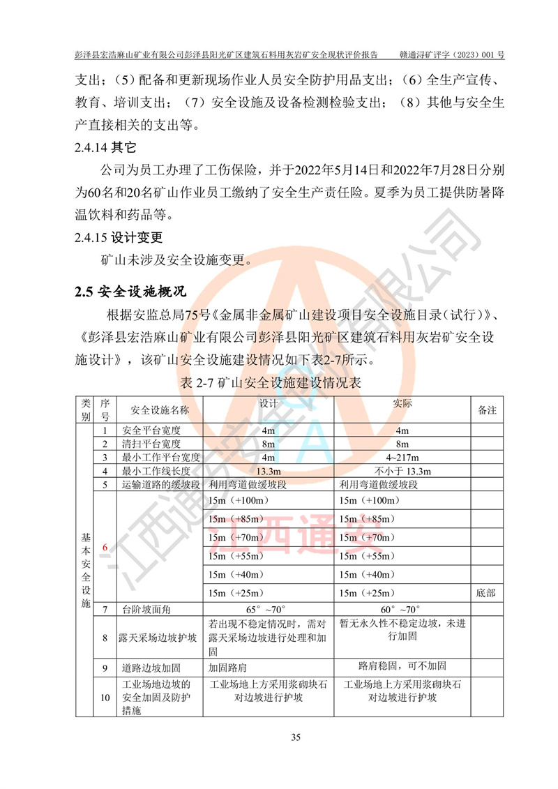(1)矿山存在火灾、火药爆炸、雷管爆炸、放炮、坍塌(滑坡)、泥石流、机械伤害、容器爆炸、高处坠落、**伤害、触电与雷击、物体打击、淹溺、高低温、振动、粉尘危害等危险有害因素。矿山无**矿山安全监察局印发的《金属非金属矿山重大生产安全事故隐患判定标准》规定的重大事故隐患;不构成《危险化学品重大危险源辨识》规定的重大危险源。 (2)矿山总体符合《彭泽县宏浩麻山矿业有限公司彭泽县阳光矿区建筑石料用灰岩矿安全设施设计》和**安全生产法律、法规和行业标准、规范的要求。。 (3)矿山应重点防范的重大危险有害因素有:坍塌、放炮、**伤害等。 总体结论:彭泽县宏浩麻山矿业有限公司彭泽县阳光矿区建筑石料用灰岩矿周边环境符合法规要求;安全设施总体符合《彭泽县宏浩麻山矿业有限公司彭泽县阳光矿区建筑石料用灰岩矿安全设施设计》的要求,风险可控,满足安全生产条件。 |