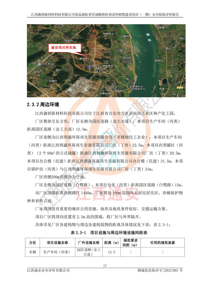 项目简介 | 江西森钥新材料科技有限公司(以下简称“公司”)位于江西省吉安市吉水县河西工业区林产化工园,于2020年8月6日注册成立,注册资金壹仟万元,统一社会信用代码:91360822MA399T7C1B,法人**杨金泉,属有限责任公司(自然人投资或控股),经营范围:一般项目:**化学产品销售(不含危险化学品),**化学产品制造(不含危险化学品)、货物进出口(除许可业务外,可自主依法经营法律法规非禁止或限制的项目)。 公司于2020年10月22日取得吉水县发展和改革委员会印发的《江西省企业投资项目备案通知书》(统一项目代码:2020-360822-26-03-031928),项目名称:江西森钥新材料科技有限公司食品级松香甘油酯和松香改性树脂建设项目。 公司于2021年4月委托江西省赣华安全科技有限公司编制《江西森钥新材料科技有限公司年产5000吨食品级松香甘油脂和10000吨松香改性树脂生产线安全预评价报告》;于2021年8月委托山东富海石化工程有限公司编制《江西森钥新材料科技有限公司食品级松香甘油酯和松香改性树脂建设项目安全设施设计》;于2022年12月公司委托山东富海石化工程有限公司进行安全设施设计变更(部分图纸变更)。 | ||||