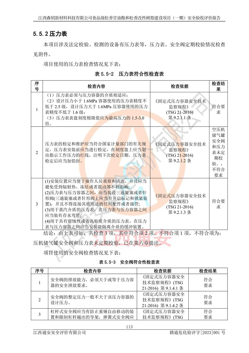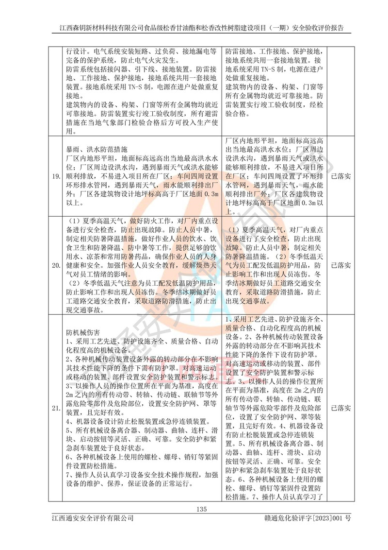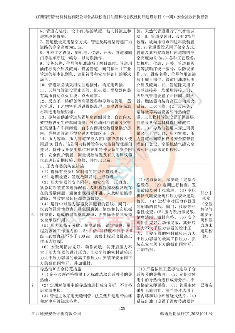 评价结论 | 本报告认为,江西森钥新材料科技有限公司食品级松香甘油酯和松香改性树脂建设项目(一期)生产装置现场情况与设计图纸一致,安全设施及安全管理符合**及有关部门关于安全生产法律、法规、标准的要求,安全风险程度是可以接受的,安全风险可控,符合安全生产条件,能够满足安全生产的要求,具备安全设施“三同时”验收条件。 | ||||