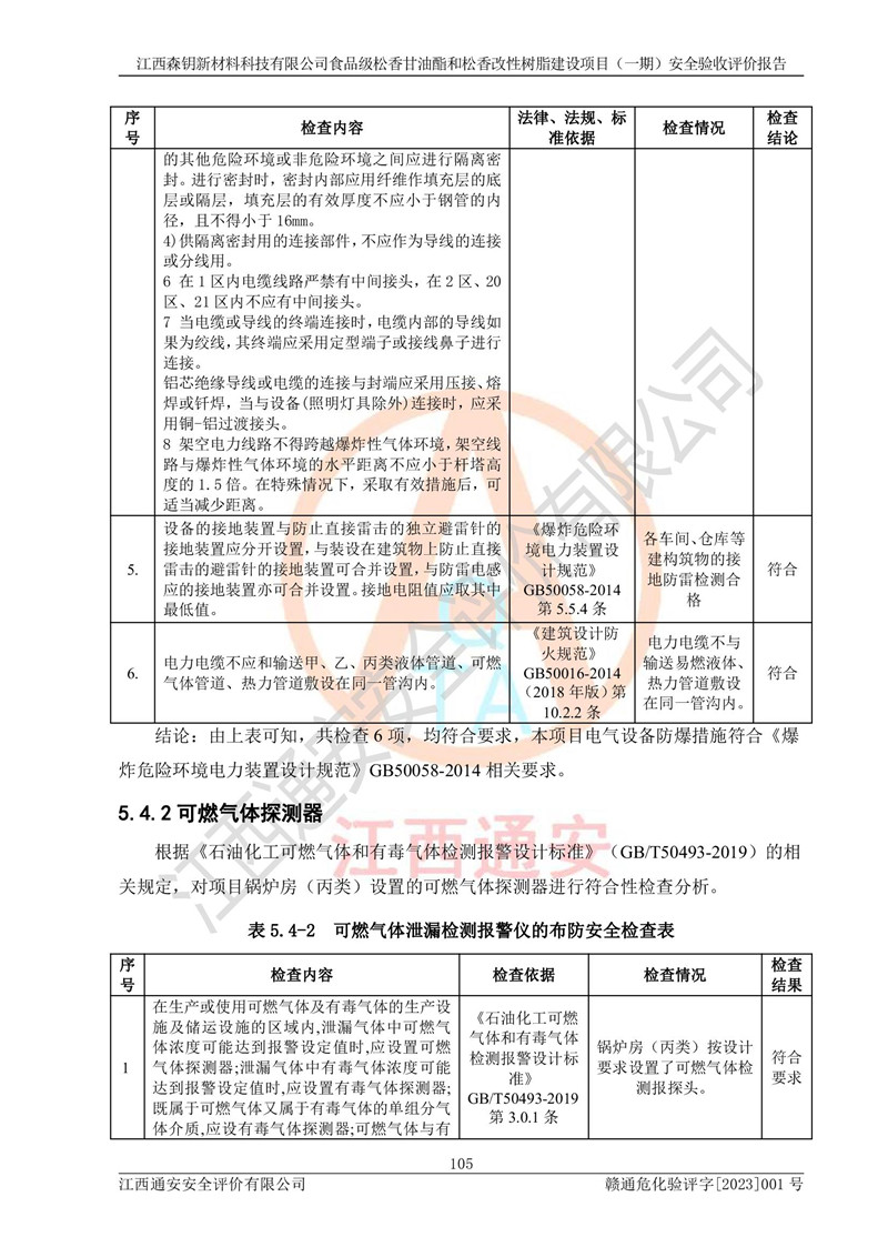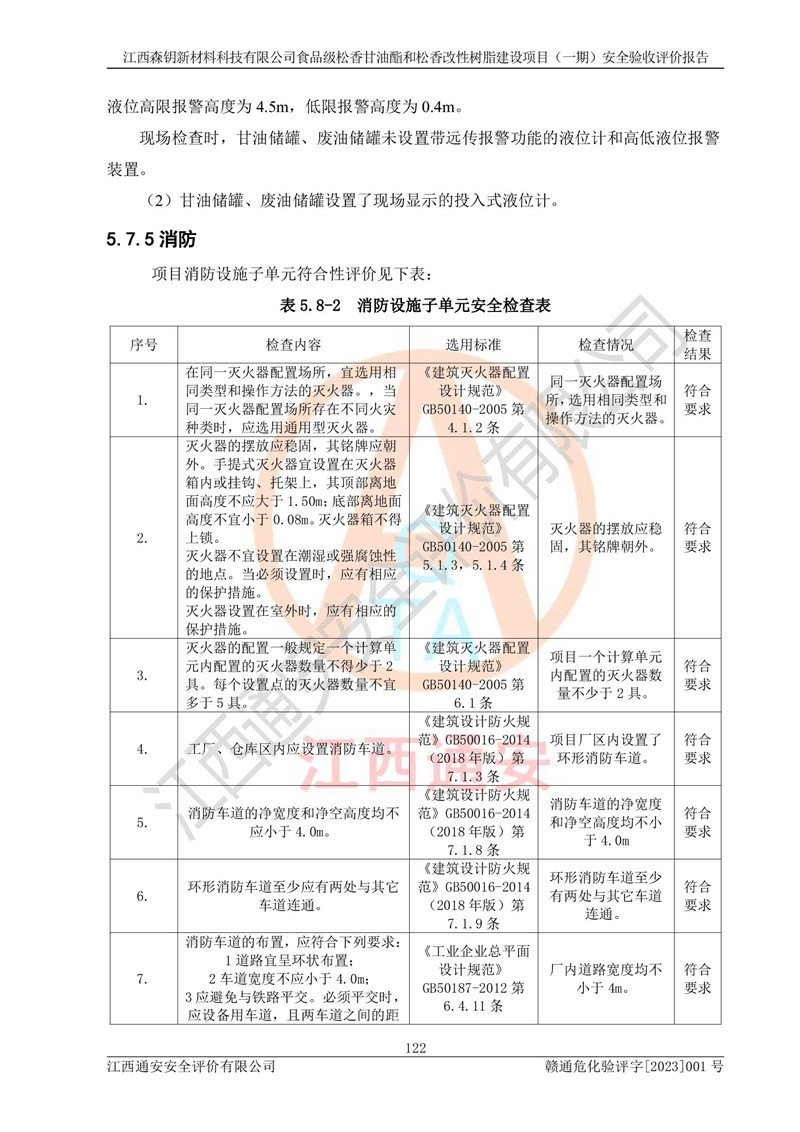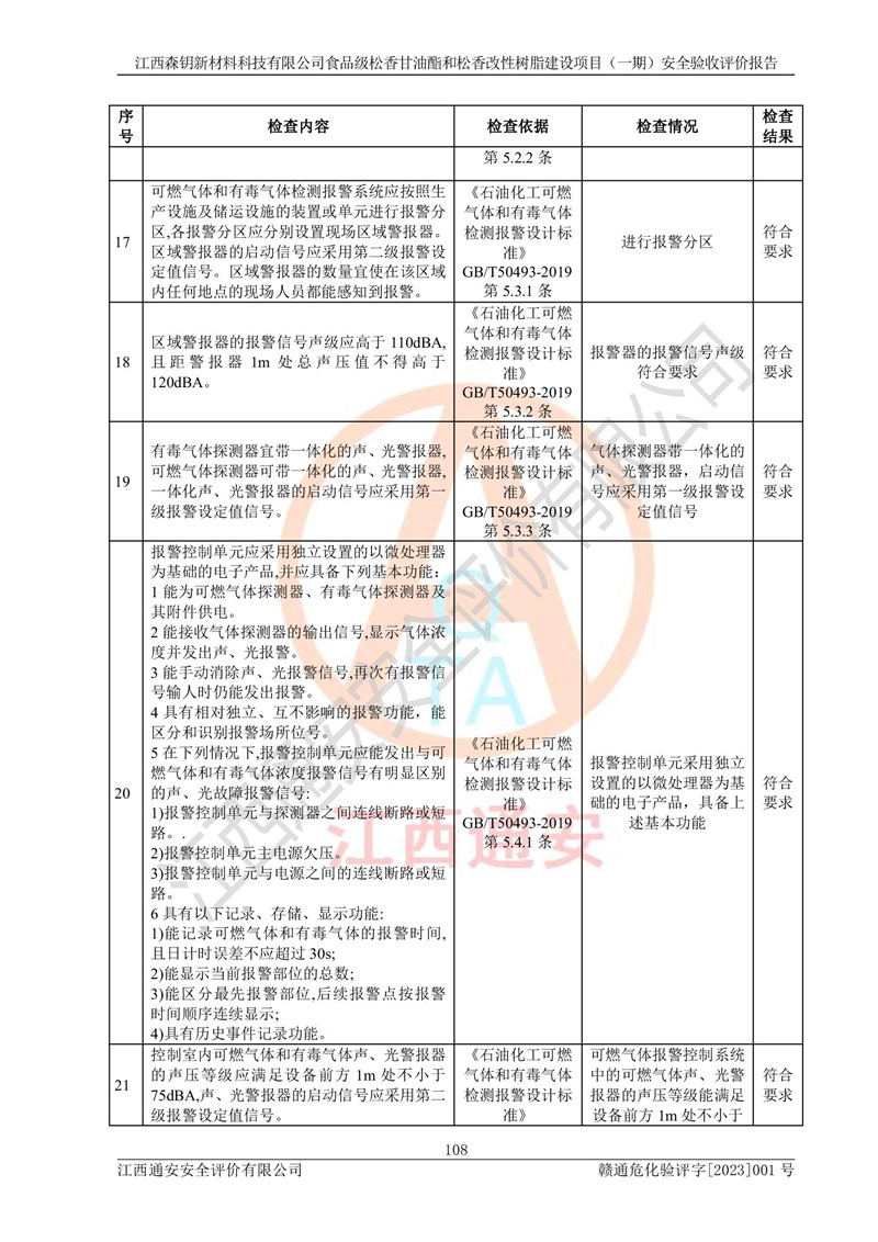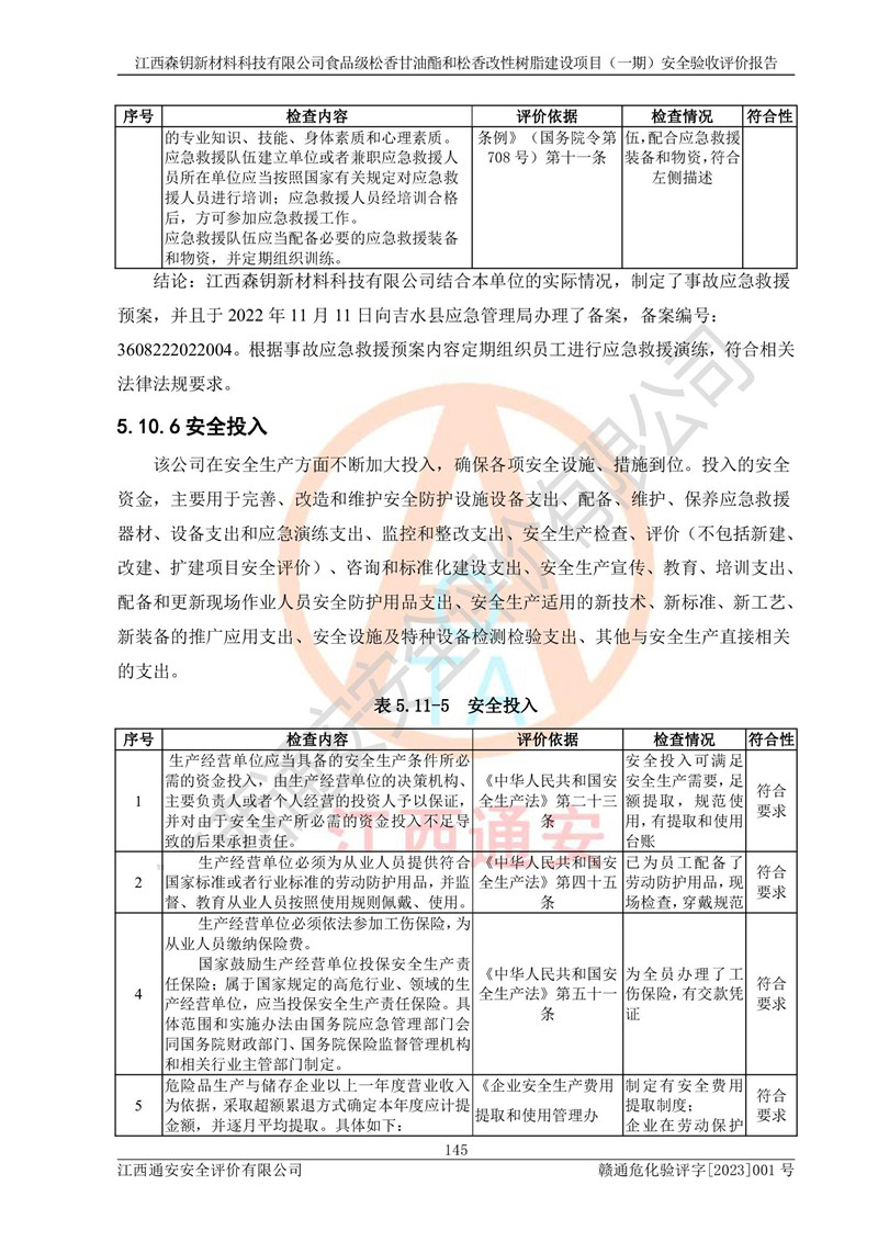 评价结论 | 本报告认为,江西森钥新材料科技有限公司食品级松香甘油酯和松香改性树脂建设项目(一期)生产装置现场情况与设计图纸一致,安全设施及安全管理符合**及有关部门关于安全生产法律、法规、标准的要求,安全风险程度是可以接受的,安全风险可控,符合安全生产条件,能够满足安全生产的要求,具备安全设施“三同时”验收条件。 | ||||