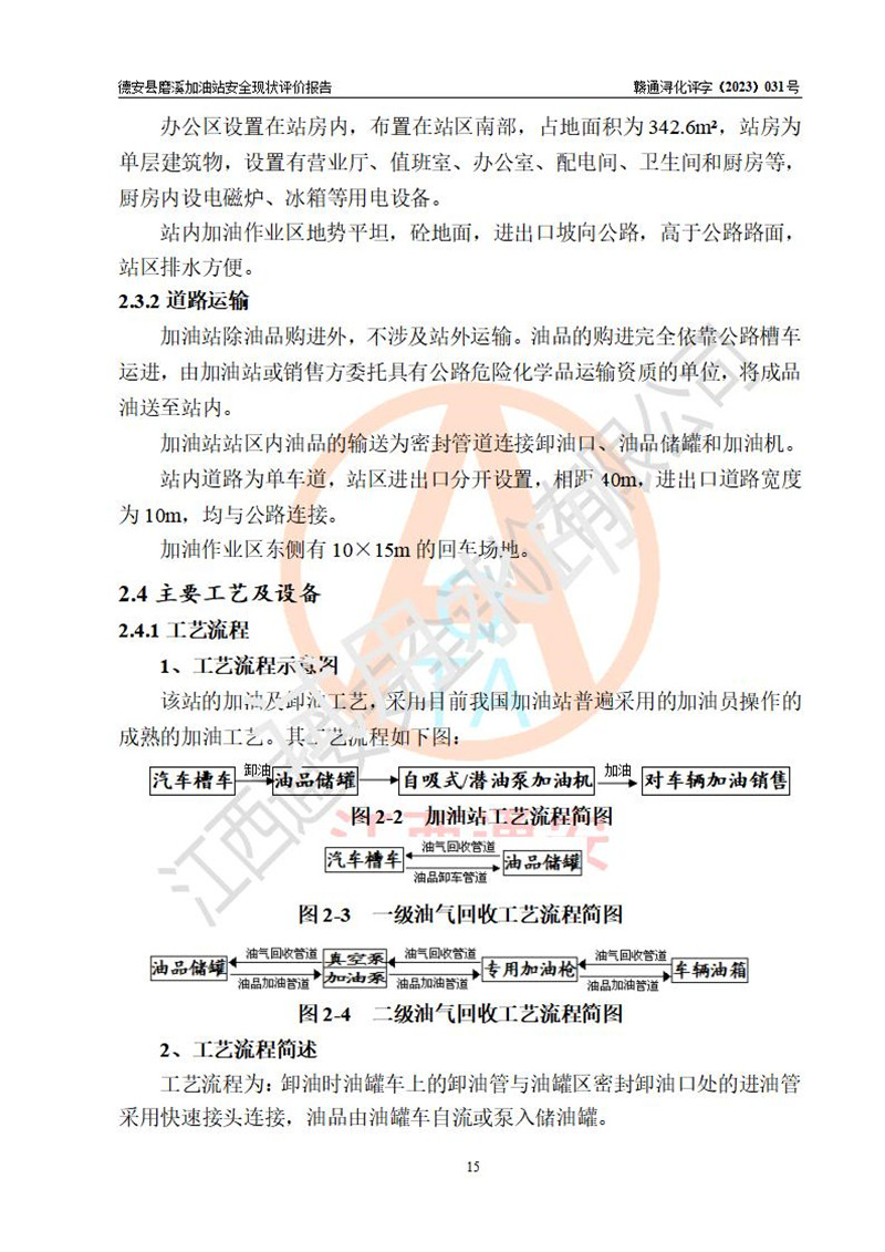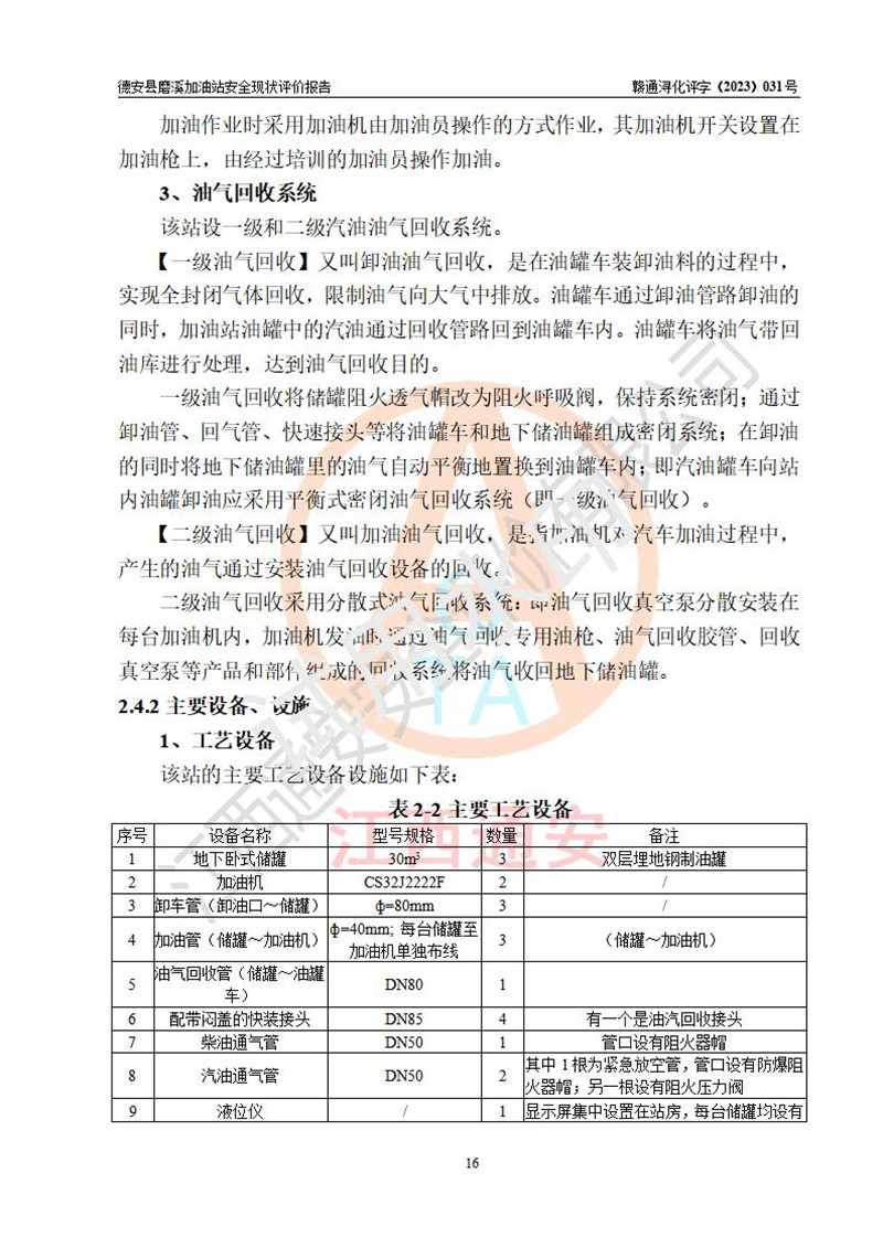 项目简介 | 德安县磨溪加油站是一家专门从事成品油零售经营的个人独资企业,经营场所位于九江市德安县磨溪乡。现有从业人员2名,其中安全管理人员1人,加油站负责人肖文斌。 该加油站占地面积约1491.3m2,站区内设置有2台税控燃油加油机及配套的工艺管线,设有SF双层储罐3台,其中30m3的92#汽油储罐1台、30m3的95#汽油储罐1台、30m3的0#柴油储罐1台,油品储罐总容积为90m3(折算成汽油为75m3),按现行《汽车加油加气加氢站技术标准》对加油站的等级划分原则,属三级加油站。 该站由九江市应急管理局换发《危险化学品经营许可证》(证号:赣九危化经字[2020]000105号),**期限2020年07月24日至2023年07月23日。 | |||