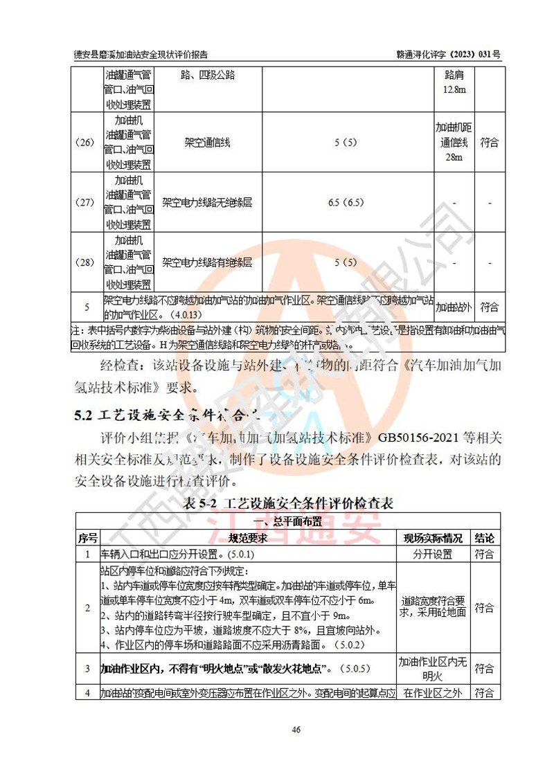 评价结论 | 德安县磨溪加油站涉及的安全条件、安全经营条件、安全生产管理符合《危险化学品经营许可证管理办法》、《汽车加油加气加氢站技术标准》等**有关法规、标准、规范要求,能满足危险化学品经营安全条件。 | |||
